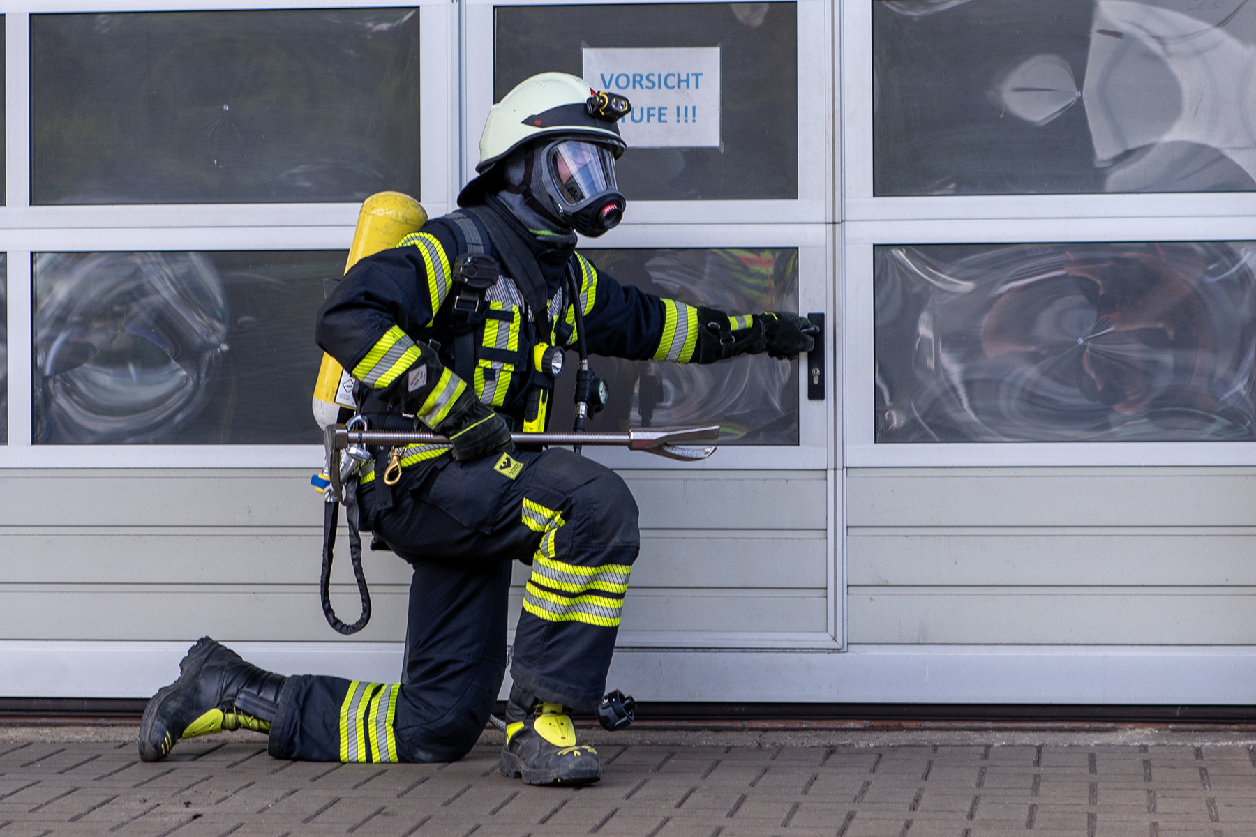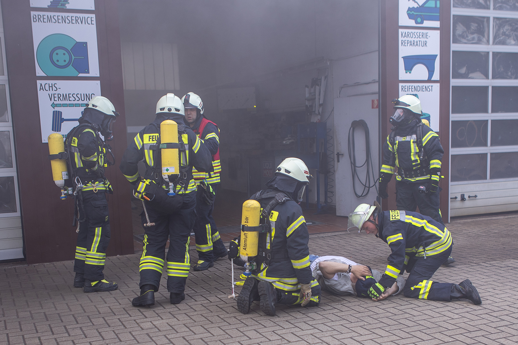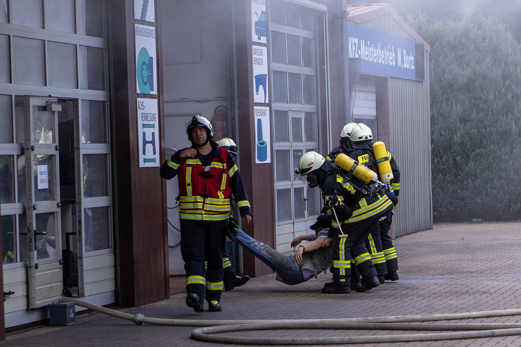 Vor Ort bot sich den insgesamt 102 Feuerwehrkräften eine im ersten Augenblick recht unübersichtliche Lage. Durch die mutmaßliche Verpuffung waren Betonteile durch die Luft geschleudert worden und hatten eine Person unter sich begraben, die durch die Feuerwehrkräfte schnell und gut befreit sowie gerettet werden und an den Rettungsdienst übergeben werden konnten.
