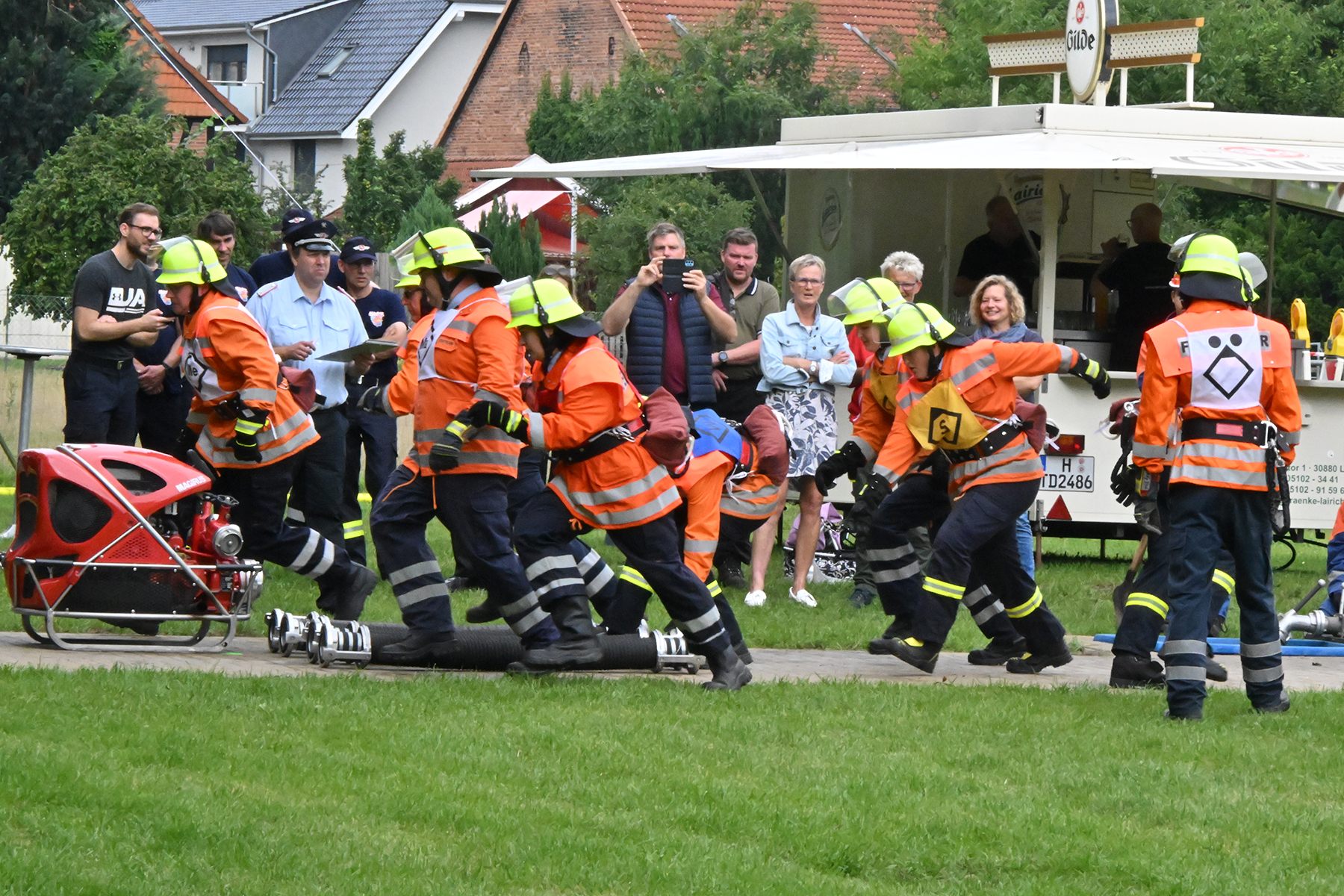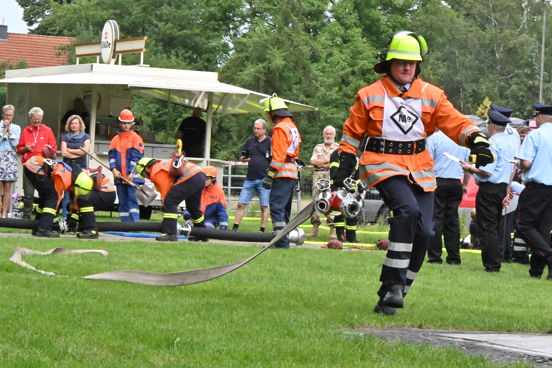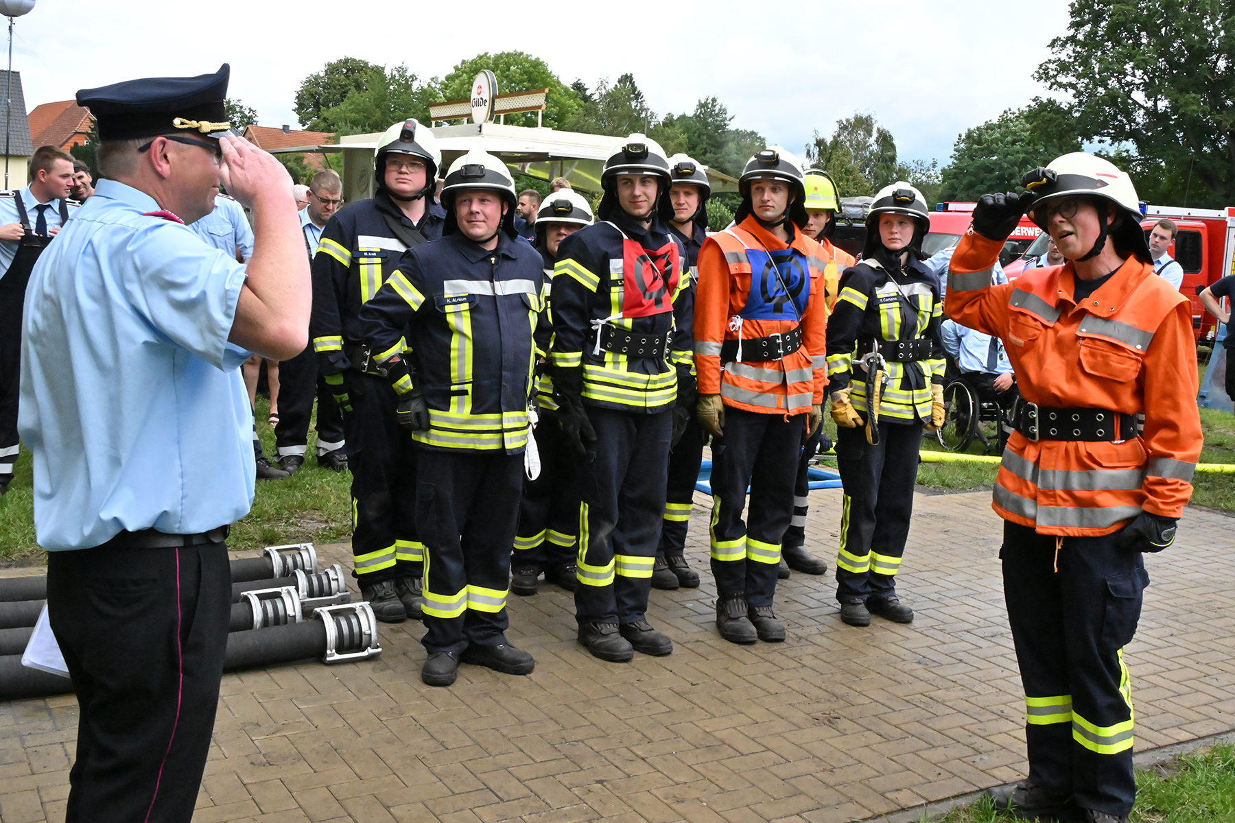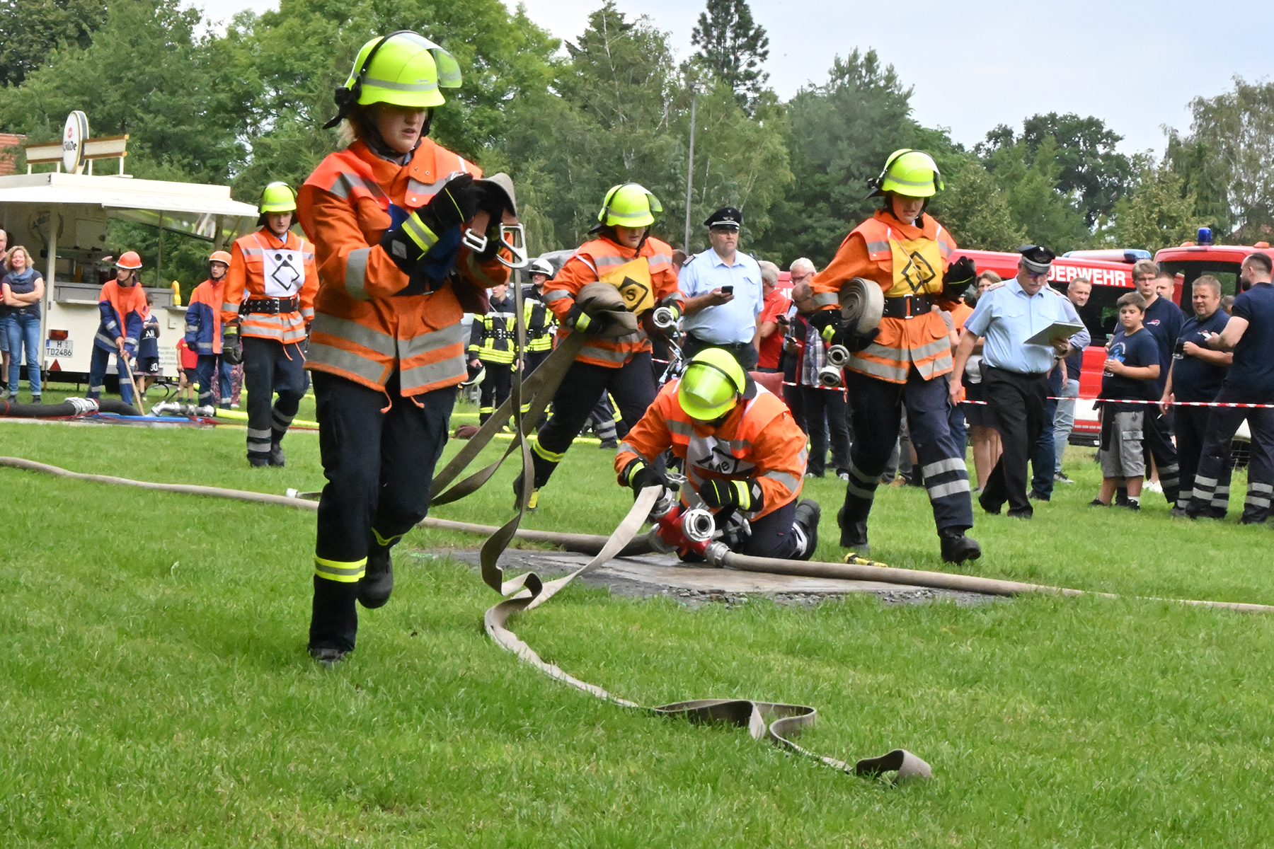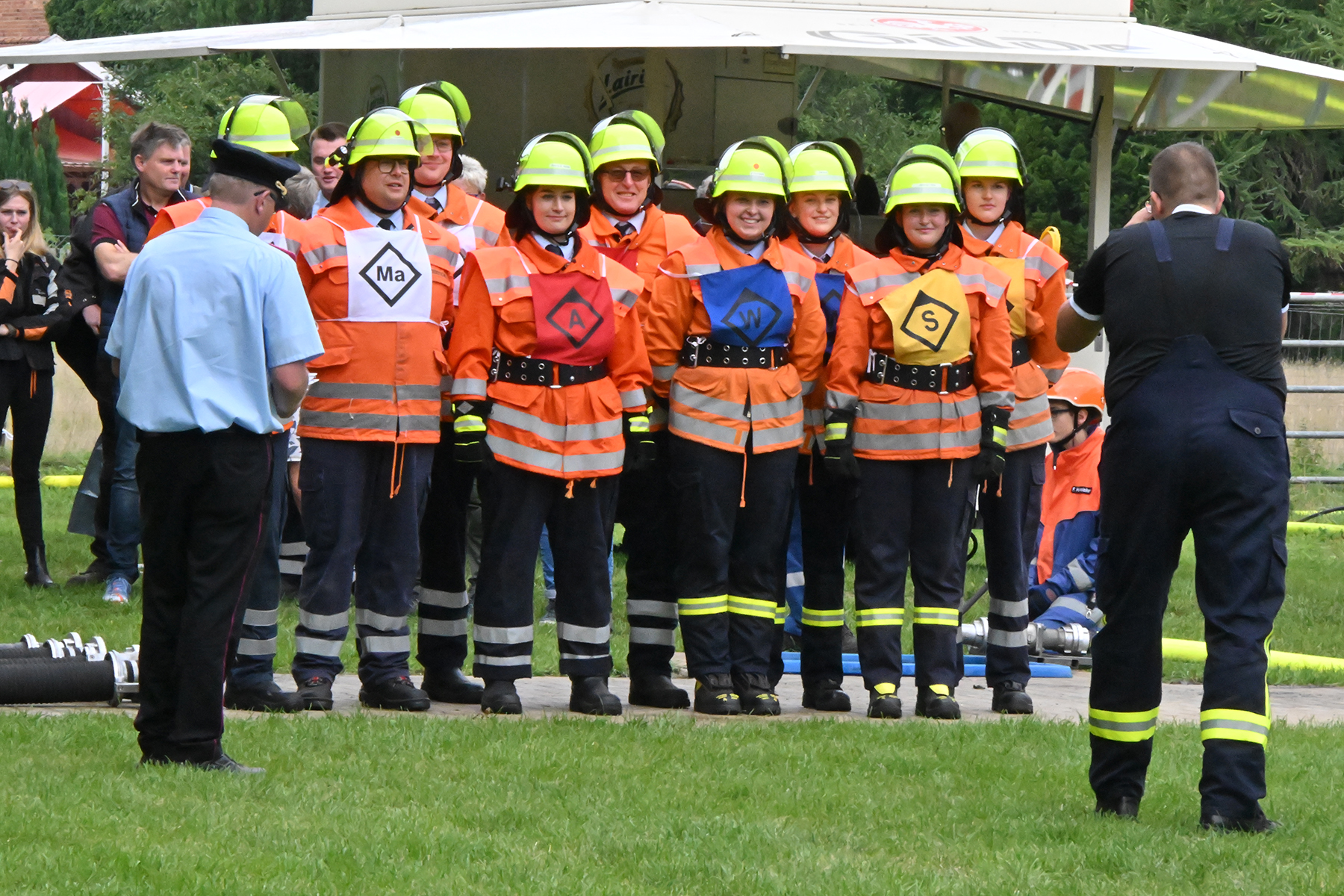 Dass der Spaß an erster Stelle stand, zeigte sich bei der letzten Wettkampfgruppe: Einer bunt durchmischten Gruppe aller teilnehmenden Ortsfeuerwehren, auch wenn Gruppenführerin Grit July diese beim Bahnleiter als "Wettkampfgruppe Weferlingsen" vorstelle. Damit hatte sie die Lacher auf ihrer Seite. "Aber auch egal", so Grit July. Die Unterstützung aller Zuschauer hatte diese Gruppe wie alle anderen Gruppen ebenso sicher.