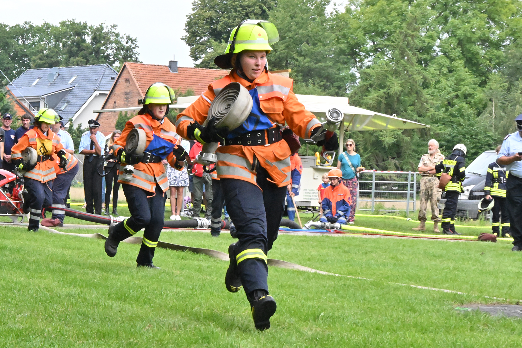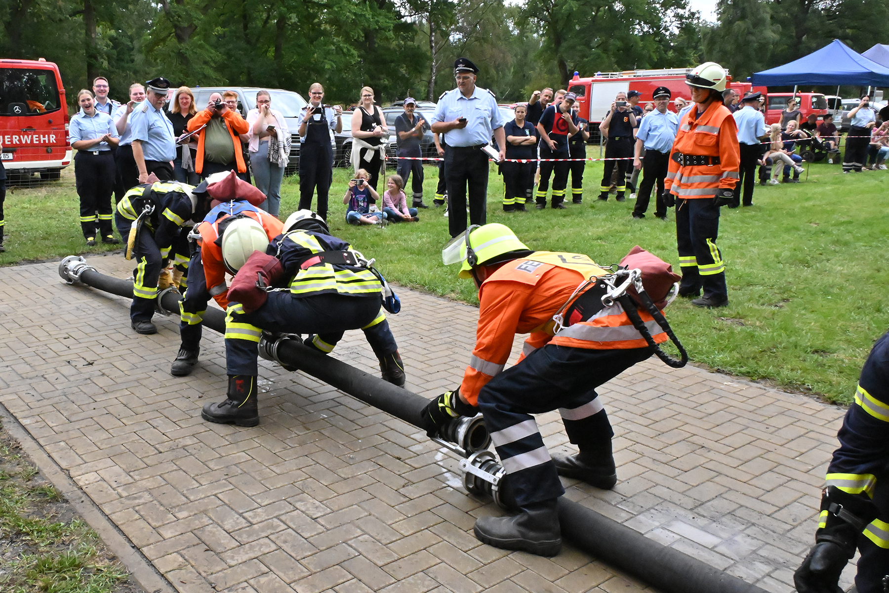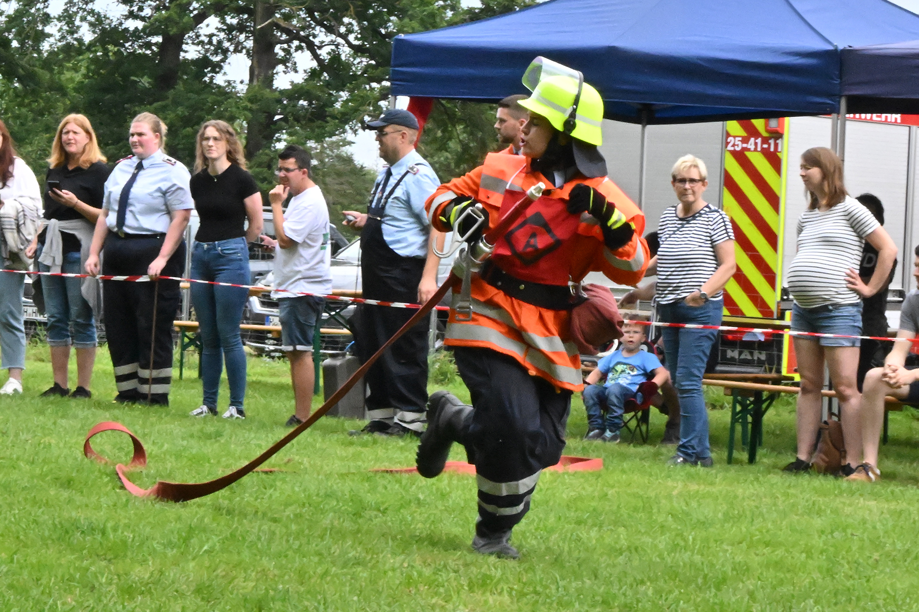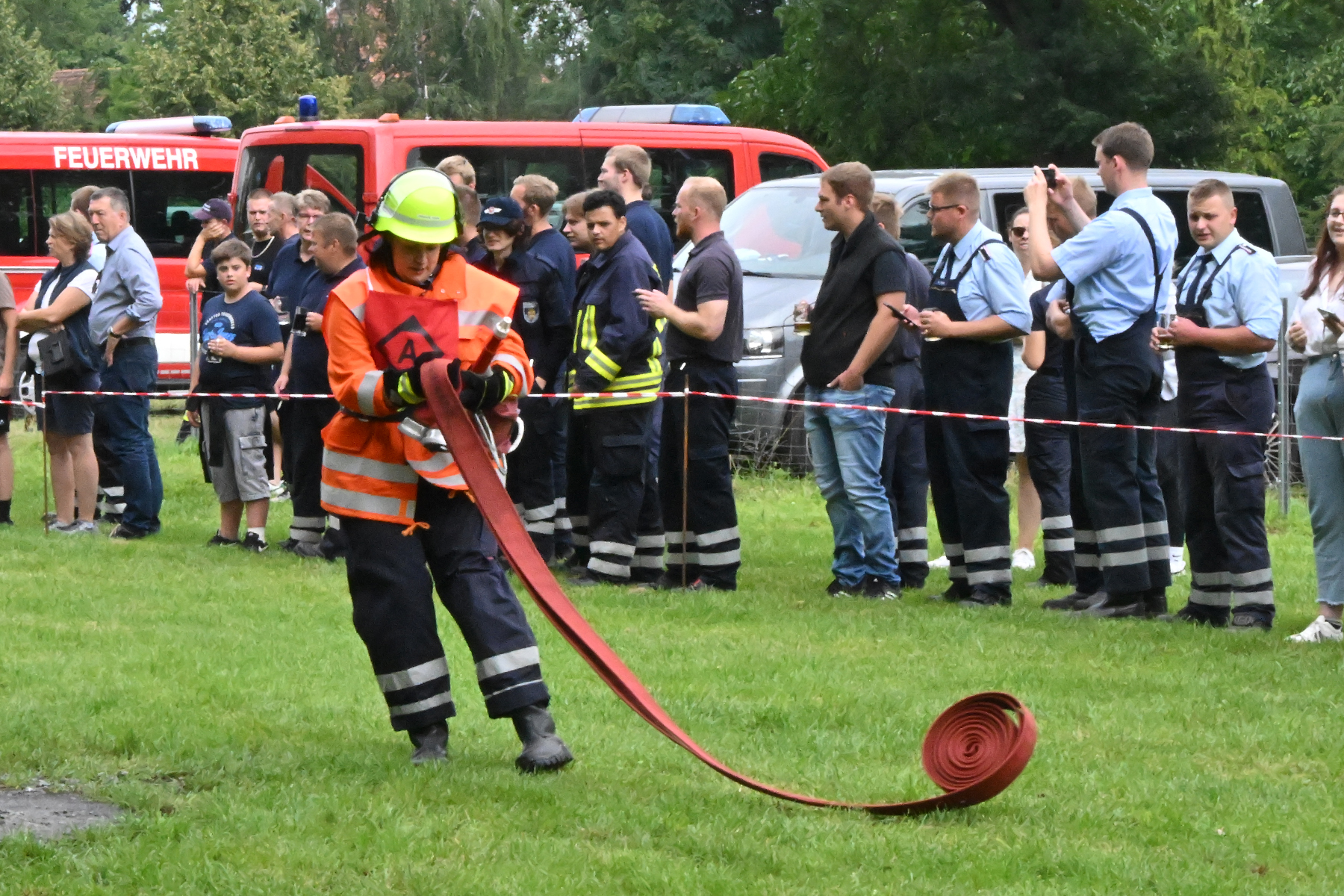 Dass der Spaß an erster Stelle stand, zeigte sich bei der letzten Wettkampfgruppe: Einer bunt durchmischten Gruppe aller teilnehmenden Ortsfeuerwehren, auch wenn Gruppenführerin Grit July diese beim Bahnleiter als "Wettkampfgruppe Weferlingsen" vorstelle. Damit hatte sie die Lacher auf ihrer Seite. "Aber auch egal", so Grit July. Die Unterstützung aller Zuschauer hatte diese Gruppe wie alle anderen Gruppen ebenso sicher.