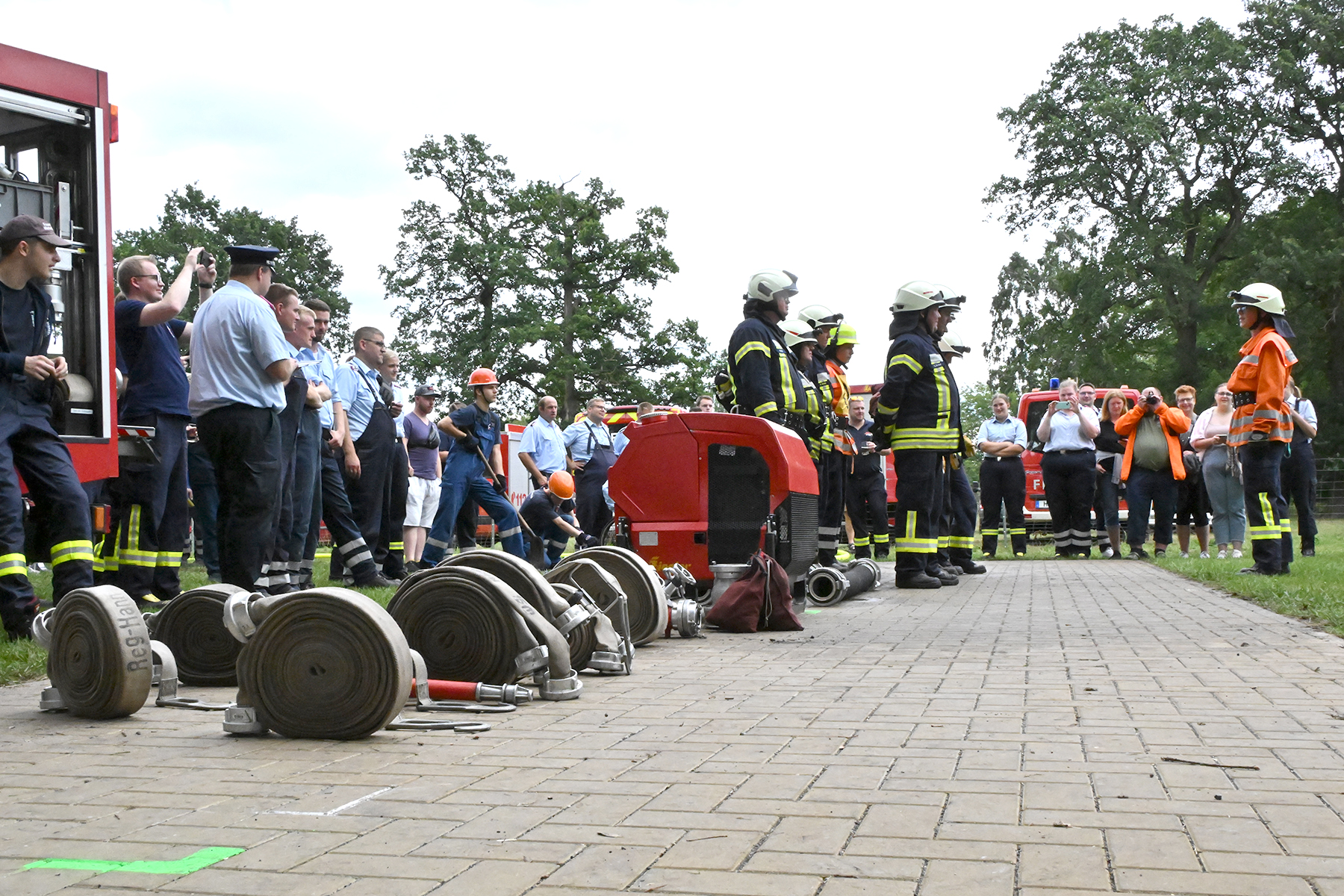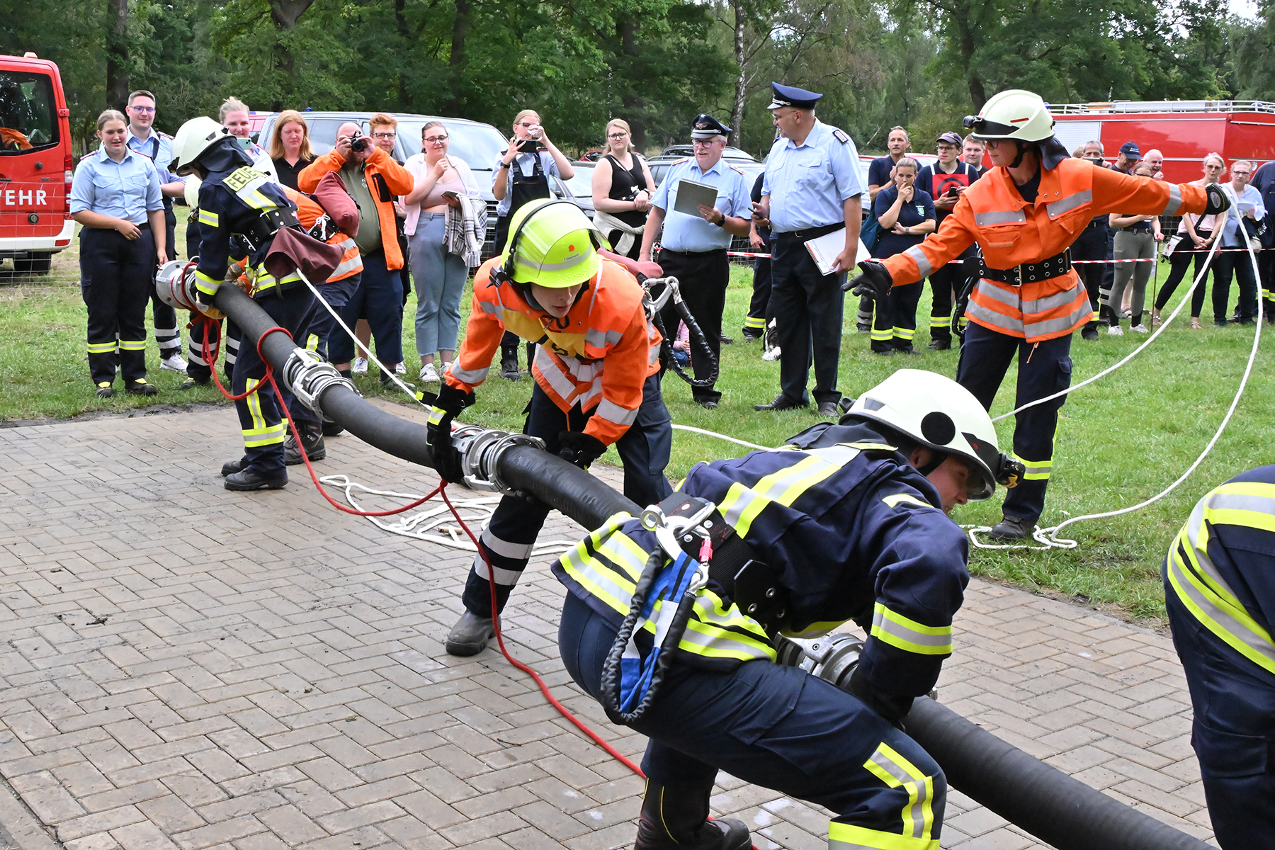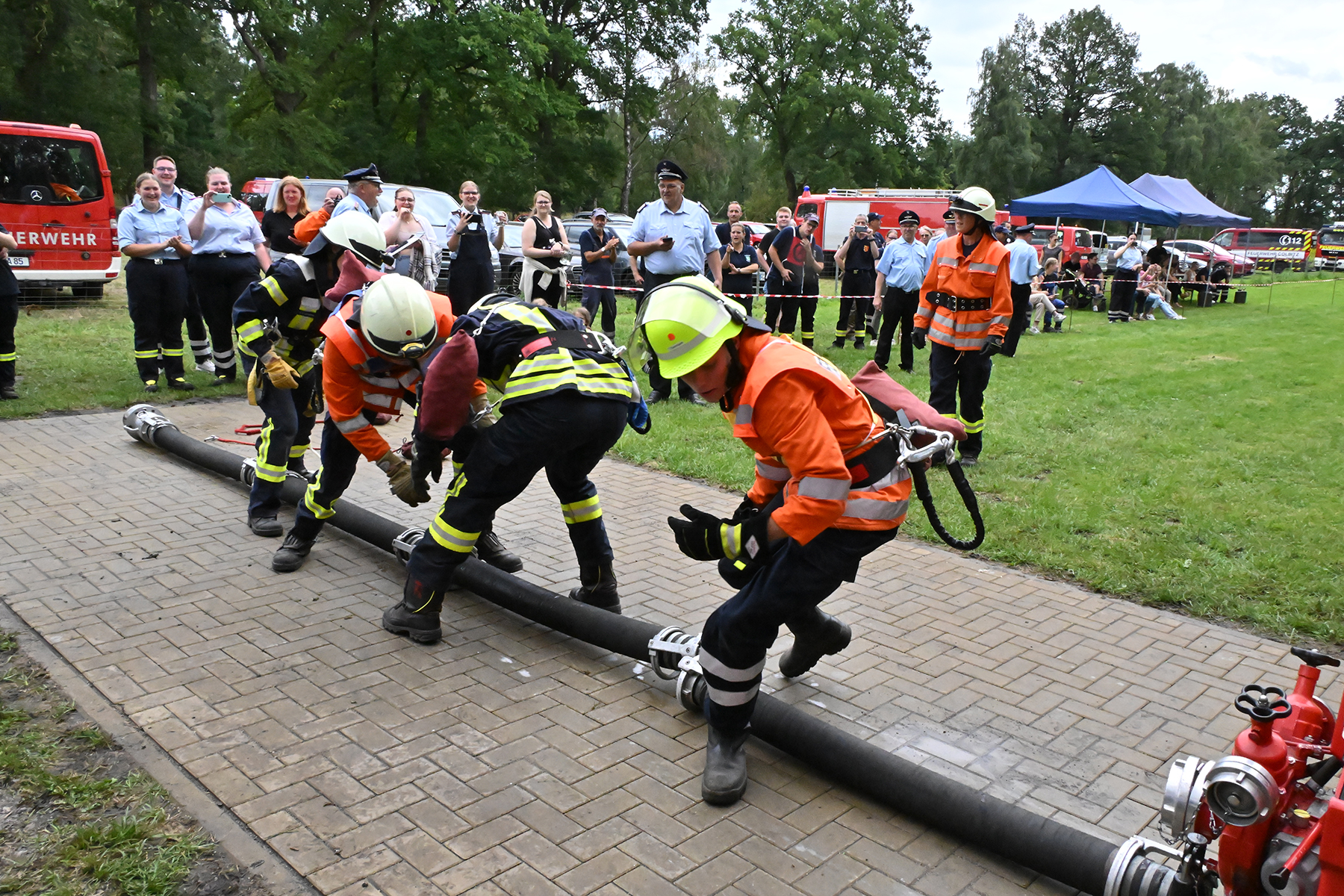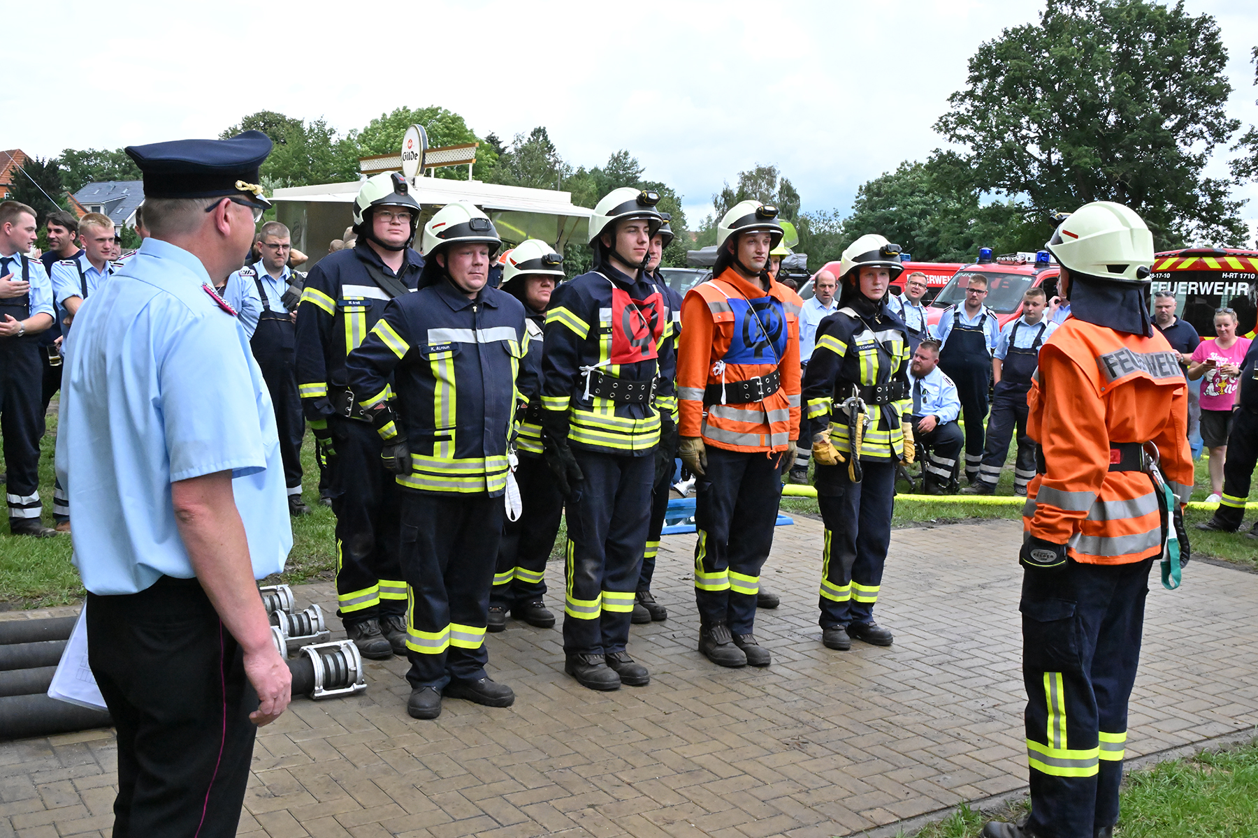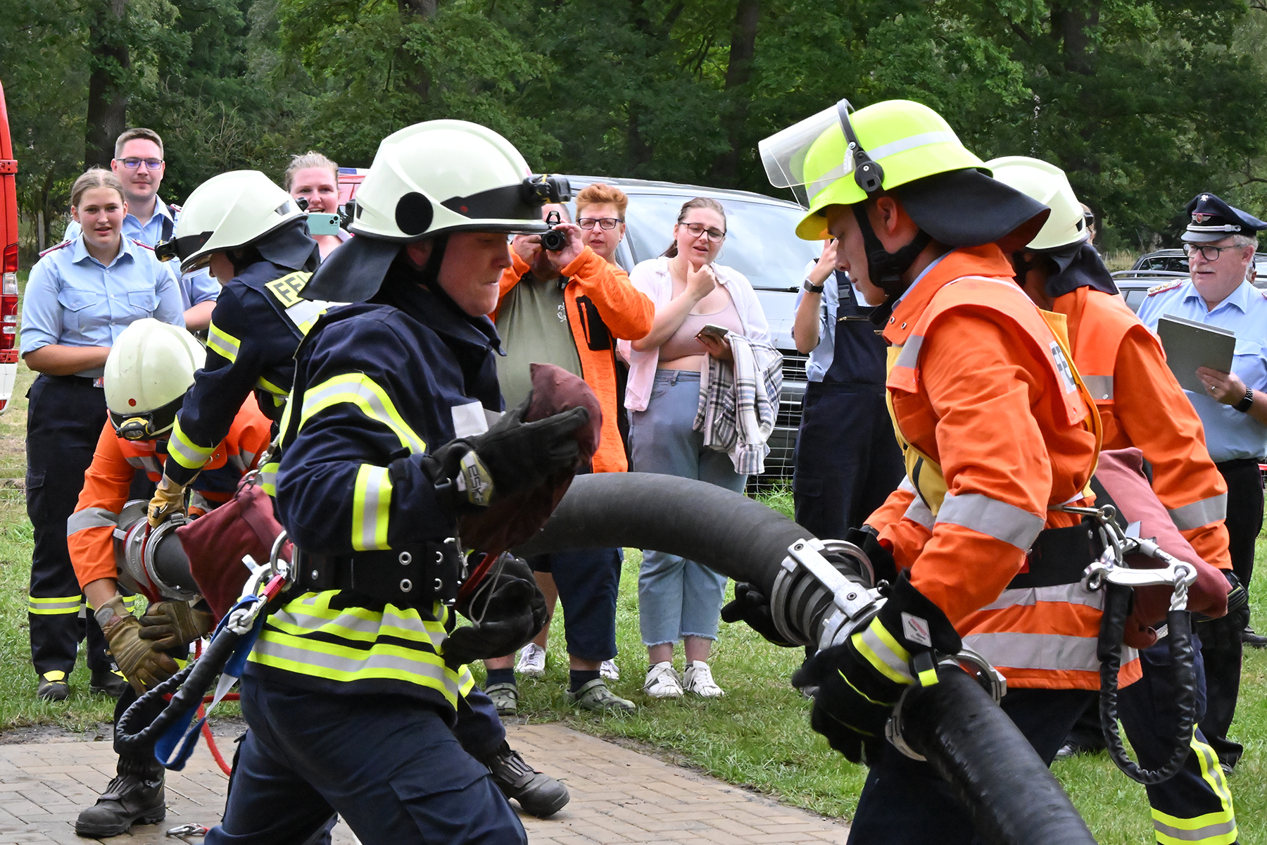 Dass der Spaß an erster Stelle stand, zeigte sich bei der letzten Wettkampfgruppe: Einer bunt durchmischten Gruppe aller teilnehmenden Ortsfeuerwehren, auch wenn Gruppenführerin Grit July diese beim Bahnleiter als "Wettkampfgruppe Weferlingsen" vorstelle. Damit hatte sie die Lacher auf ihrer Seite. "Aber auch egal", so Grit July. Die Unterstützung aller Zuschauer hatte diese Gruppe wie alle anderen Gruppen ebenso sicher.