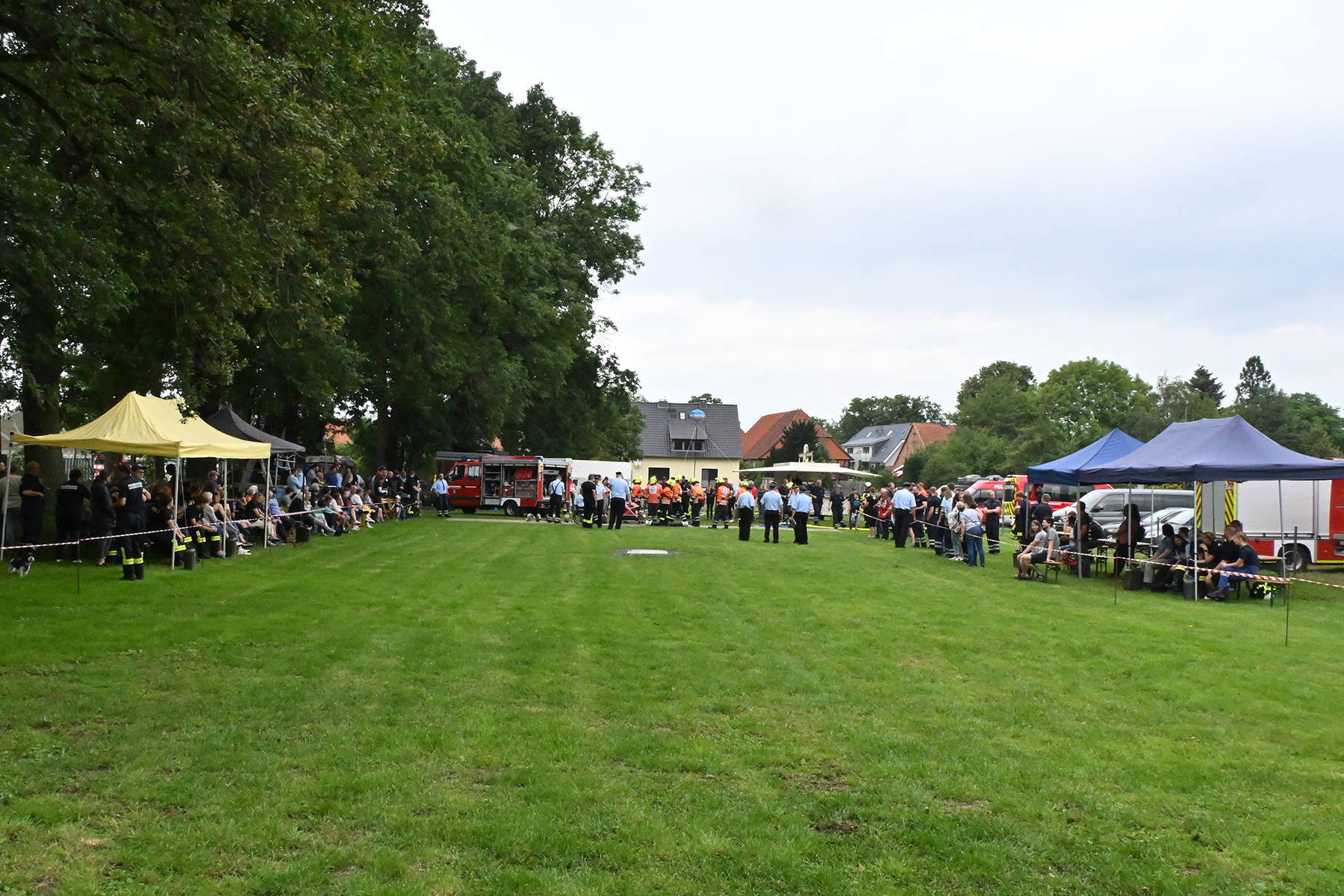 Am gestrigen Sonnabend schlossen sich dann die Wettkämpfe und die große Zeltparty an. 14 Wettkampfgruppen hatten sich zum Feuerwehrwettkampf angemeldet, der um 13 Uhr auf der Wettkampfbahn begann. Die Mitglieder der Ortsfeuerwehr hatten den Feuerwehrübungsplatz eigens von Grund auf erneuert. So schmückt dieser nun ein neues Tor und die Ablageplätze sind – dank der Unterstützung der Firma Degenhard – gepflastert worden.