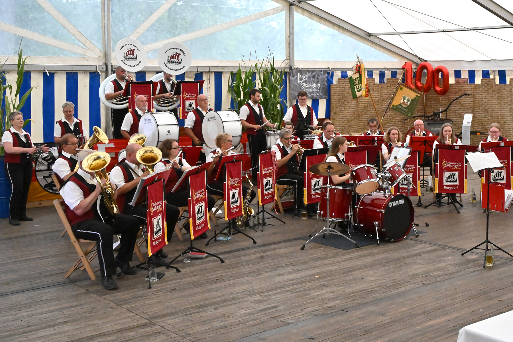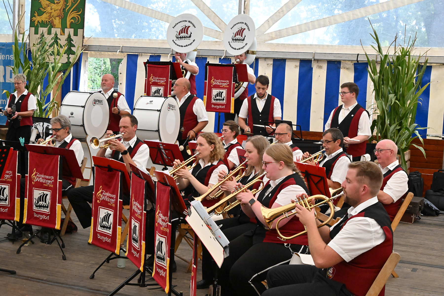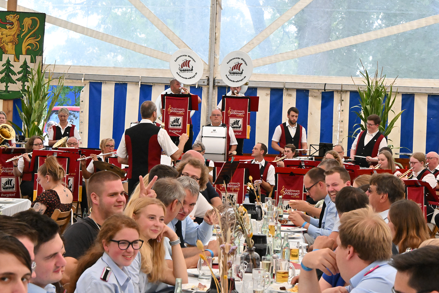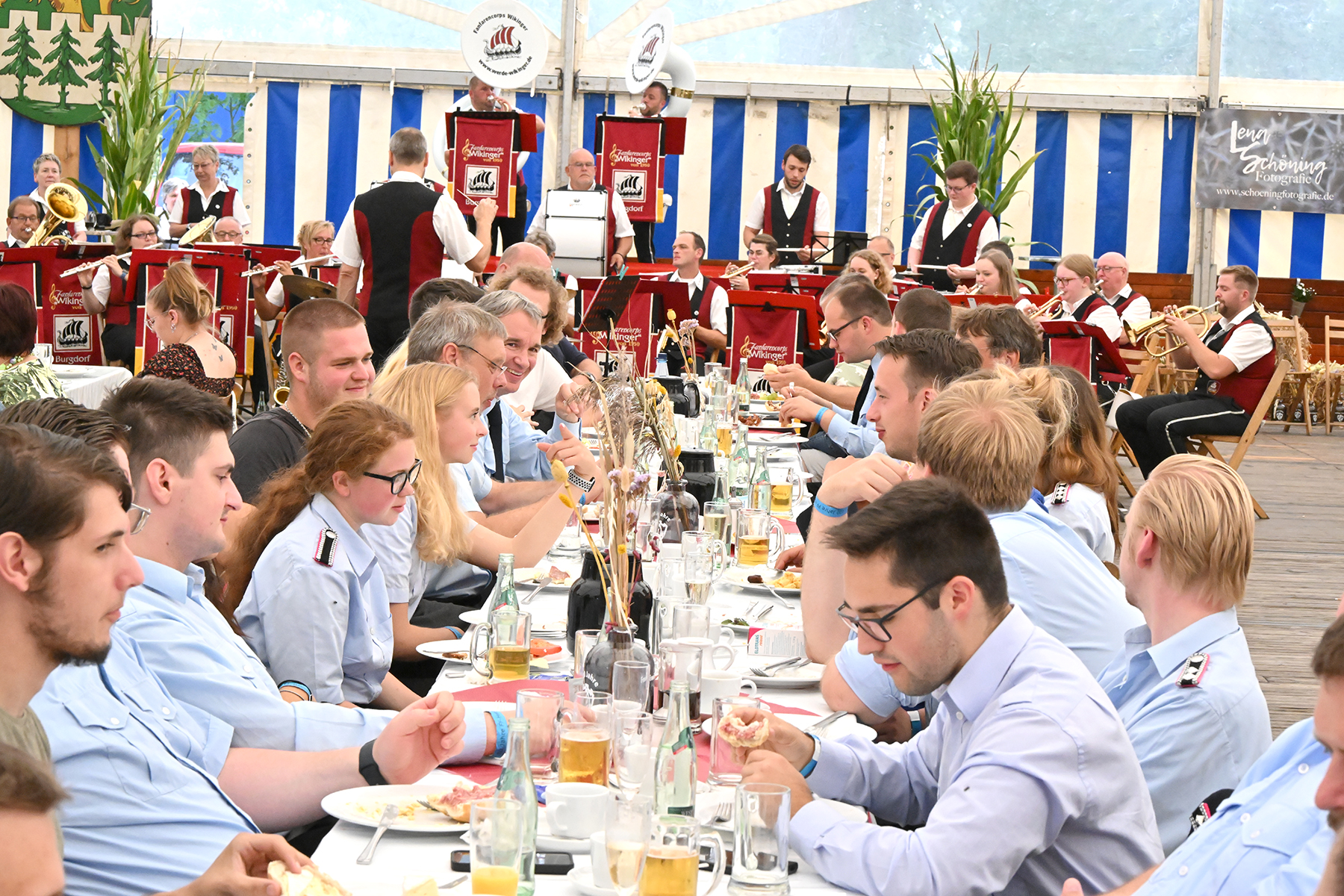 Zuvor hatte am heutigen Sonntag-Morgen ein Feldgottesdienst stattgefunden. Anschließend konnten rund 150 Gäste im Festzelt zum Burgfrühstück begrüßt werden, welches vom Fanfarencorps "Wikinger" Burgdorf musikalisch begleitet wurde.
