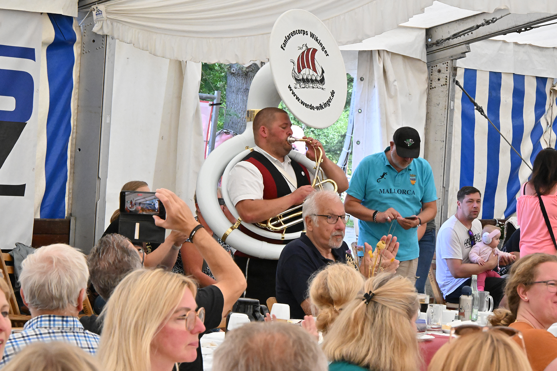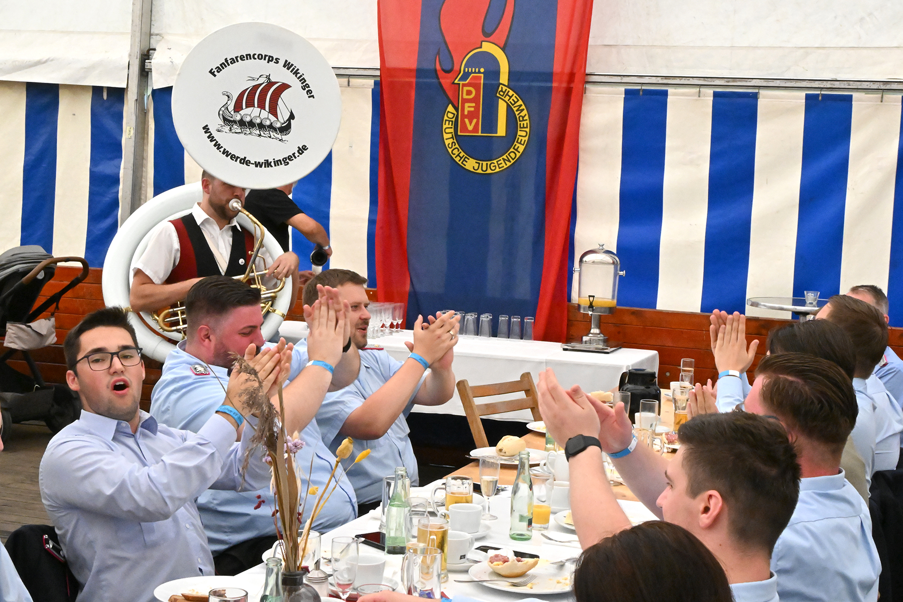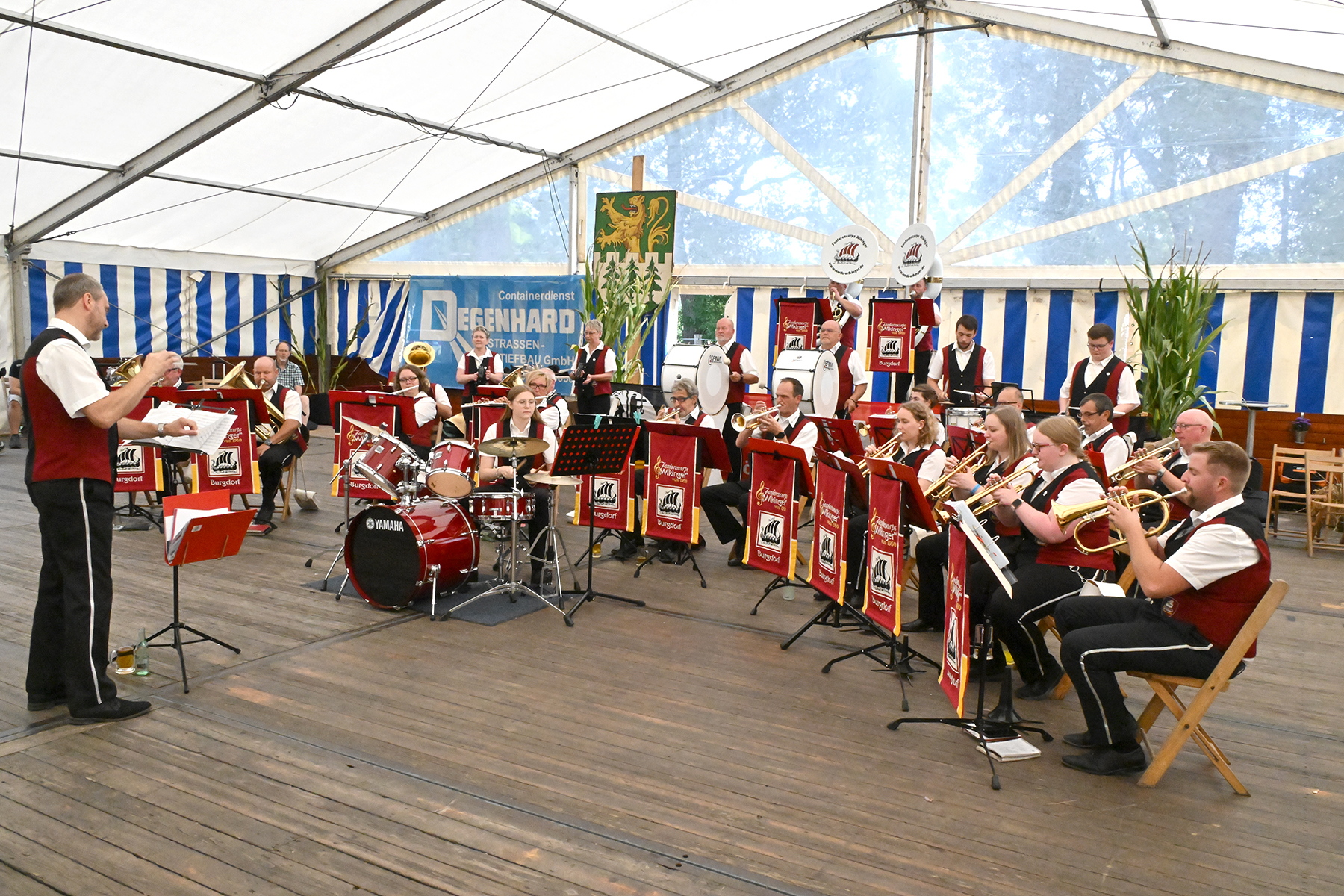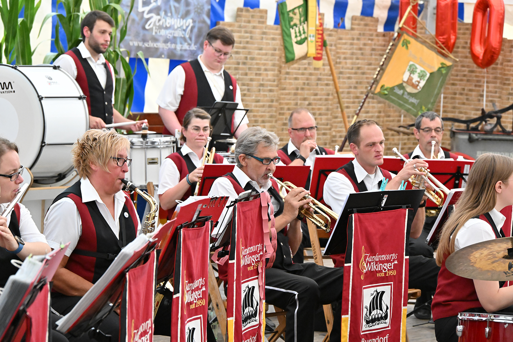 Zuvor hatte am heutigen Sonntag-Morgen ein Feldgottesdienst stattgefunden. Anschließend konnten rund 150 Gäste im Festzelt zum Burgfrühstück begrüßt werden, welches vom Fanfarencorps "Wikinger" Burgdorf musikalisch begleitet wurde.