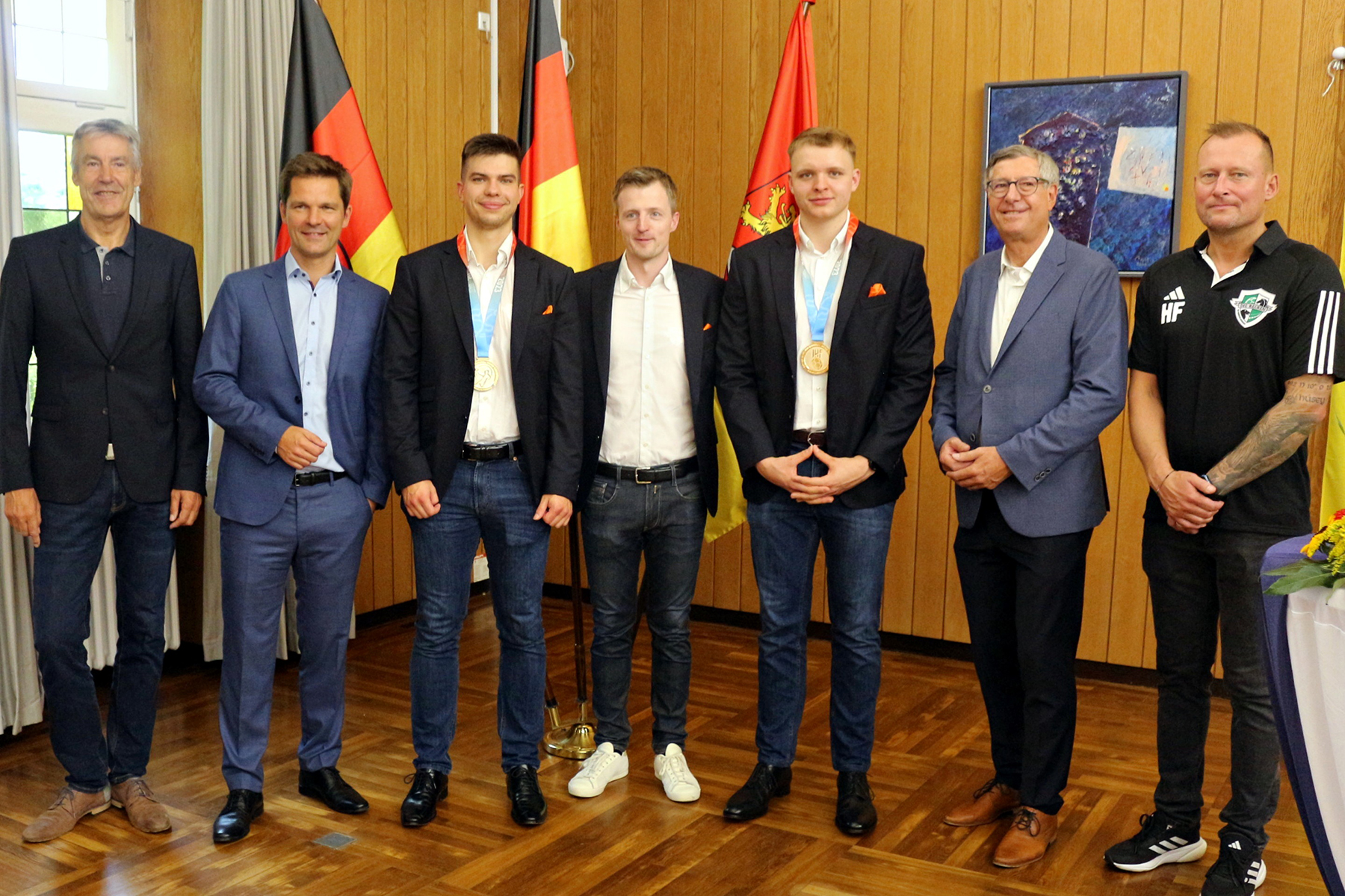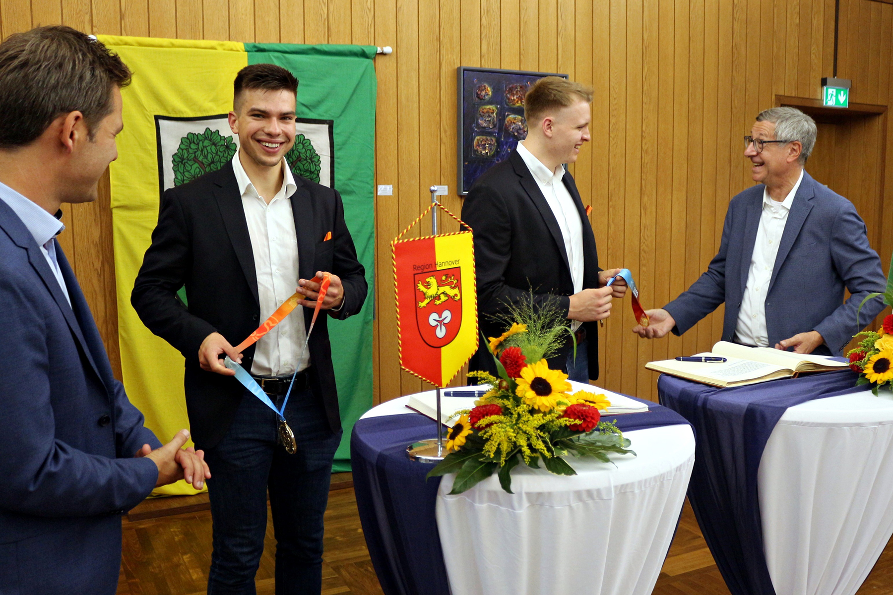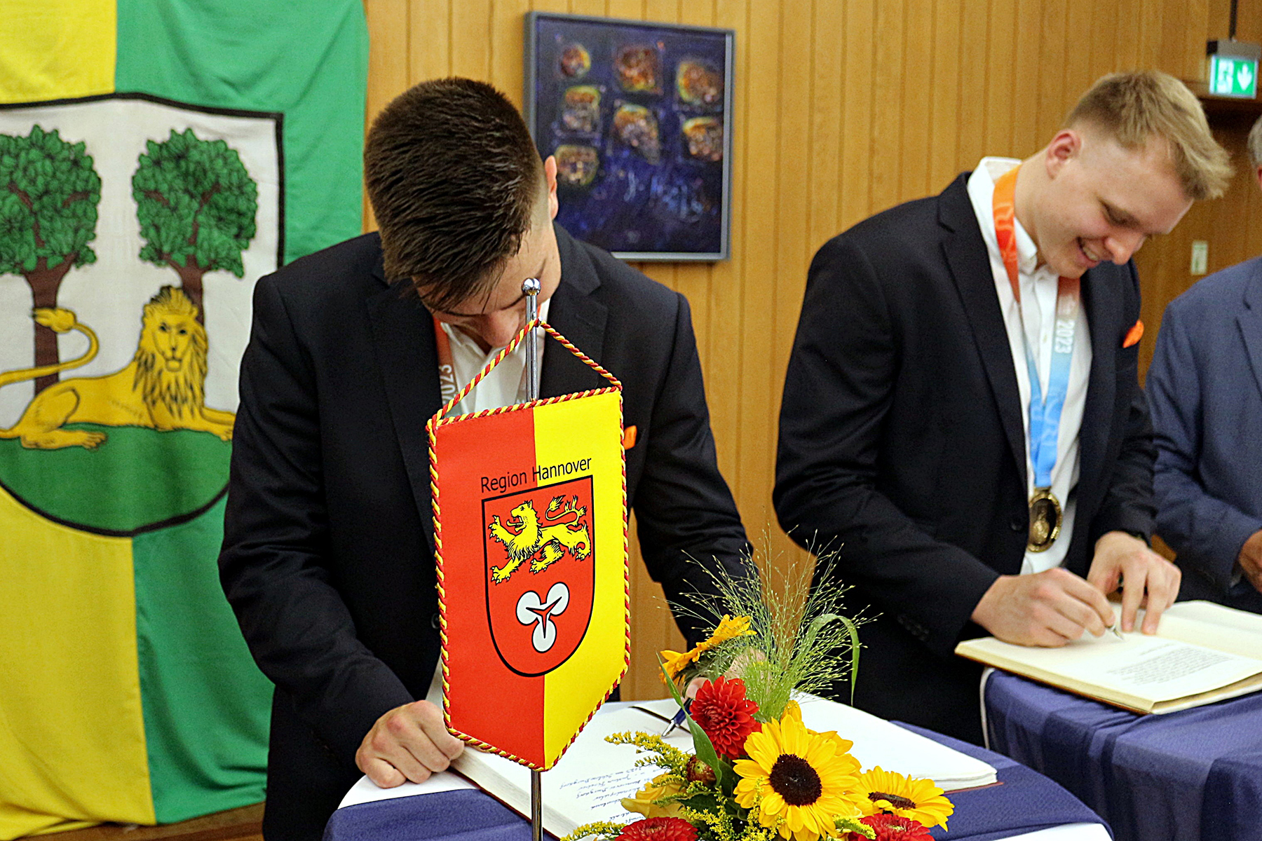 Als Anerkennung für diese großartige sportliche Leistung, ließen die Bitten um einen Eintrag in gleich drei Goldene Bücher nicht lange auf sich warten. Neben der Stadt Hannover, hatten auch die Region und die Stadt Burgdorf ihre Folianten für die Signaturen der beiden Recken-"Youngster" aufgeschlagen. Dieser Ehrenakt fand am gestrigen Freitag, 18. August 2023, im Burgdorfer Schloss am Spittaplatz statt.