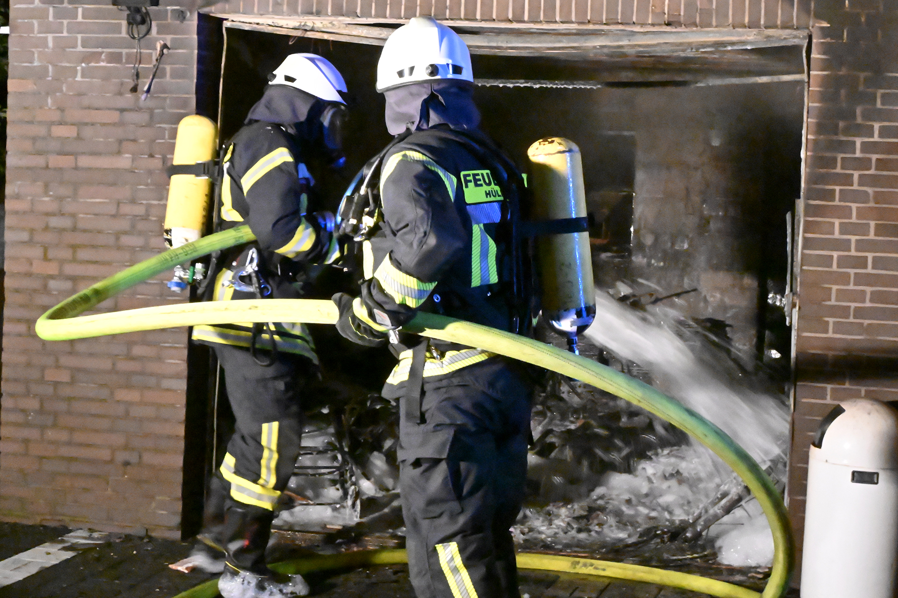 Durch den Außenangriff konnte eine Ausbreitung der Flammen auf das Haus erfolgreich verhindert werden. Nachdem auch das Garagentor geöffnet werden konnte, konnte das Feuer auch im Innern effektiv bekämpft werden, sodass um 2:42 Uhr "Feuer aus" gemeldet werden konnte. Mit einer Wärmebildkamera wurde die Garage kontrolliert und schließlich mit Schaum abgelöscht. Über den Korb der Drehleiter wurde zudem der Giebel des Hauses auf Brandnester kontrolliert.