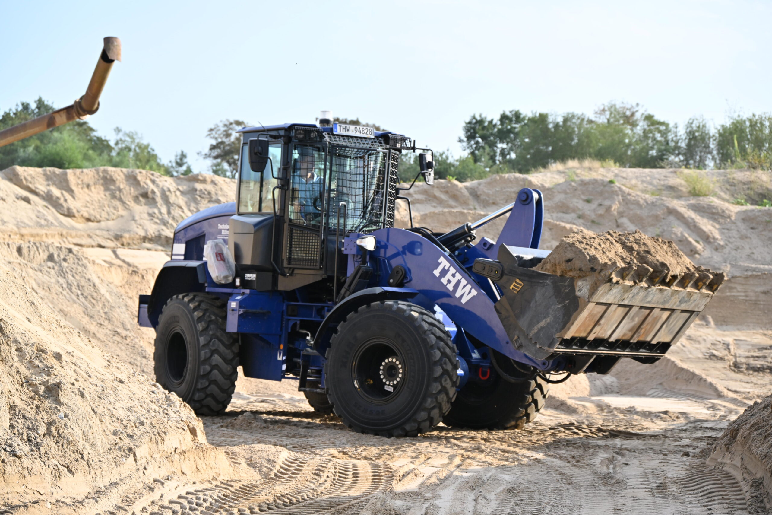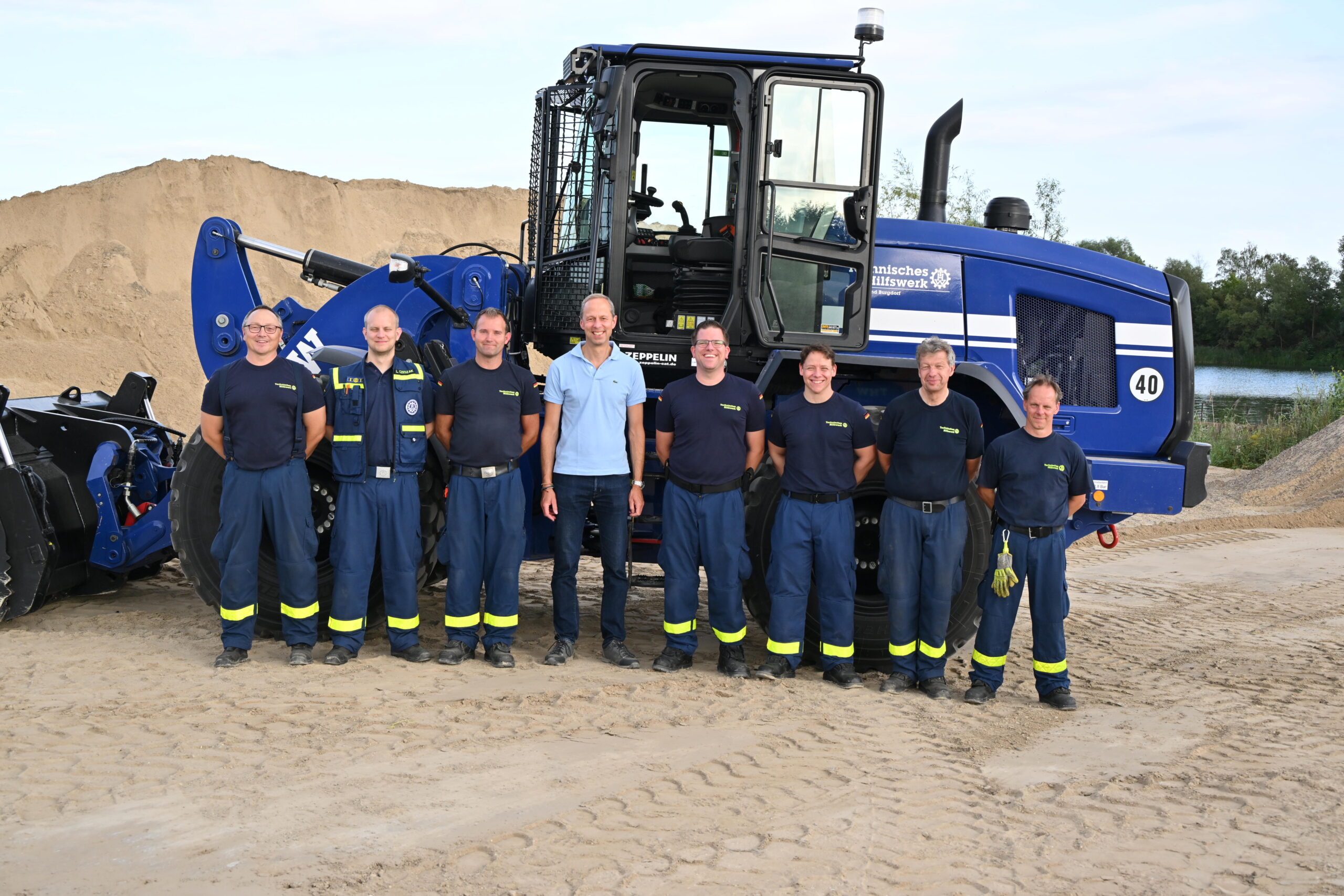 Auf dem Gelände führten der Ortsbeauftragte Lukas Czeszak sowie Gruppenführer Gerrit Schrader in den Radlader und seine Aufgaben ein. Dieser wird mit einem Lkw-Führerschein bewegt, zudem benötigen die Bediener des Gerätes einen Erdbaumaschinenführerschein.
