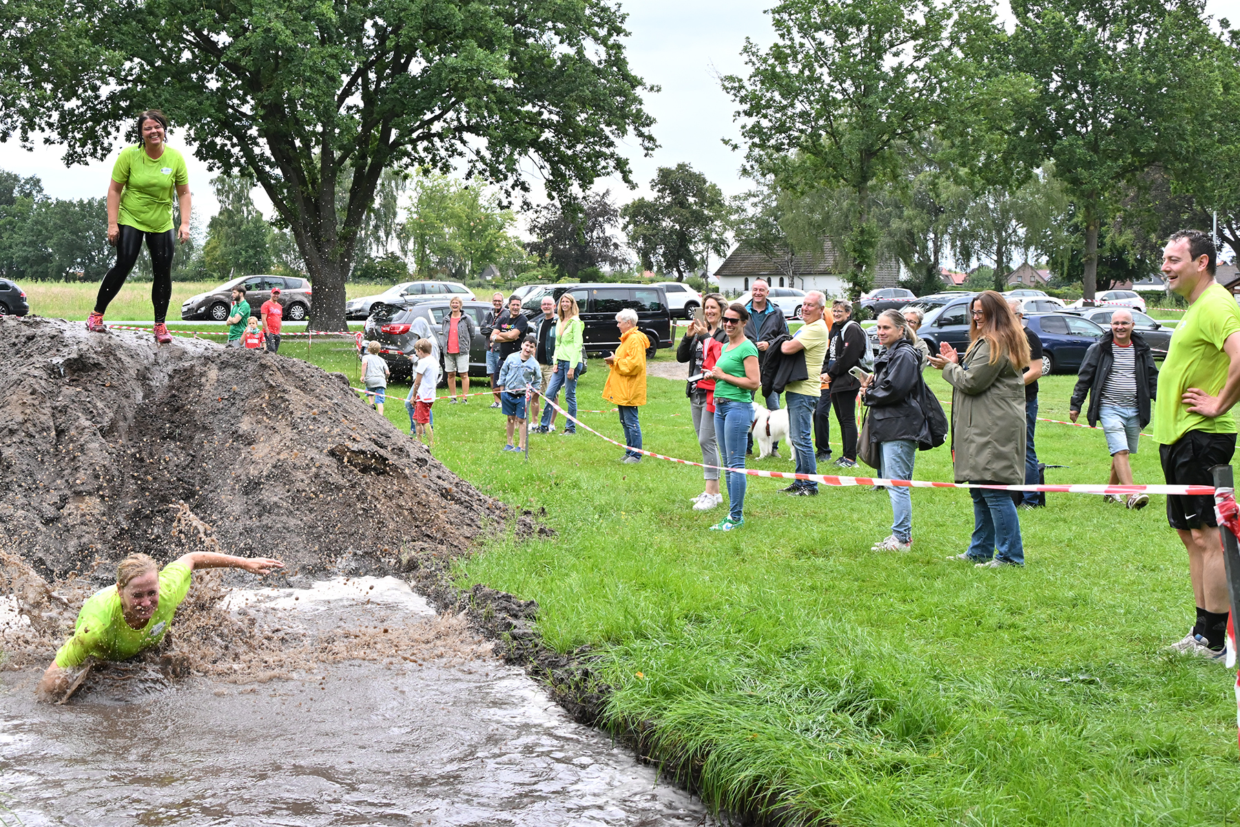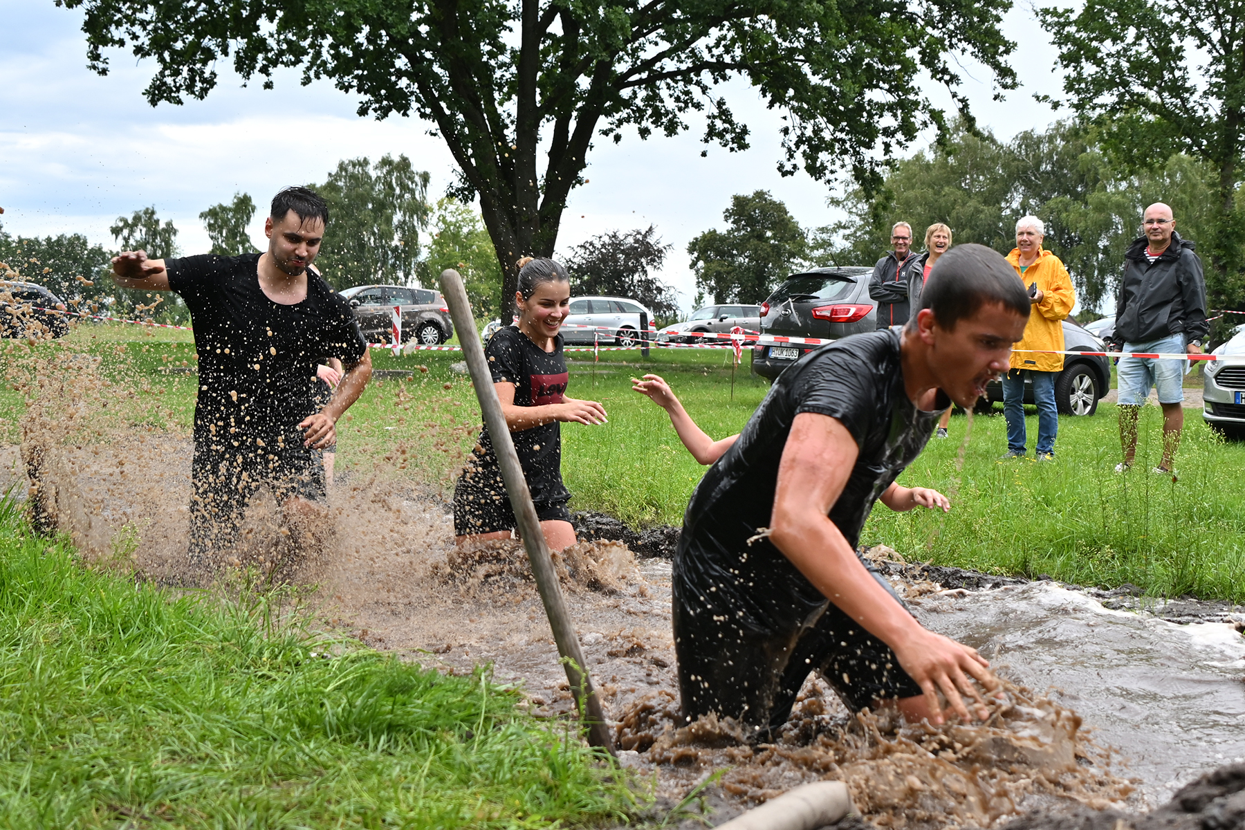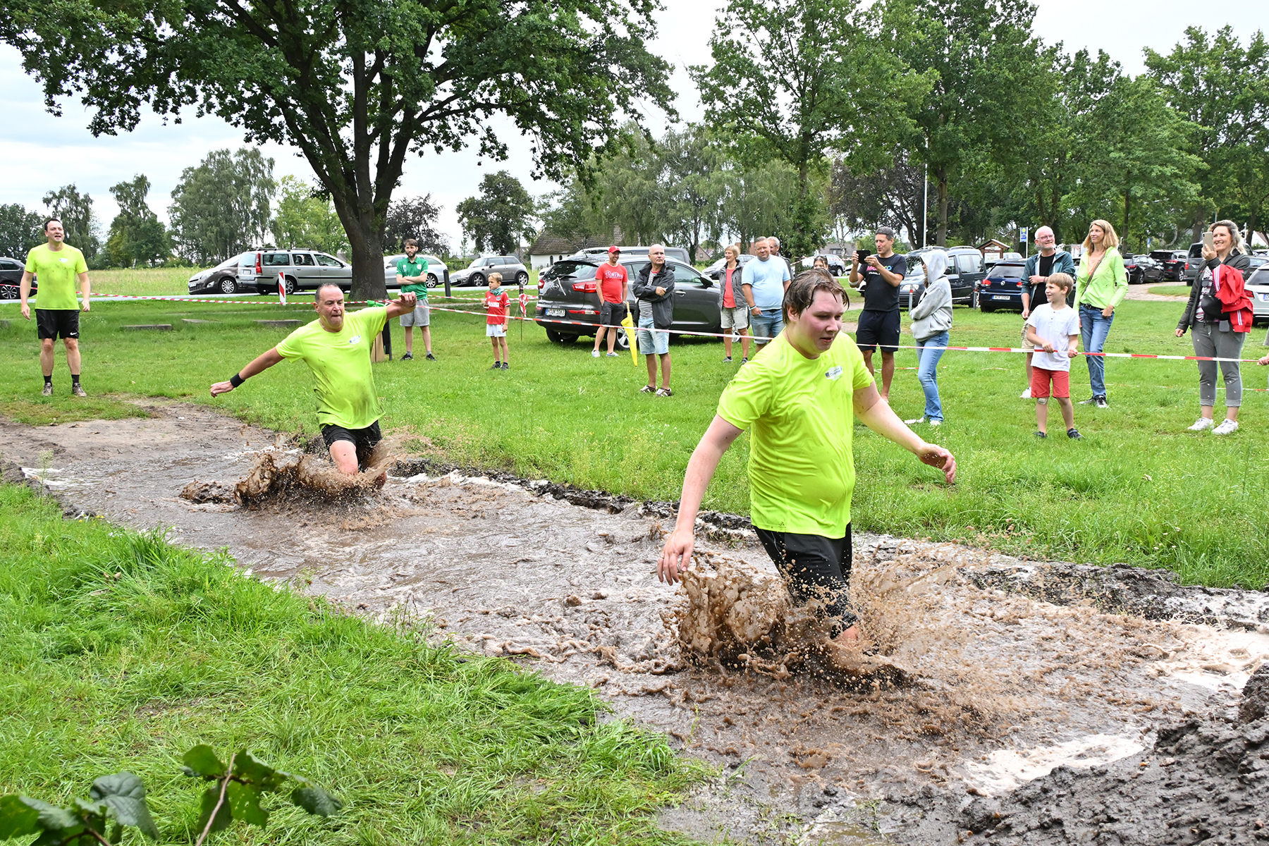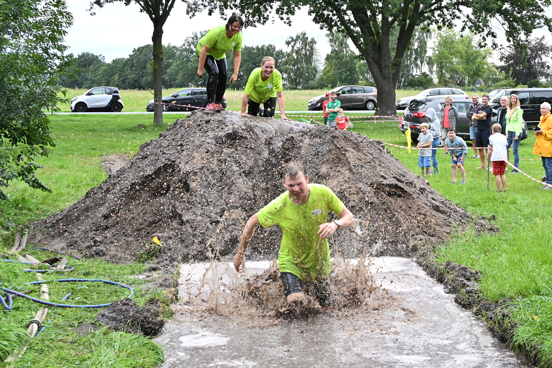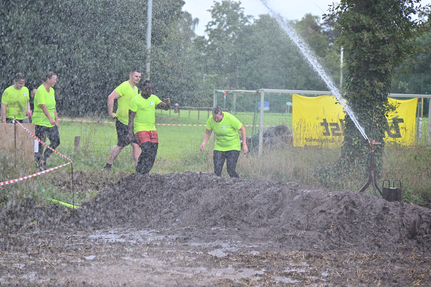 So ging es unter anderem durch zwei Wasserlöcher, eine Schlammkriechstrecke, durch den Hainholzbach, rutschend auf einem Hügel hinab sowie durch den mit Wasser gefüllten Soccercourt. "Wir haben uns vorher auch mit dem Ordnungsamt informiert", erklärt Sportwartin Elke Kistner. Das Wasser förderten die Mitglieder der Ortsfeuerwehr aus einem Brunnen, mit dem Wasser des Soccercourts wird nuin noch gegossen.