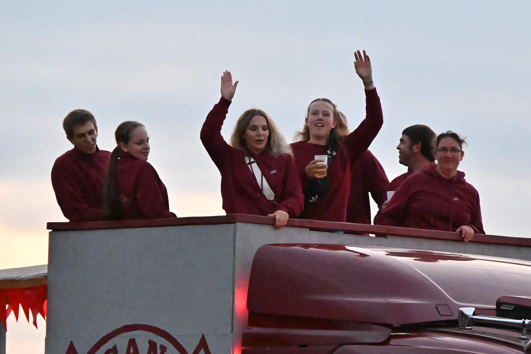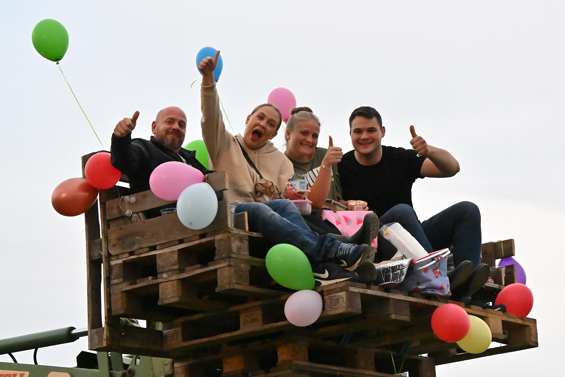 Wieder dabei war die Dorfgemeinschaft Schillerslage um Ortsbürgermeister Cord Reißer, die auf einem Wagen mit rund 30 Personen feierte, aber auch Besucher mit exponierten – sprich: in luftiger Höhe – befindlichen Plattformen nebst Sofas, einer ganzen Wohnzimmereinrichtung oder aber einem Aufsitzrasenmäher. Mit letzterem waren Kristin und Nadine aus Schillerslage gekommen. "Wenn ich groß bin, werde ich ein Fendt!", ließ die Aufschrift auf dem Heck wissen. Ebenso hatten es sich Boris und Thomas, nach eigenen Angaben "Rock-Legenden", auf Liegestühlen gemütlich gemacht.
