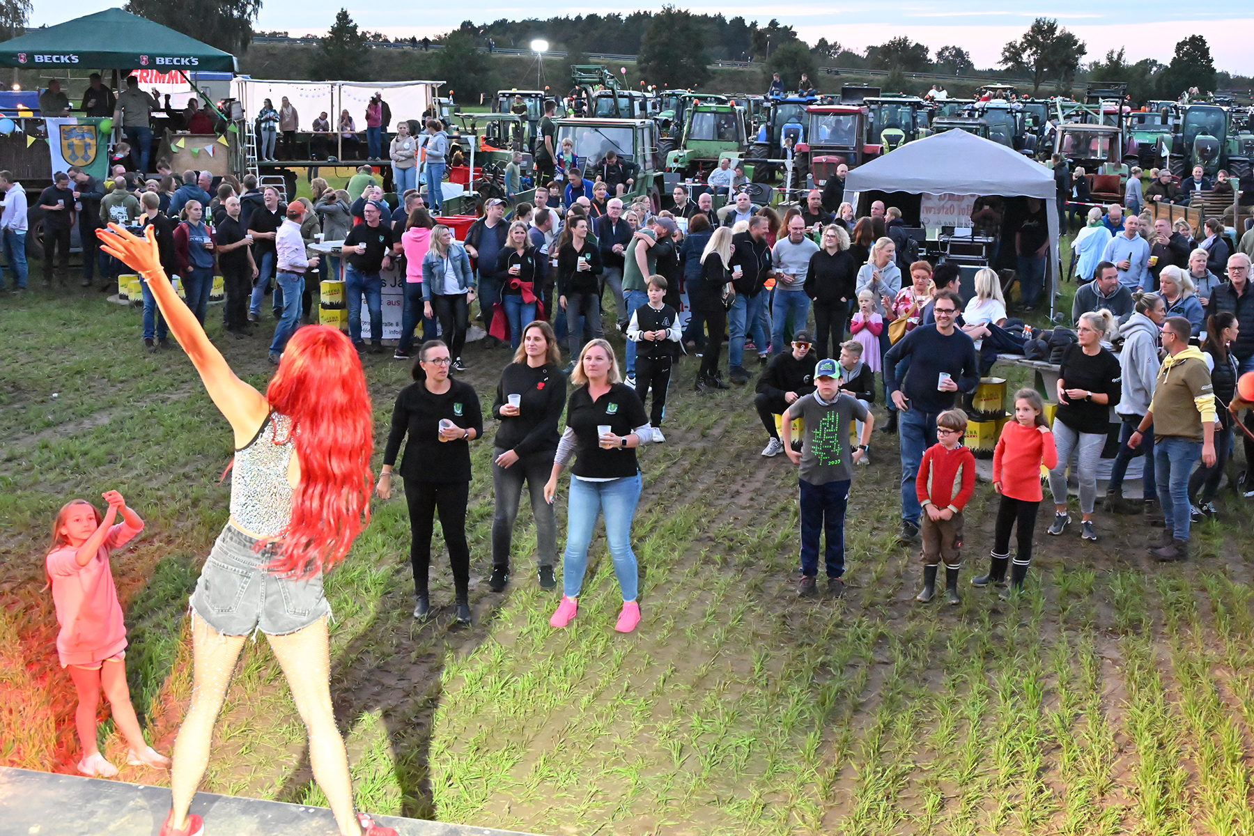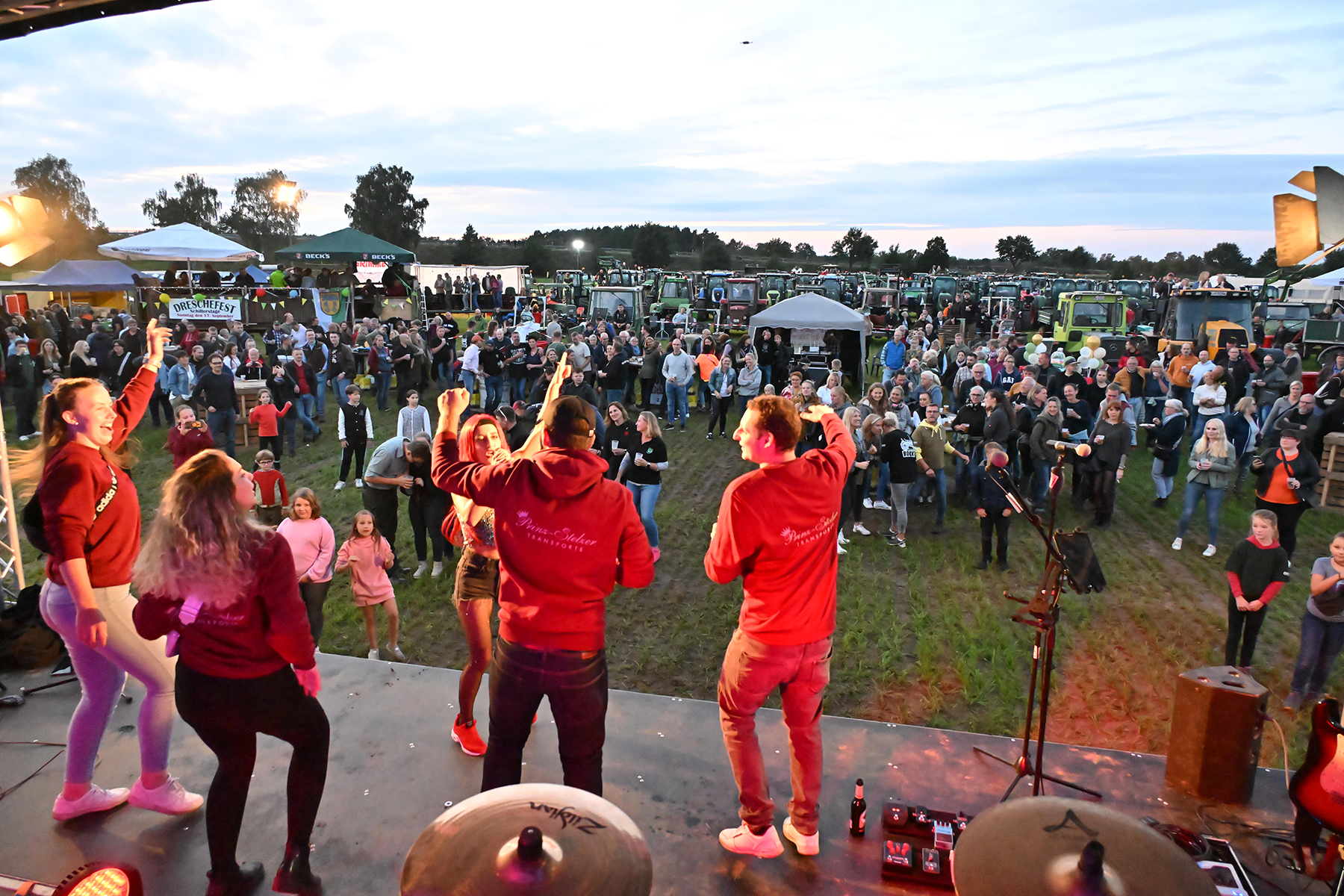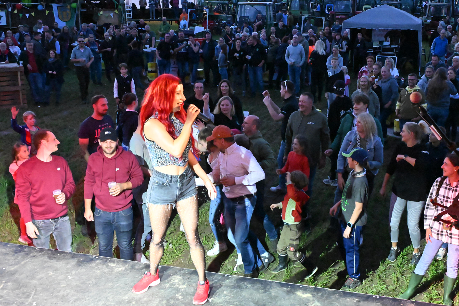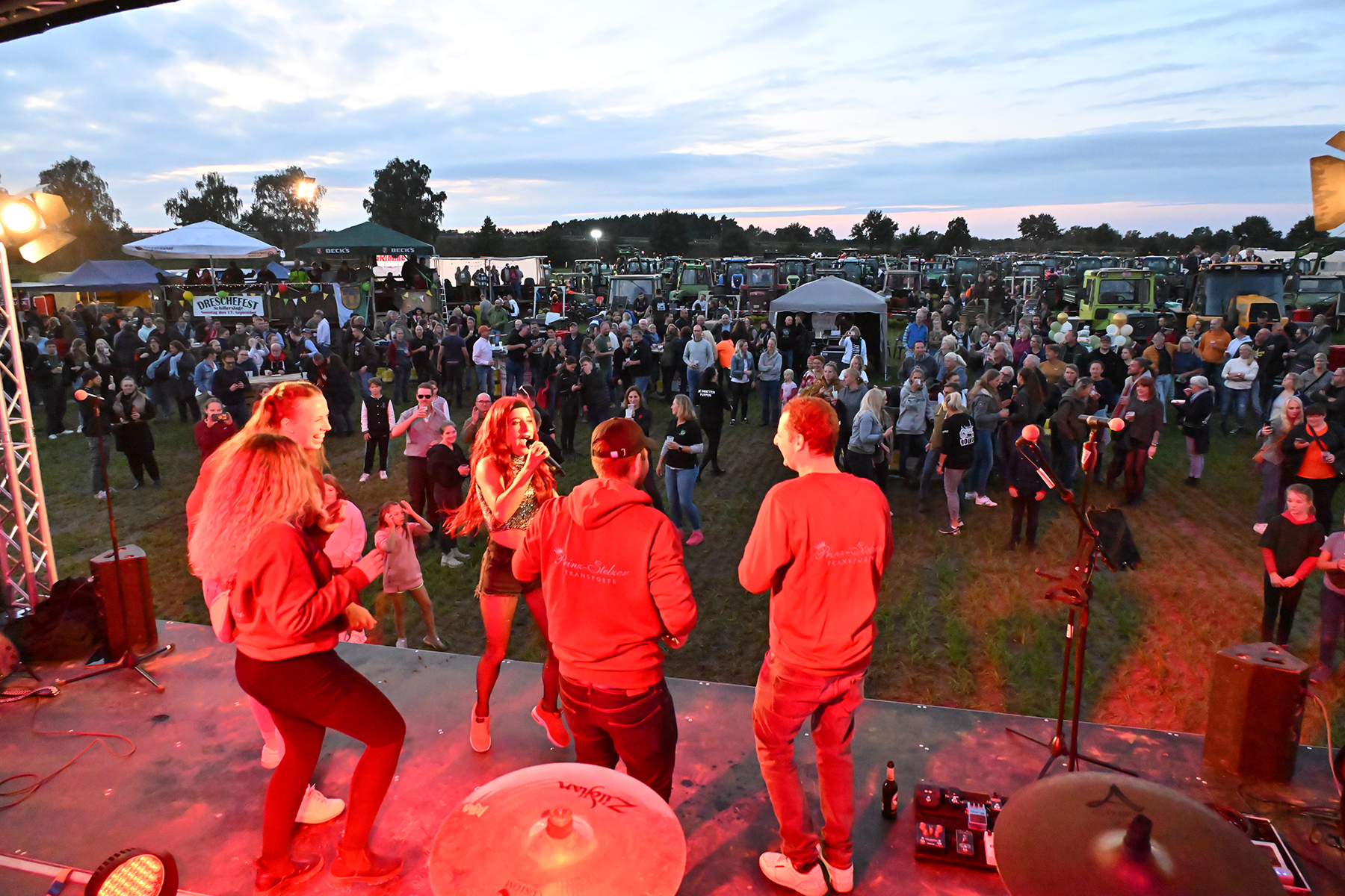Fendt, Deutz andere Trecker-Marken und dazwischen eine Scania-Zugmaschine von Prinz-Stelzer Transporte aus Eicklingen mit extra Terrasse über dem Führerhaus. Party-Sängerin Marie Käfer, die die Gäste mit eingängiger Mallorca-Musik unterhielt, hatte die Gäste aus dem Landkreis Celle sodann gleich im Auge. Mit Johannes, Lukas, Richard und Madeleine holte sie sich vier Gasttänzer vom Scania auf die Bühne, die sichtlich Spaß an ihrer neuen Aufgabe hatten. "Ich find`s mega hier", ließ die rothaarige Marie Käfer die Zuhörer wissen. Wie schon andere Musiker vor ihr war der Anblick von der Bühne auf fast 240 Trecker für sie ein ungewohntes Bild. "Wenn ich nun noch Trecker fahren könnte, dann würde ich das niemals vergessen", erklärte sie mit einem Augenzwinkern. Ihrer Stimmung in nichts nach standen Sängerin Ina Colada sowie Partyband "Meilenstein", die die Solo-Auftritte umrahmte und so für ein mehrstündige Live-Event sorgte.