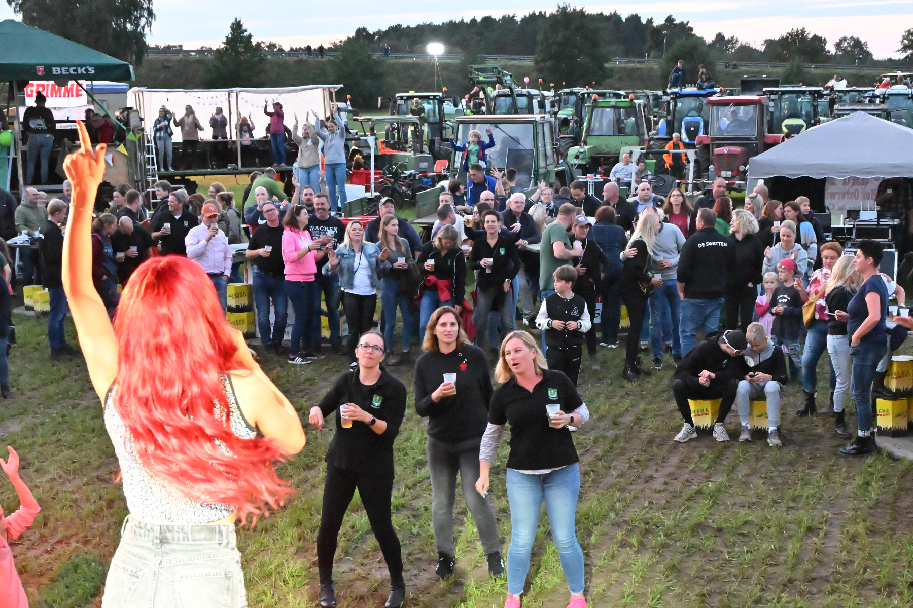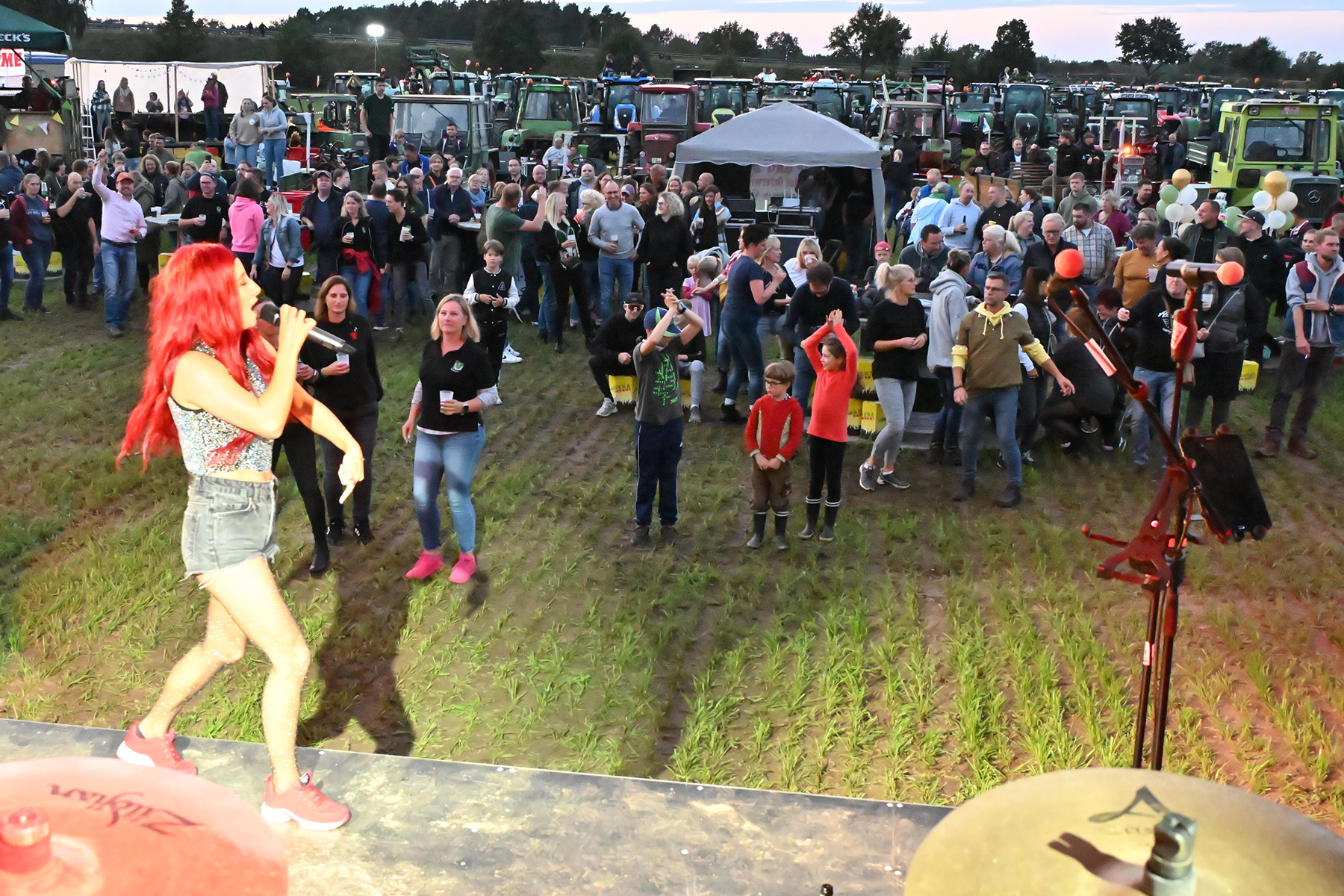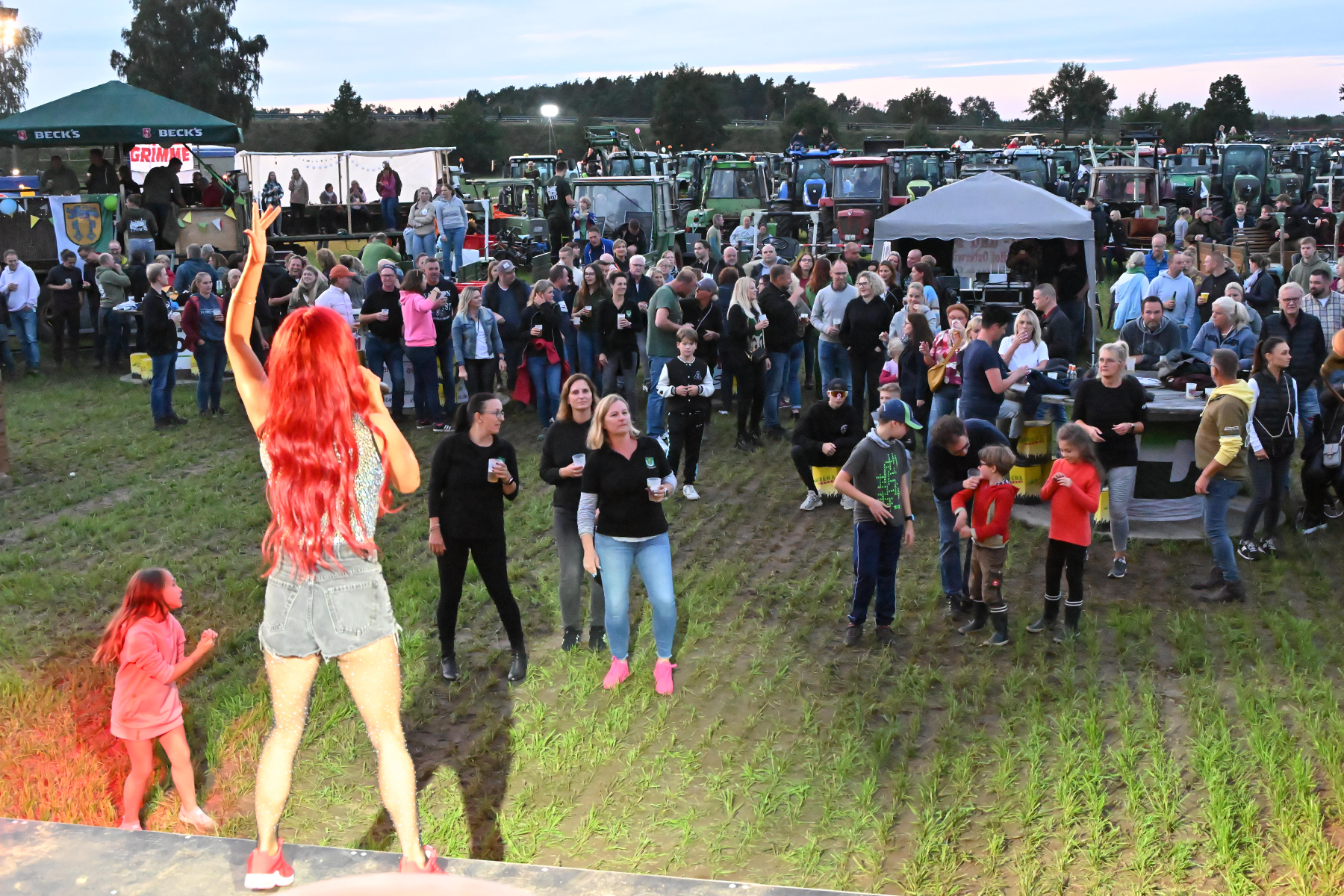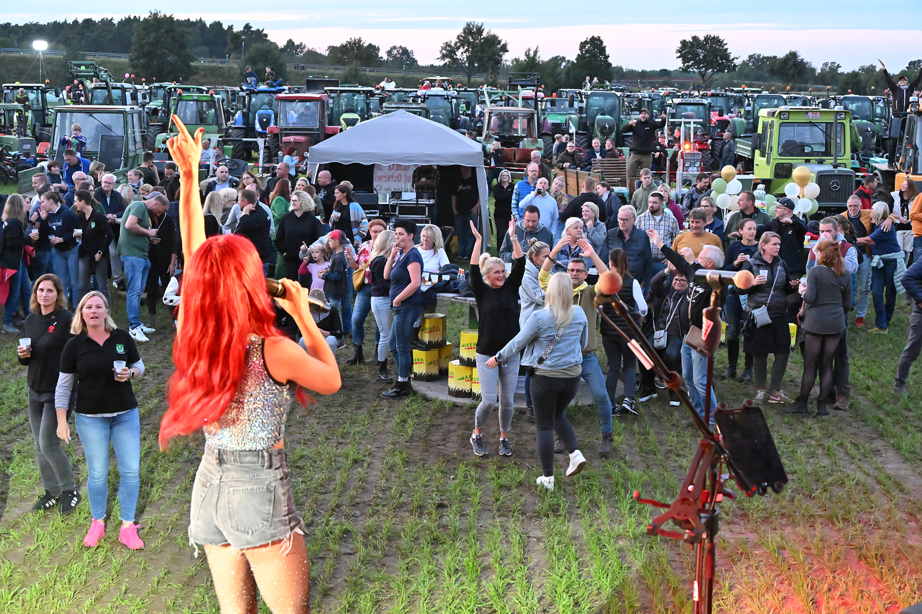 Fendt, Deutz andere Trecker-Marken und dazwischen eine Scania-Zugmaschine von Prinz-Stelzer Transporte aus Eicklingen mit extra Terrasse über dem Führerhaus. Party-Sängerin Marie Käfer, die die Gäste mit eingängiger Mallorca-Musik unterhielt, hatte die Gäste aus dem Landkreis Celle sodann gleich im Auge. Mit Johannes, Lukas, Richard und Madeleine holte sie sich vier Gasttänzer vom Scania auf die Bühne, die sichtlich Spaß an ihrer neuen Aufgabe hatten. "Ich find`s mega hier", ließ die rothaarige Marie Käfer die Zuhörer wissen. Wie schon andere Musiker vor ihr war der Anblick von der Bühne auf fast 240 Trecker für sie ein ungewohntes Bild. "Wenn ich nun noch Trecker fahren könnte, dann würde ich das niemals vergessen", erklärte sie mit einem Augenzwinkern. Ihrer Stimmung in nichts nach standen Sängerin Ina Colada sowie Partyband "Meilenstein", die die Solo-Auftritte umrahmte und so für ein mehrstündige Live-Event sorgte.