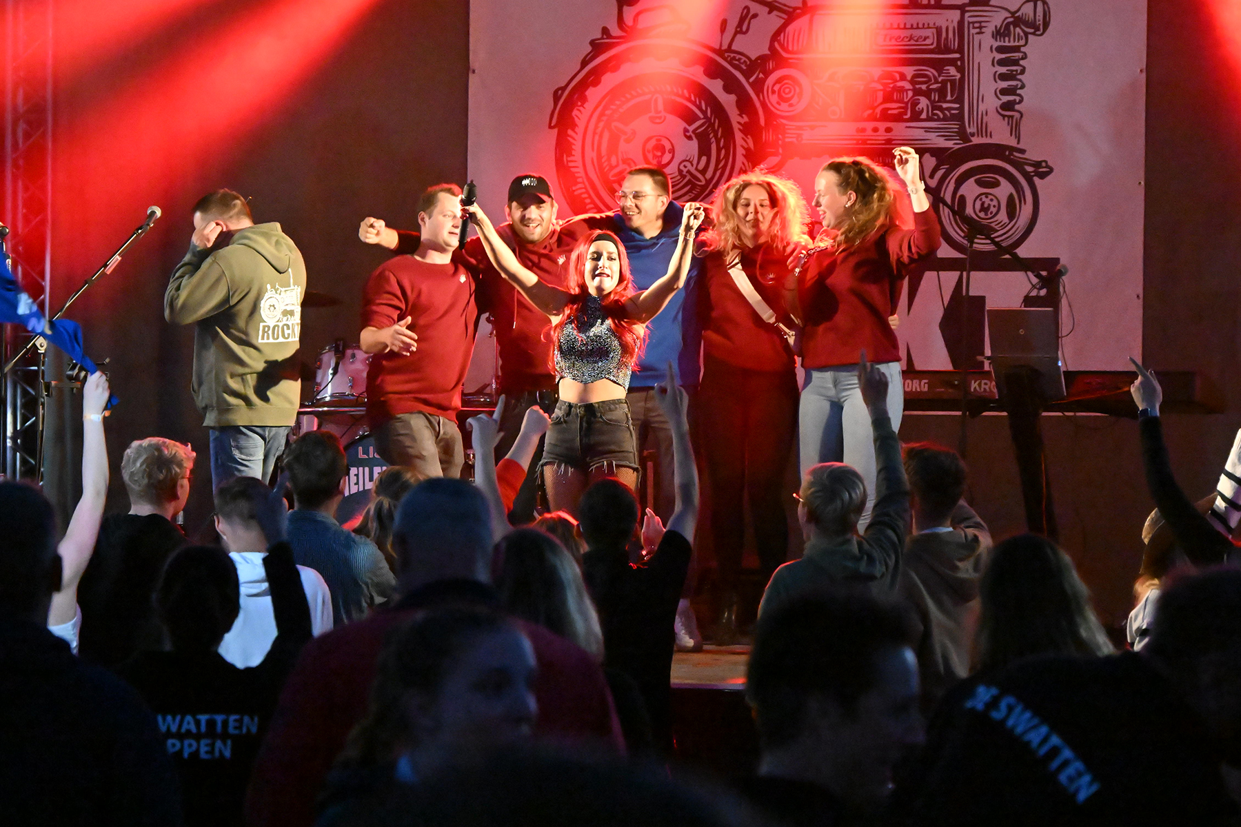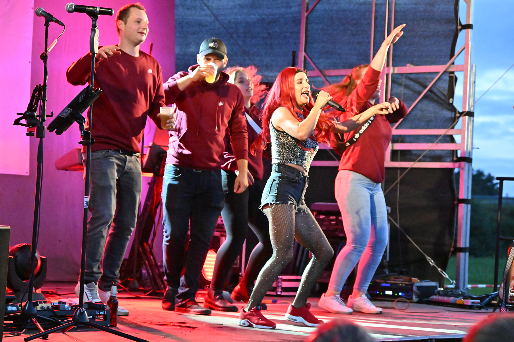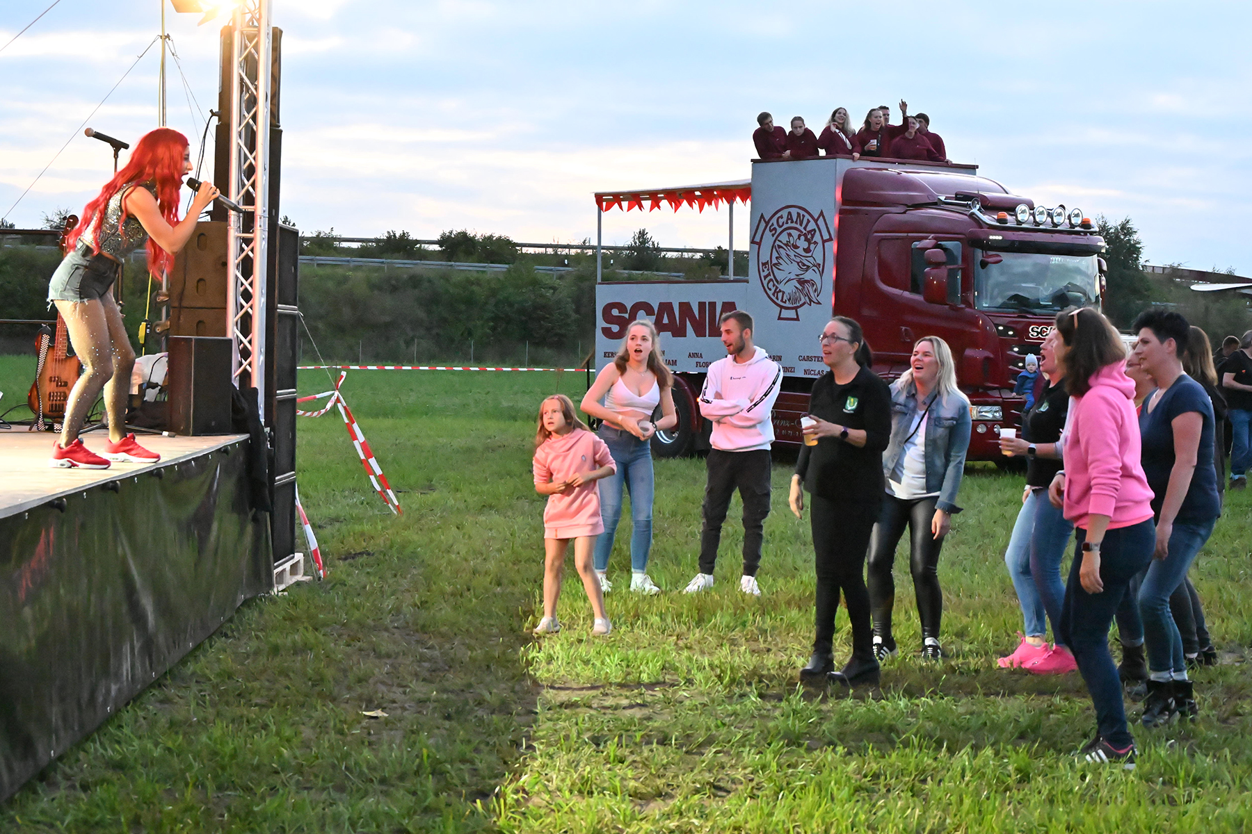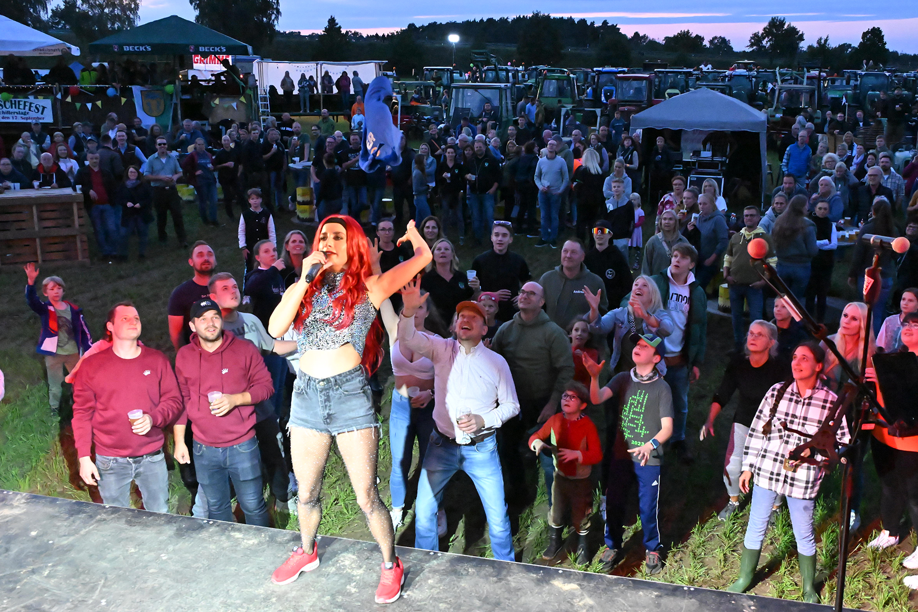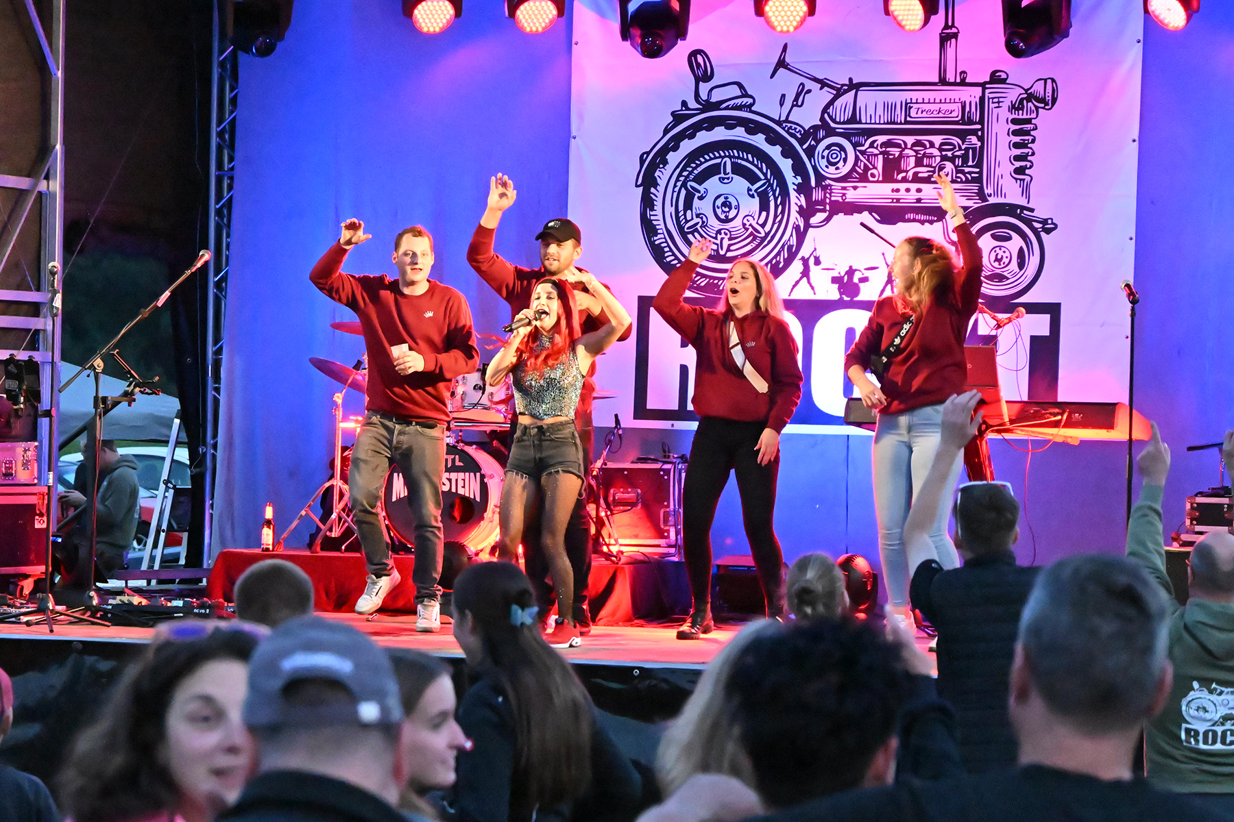 Fendt, Deutz andere Trecker-Marken und dazwischen eine Scania-Zugmaschine von Prinz-Stelzer Transporte aus Eicklingen mit extra Terrasse über dem Führerhaus. Party-Sängerin Marie Käfer, die die Gäste mit eingängiger Mallorca-Musik unterhielt, hatte die Gäste aus dem Landkreis Celle sodann gleich im Auge. Mit Johannes, Lukas, Richard und Madeleine holte sie sich vier Gasttänzer vom Scania auf die Bühne, die sichtlich Spaß an ihrer neuen Aufgabe hatten. "Ich find`s mega hier", ließ die rothaarige Marie Käfer die Zuhörer wissen. Wie schon andere Musiker vor ihr war der Anblick von der Bühne auf fast 240 Trecker für sie ein ungewohntes Bild. "Wenn ich nun noch Trecker fahren könnte, dann würde ich das niemals vergessen", erklärte sie mit einem Augenzwinkern. Ihrer Stimmung in nichts nach standen Sängerin Ina Colada sowie Partyband "Meilenstein", die die Solo-Auftritte umrahmte und so für ein mehrstündige Live-Event sorgte.