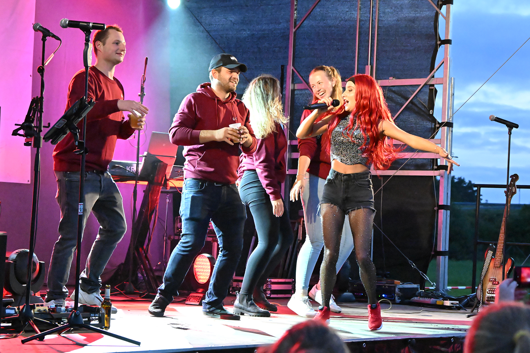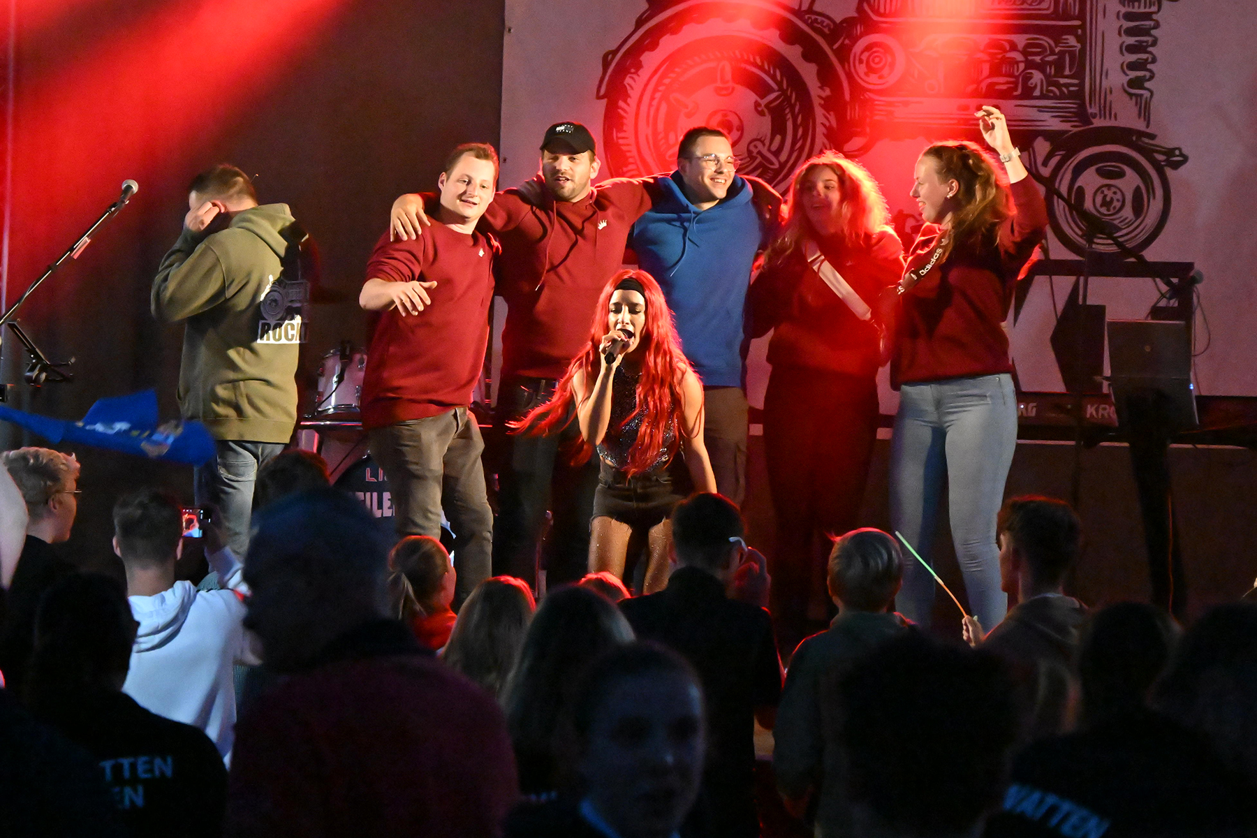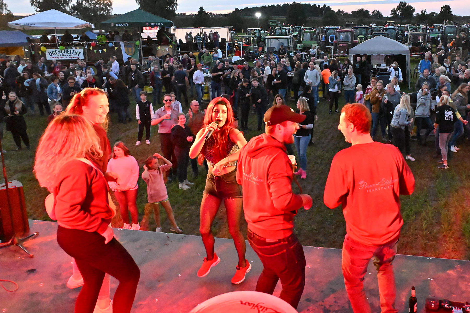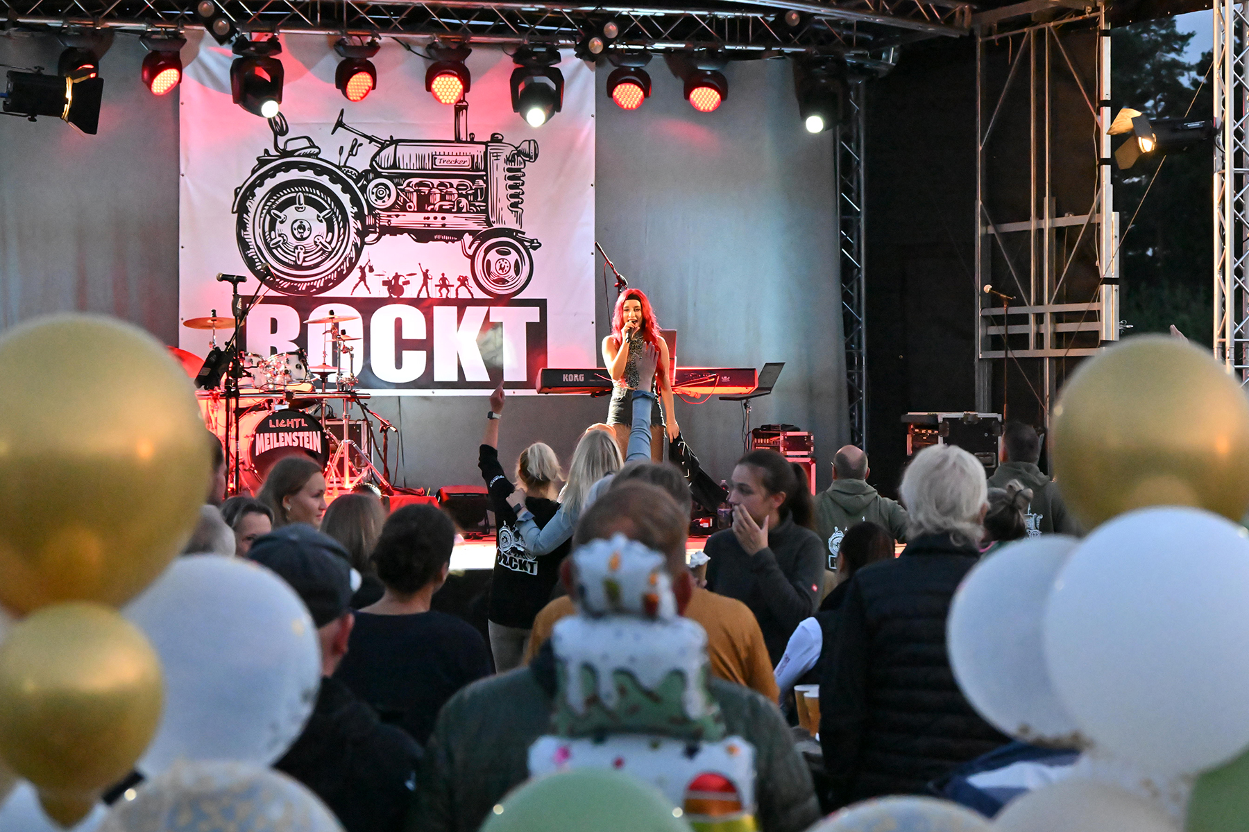 Fendt, Deutz andere Trecker-Marken und dazwischen eine Scania-Zugmaschine von Prinz-Stelzer Transporte aus Eicklingen mit extra Terrasse über dem Führerhaus. Party-Sängerin Marie Käfer, die die Gäste mit eingängiger Mallorca-Musik unterhielt, hatte die Gäste aus dem Landkreis Celle sodann gleich im Auge. Mit Johannes, Lukas, Richard und Madeleine holte sie sich vier Gasttänzer vom Scania auf die Bühne, die sichtlich Spaß an ihrer neuen Aufgabe hatten. "Ich find`s mega hier", ließ die rothaarige Marie Käfer die Zuhörer wissen. Wie schon andere Musiker vor ihr war der Anblick von der Bühne auf fast 240 Trecker für sie ein ungewohntes Bild. "Wenn ich nun noch Trecker fahren könnte, dann würde ich das niemals vergessen", erklärte sie mit einem Augenzwinkern. Ihrer Stimmung in nichts nach standen Sängerin Ina Colada sowie Partyband "Meilenstein", die die Solo-Auftritte umrahmte und so für ein mehrstündige Live-Event sorgte.