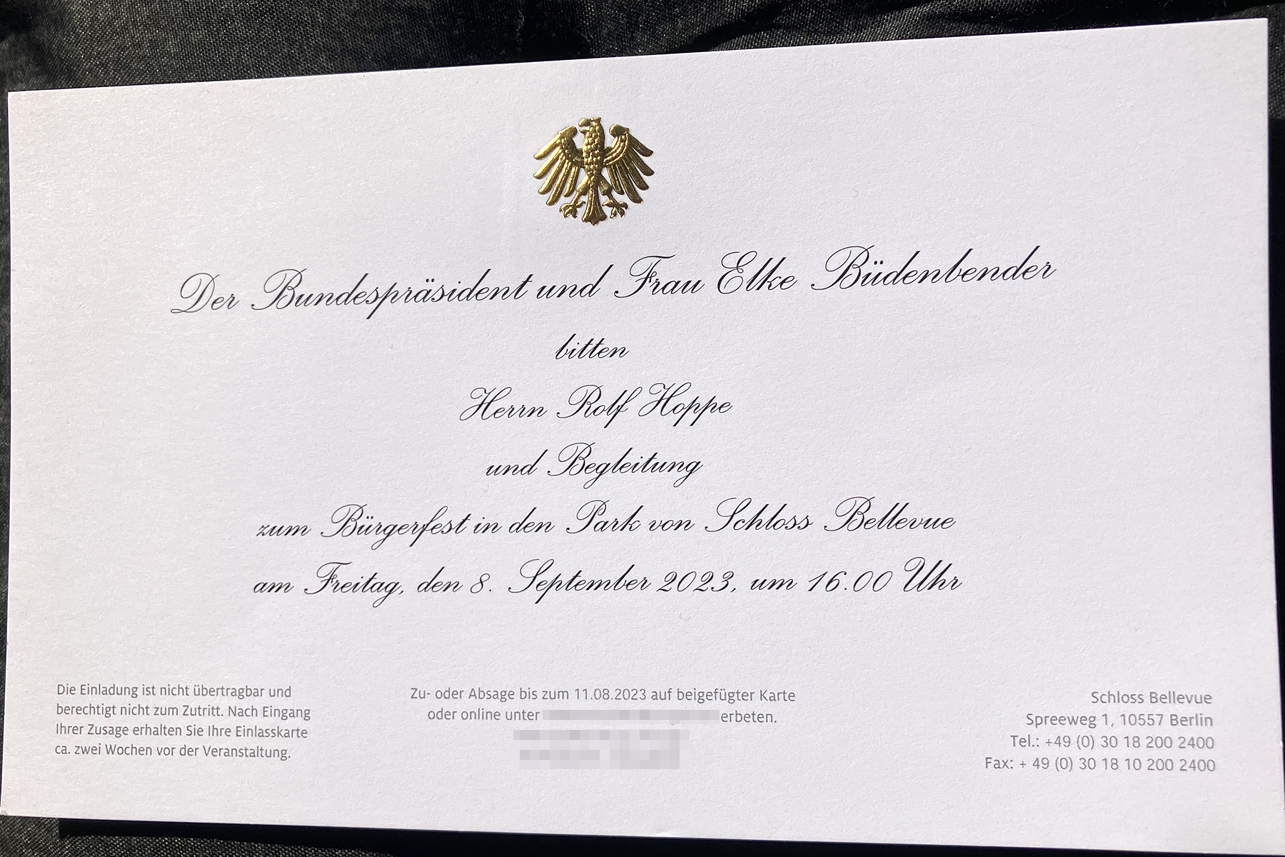 Am ersten Tag des Bürgerfestes, am Freitag, 8. September, waren Menschen aus ganz Deutschland zu Gast, die mit ihrem herausragenden ehrenamtlichen Einsatz zu einer lebendigen Zivilgesellschaft beitragen. 5000 Ehrenamtliche waren in diesem Jahr im Schlosspark. Hierunter auch der Ehrenkommandeur der Burgdorfer Schützengesellschaft, Rolf Hoppe, der zusammen mit seiner Frau eine offizielle Einladung des Bundespräsidenten bekommen hatte.