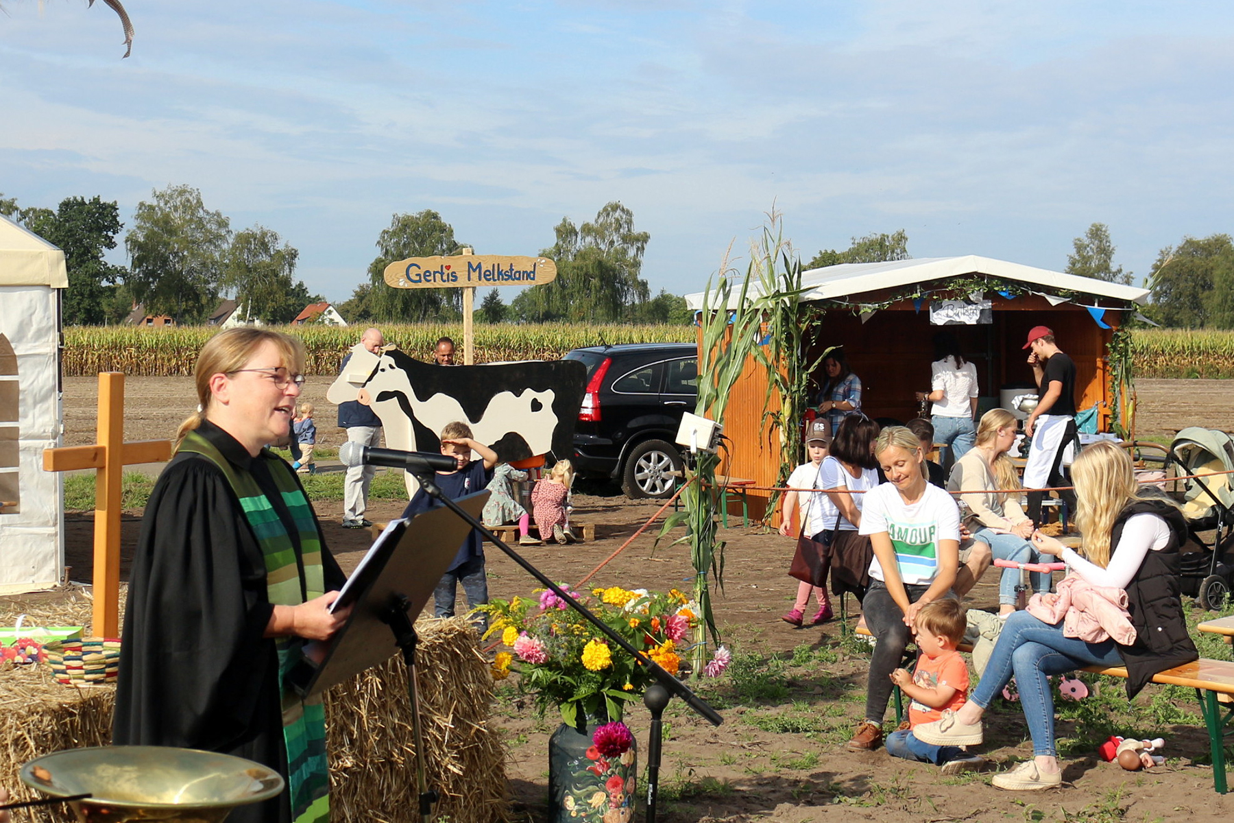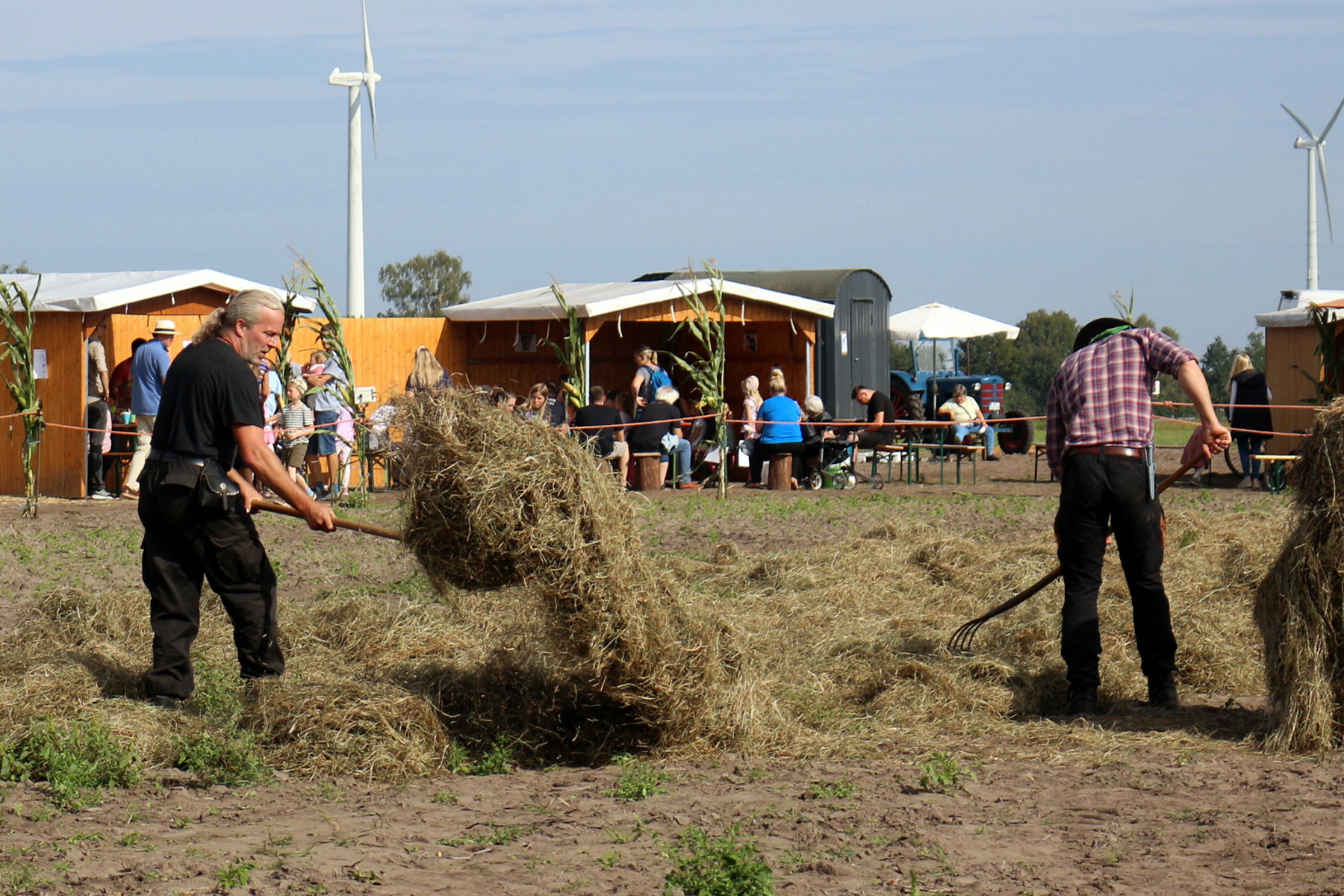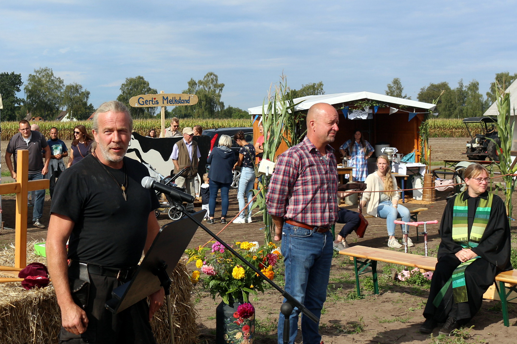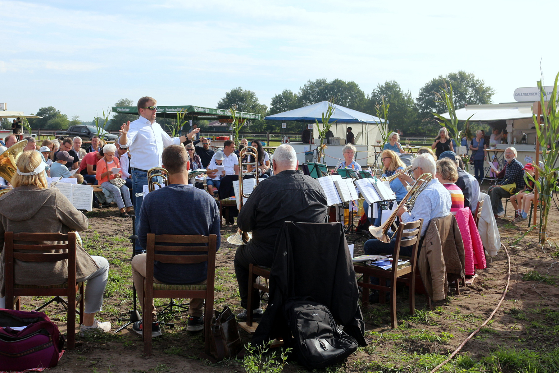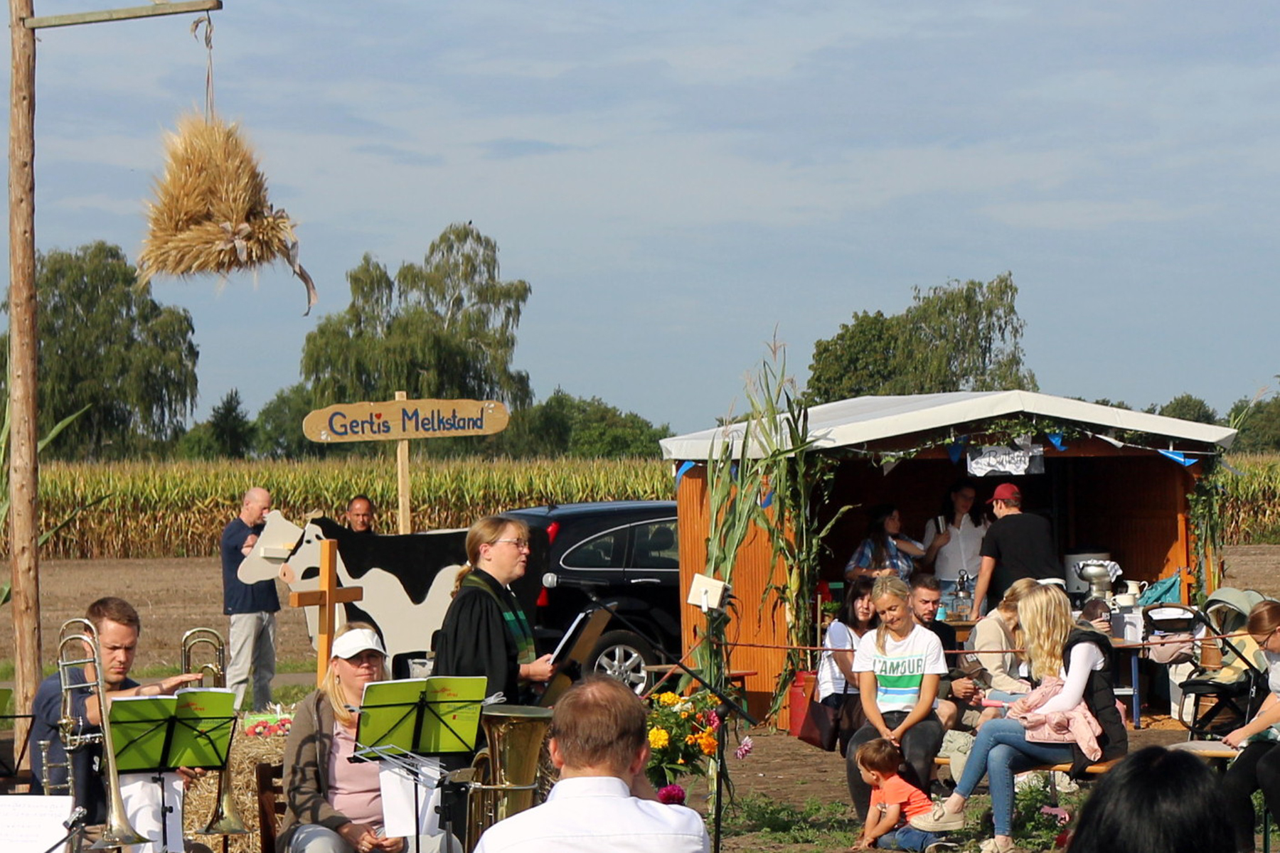 Unweit des Feuerwehrhauses wurde das Dreschefest von Pankratius-Pastorin Friederike Grote mit einem Gottesdienst unter freiem Himmel eröffnet, der thematisch an das diesjährige Veranstaltungsmotto angelehnt war. Die Andacht wurde musikalisch vom Posaunenchor unter der Leitung von Kirchenkreiskantor Martin Burzeya begleitet.