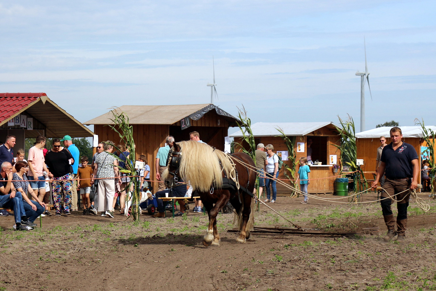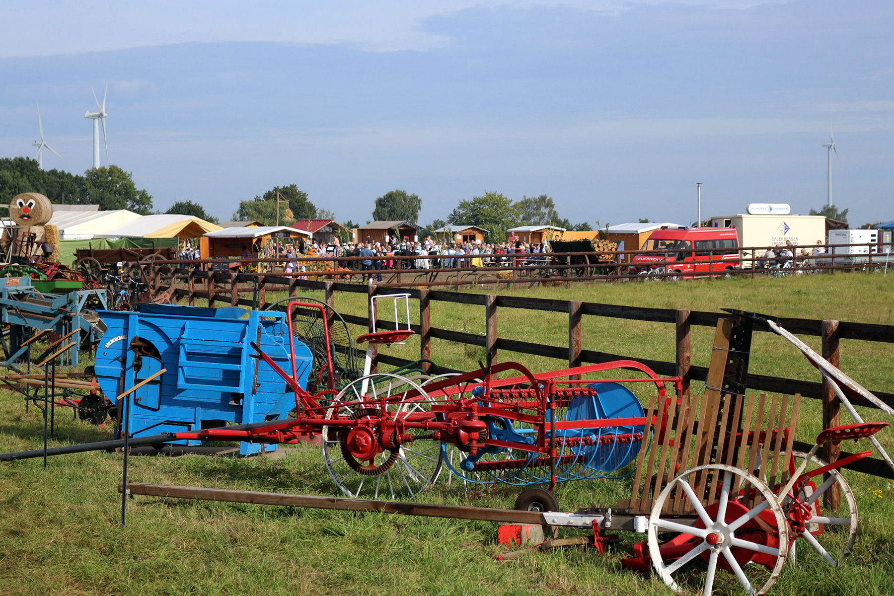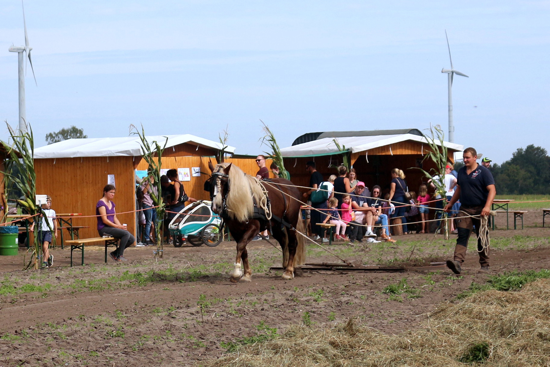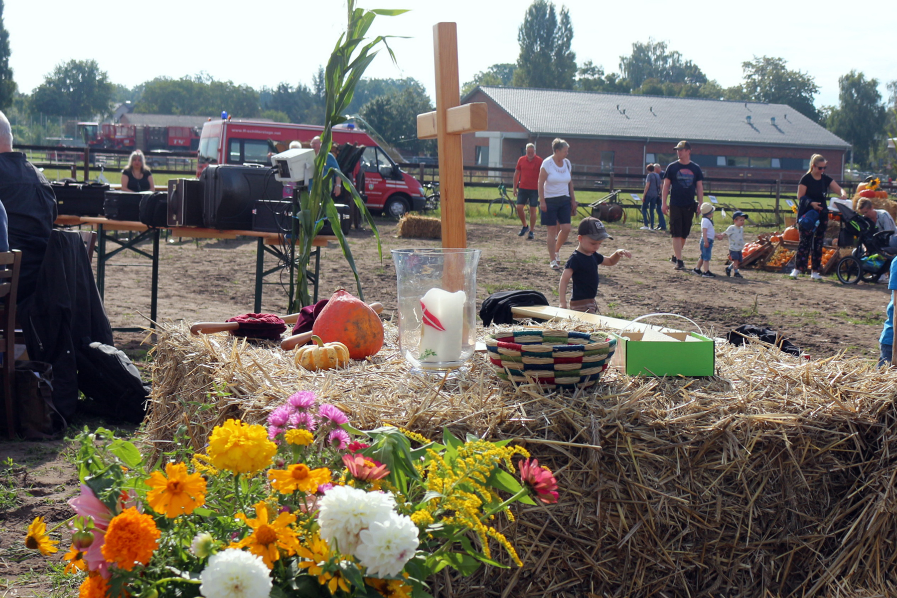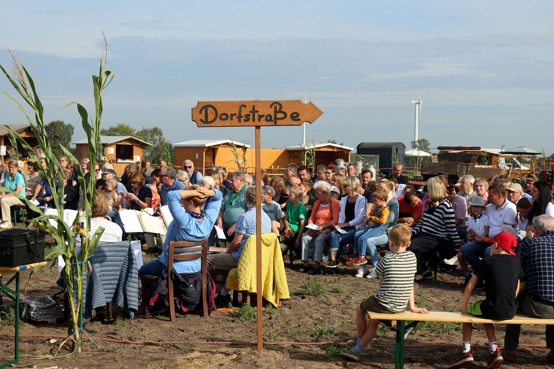 Unweit des Feuerwehrhauses wurde das Dreschefest von Pankratius-Pastorin Friederike Grote mit einem Gottesdienst unter freiem Himmel eröffnet, der thematisch an das diesjährige Veranstaltungsmotto angelehnt war. Die Andacht wurde musikalisch vom Posaunenchor unter der Leitung von Kirchenkreiskantor Martin Burzeya begleitet.