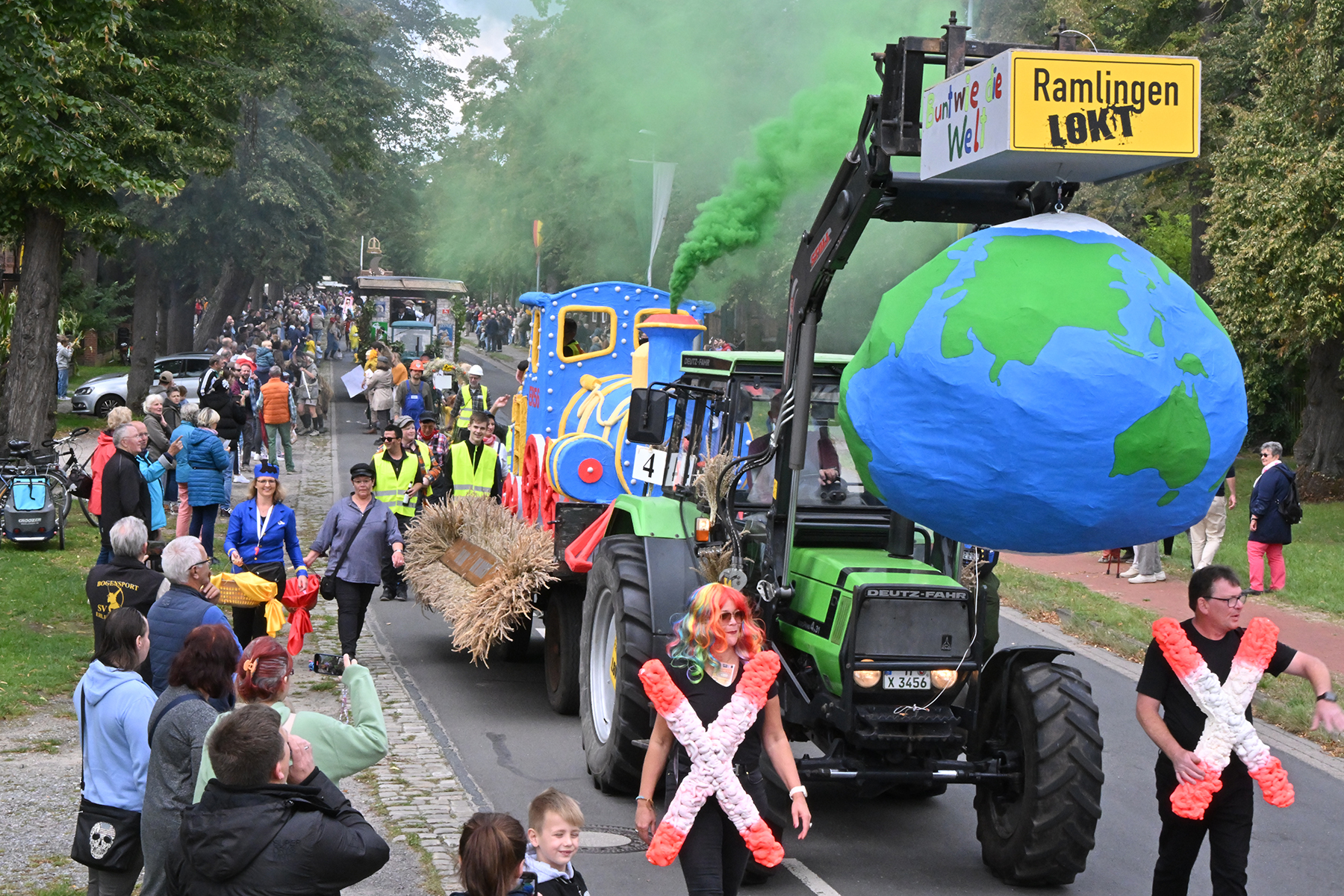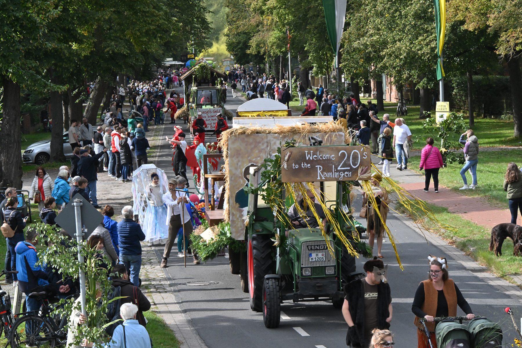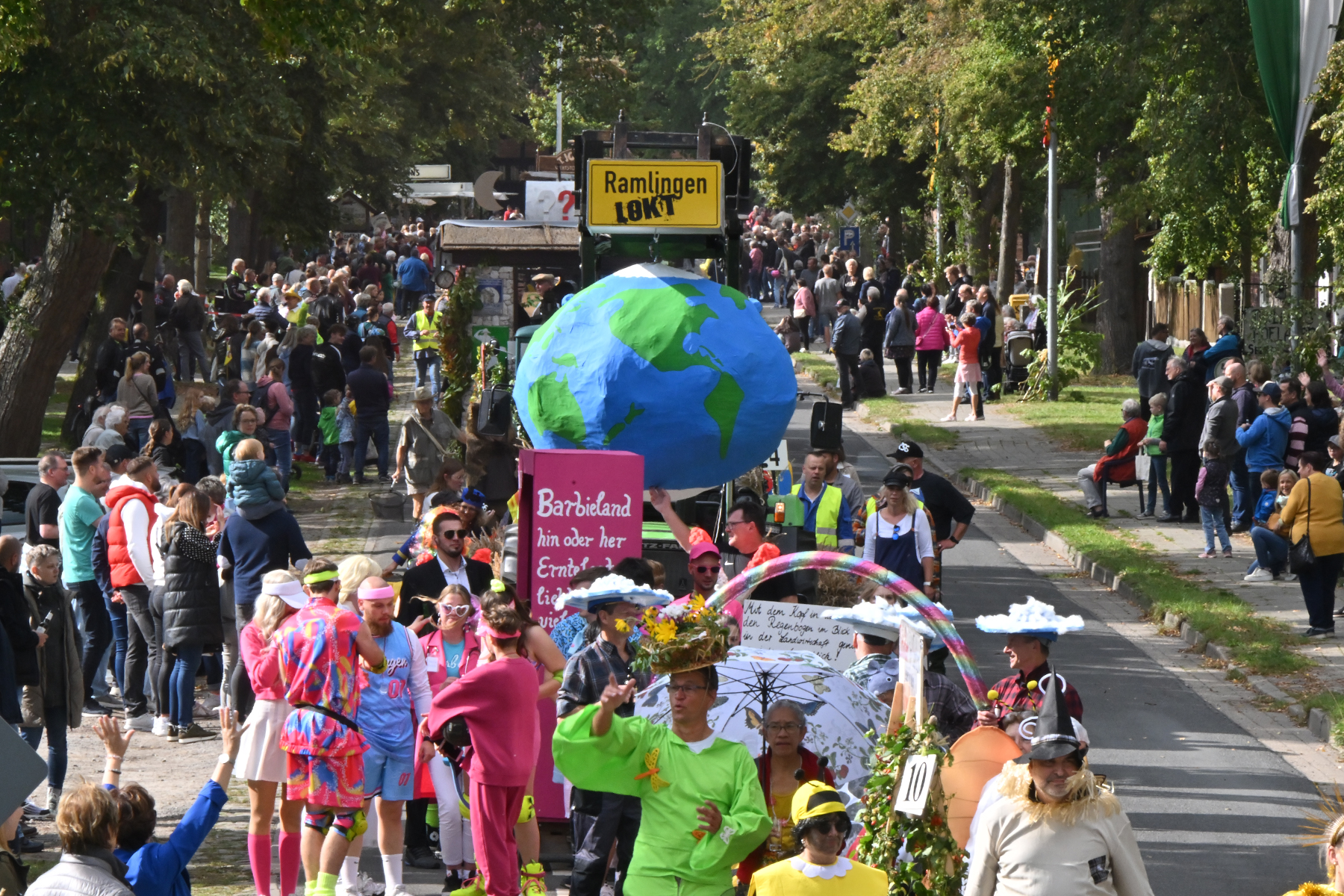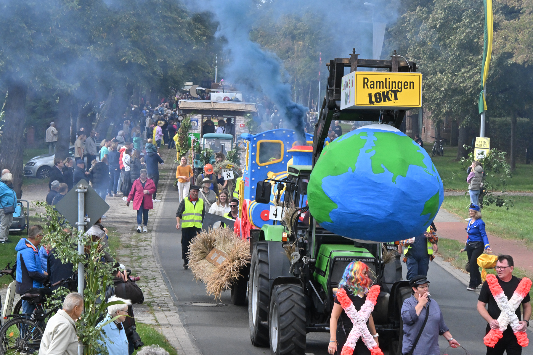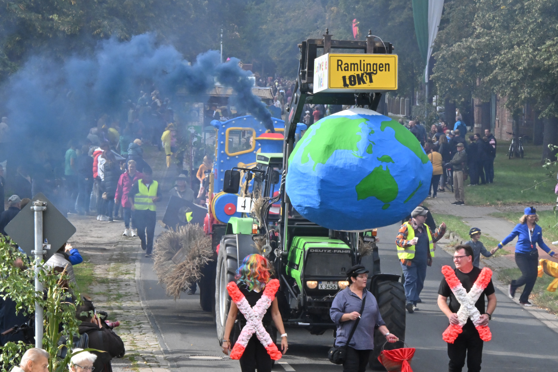 Der Festumzug, der am morgigen Sonntag erneut durch den Ort führt, hat auch in diesem Jahr wieder viele Gruppen animiert, Mottowagen für diesen zu bauen. Sind es in diesem Jahr nicht die ganz großen Erntewagen, so überzeugen alle durch viel Detailreichtum. "Wieviel Zeit, Energie und Einsatz in das Fertigen der Erntewagen gesteckt wird, ist unglaublich"; so Manfred Meyer, der in diesem Jahr aus der Dorfgemeinschaft Ramlingen verabschiedet wurde. Die achtköpfige "Dorfgemeinschaft Ramlingen" ist das Organisationsteam, das hinter dem Erntefest steht, aber auch auf viele ehrenamtliche Helfer zurückgreifen kann. Wie beispielsweise Kräfte der Ortsfeuerwehr Weferlingsen, die auch in diesem Jahr die Umzugsstrecke sicherten. "Das Fest wird es immer geben", ist sich Manfred Meyer sicher. Das sehe man an den vielen jungen Menschen, die sich am Umzug beteiligen.