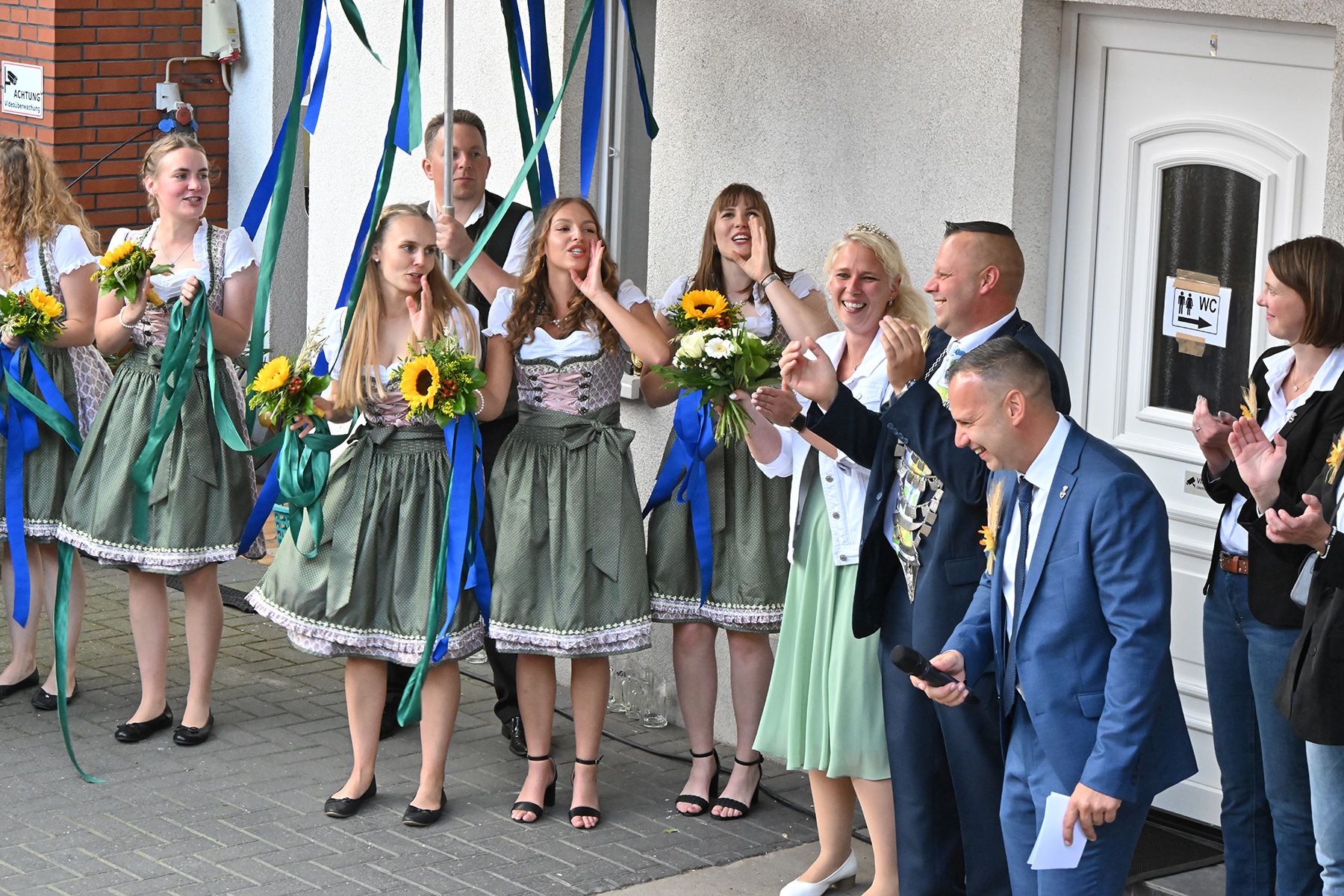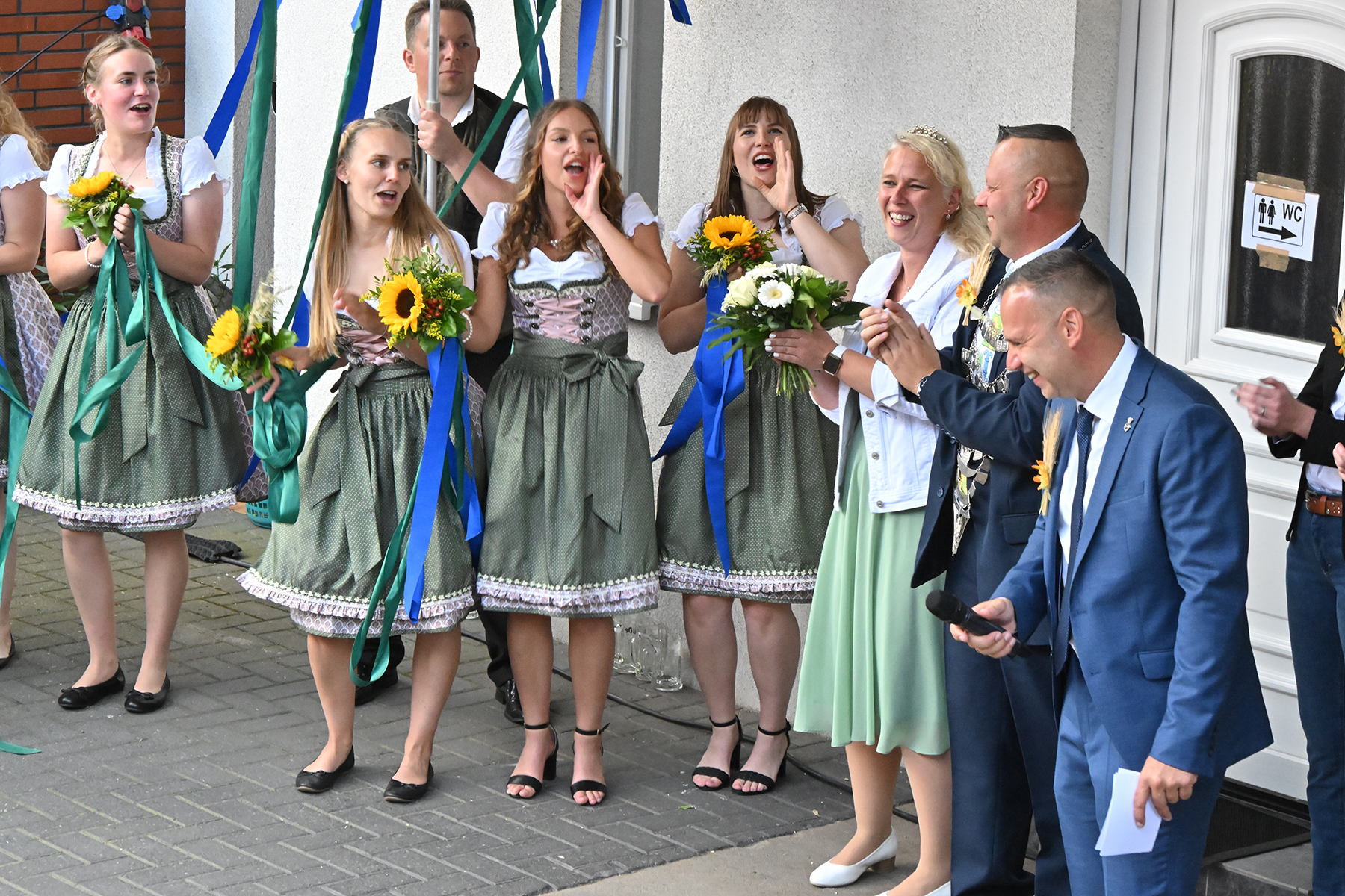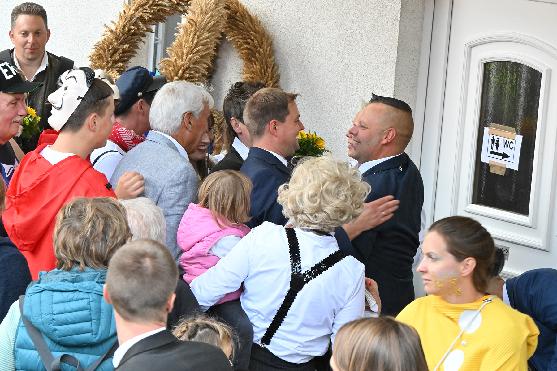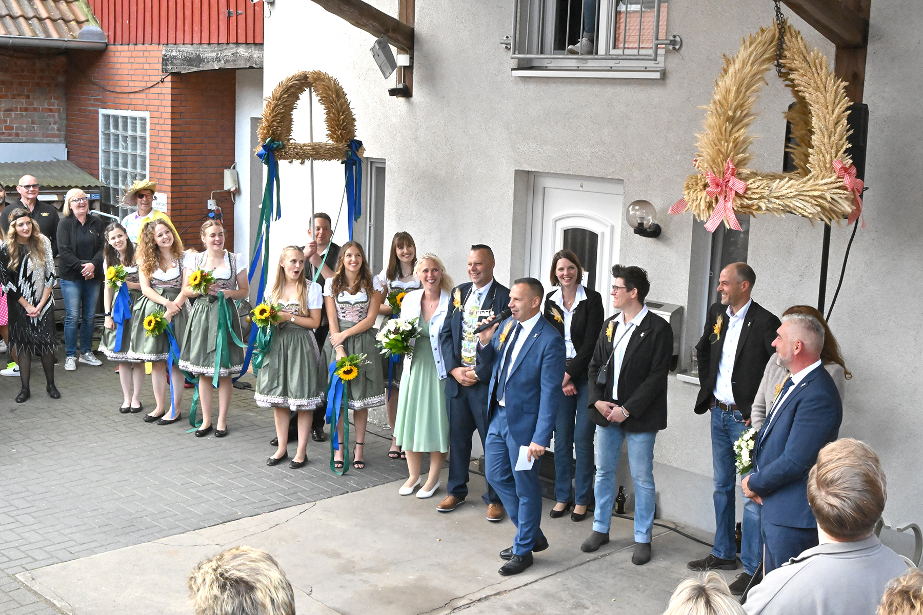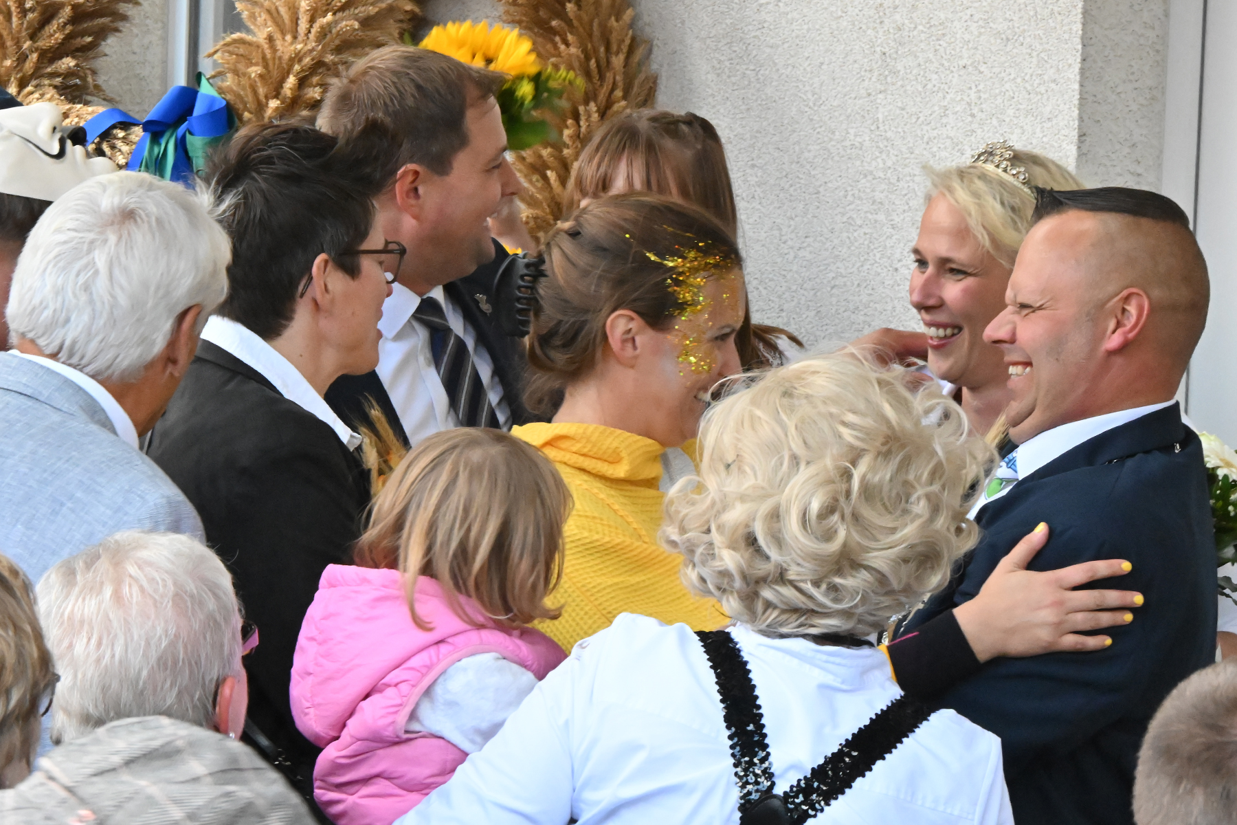"Einmal König, immer König. Deswegen sind wir auch das Dorf der Könige", so Timo Wöhler, der die Kette anschließend seinem Bruder überreichte. Nachdem auch die Erntekrone aufgehängt worden war, bekannt die Königszeit von Thomas II. mit dem Ehrentanz mit seiner Steffi. Nach vielen Gratulationen ging es für den neuen König mit seinen Begleitern aufs Festzelt im Akazienweg, wo am Abend der erste Ernteball des Wochenendes stattfinden wird.