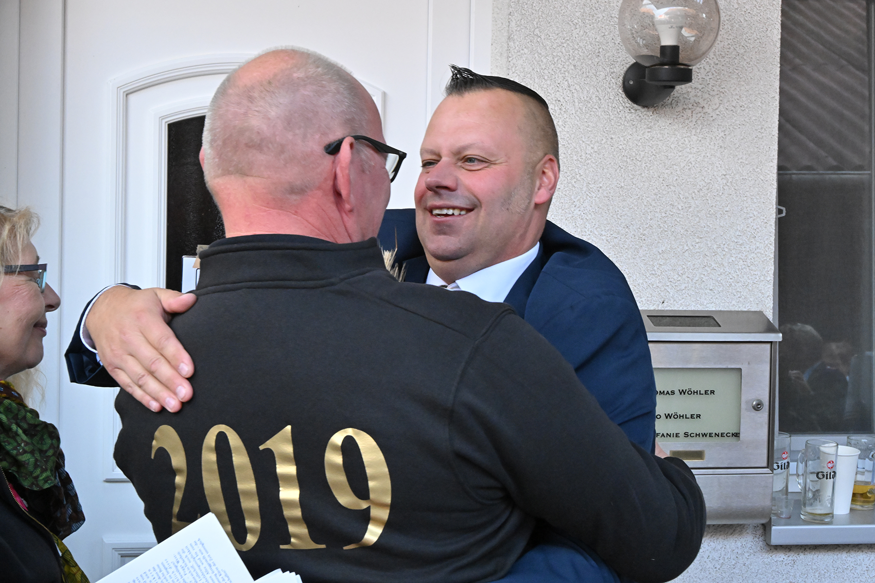 Als sich dann auf Hof Wöhler getroffen wurde, war bereits vielen klar: Es wird Thomas Wöhler sein, Bruder vom Dorfgemeinschaftssprecher Timo Wöhler. "Ich kenne kaum jemanden besser, als den zukünftigen König", so Timo Wöhler. Thomas sei bekannt durch seine Teilnahme an den Wagenbauern seit seiner Kindheit wie auch die Teilnahme am Sonntag mit dem Fanfarencorps Thönse, in dem Thomas Wöhler leidenschaftlich das Sousaphon spielt, wie viele Besucher des Erntefestes beim Aufspielen der Musiker im Festzelt nach dem Sonntagsumzug wissen.