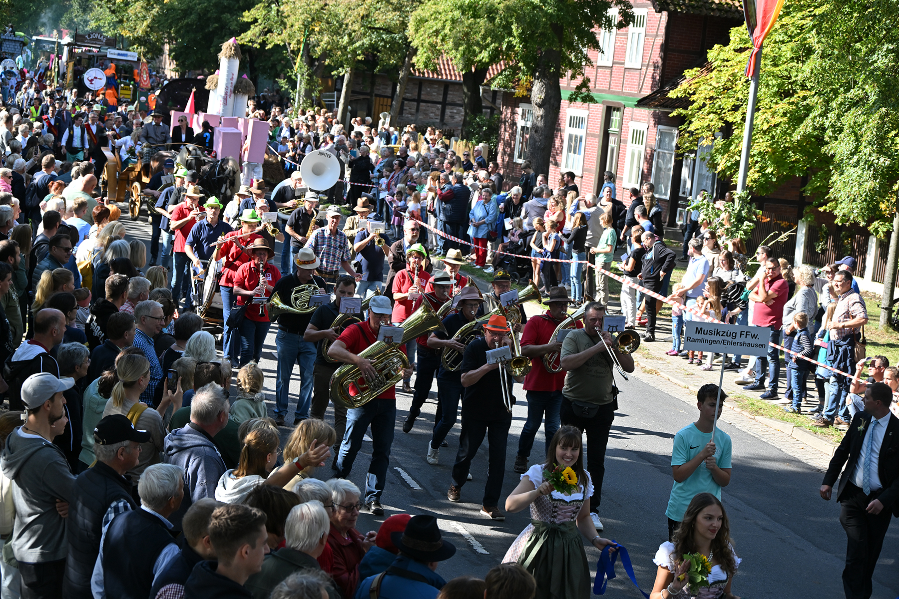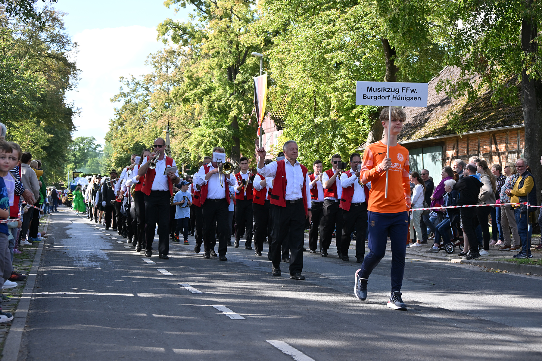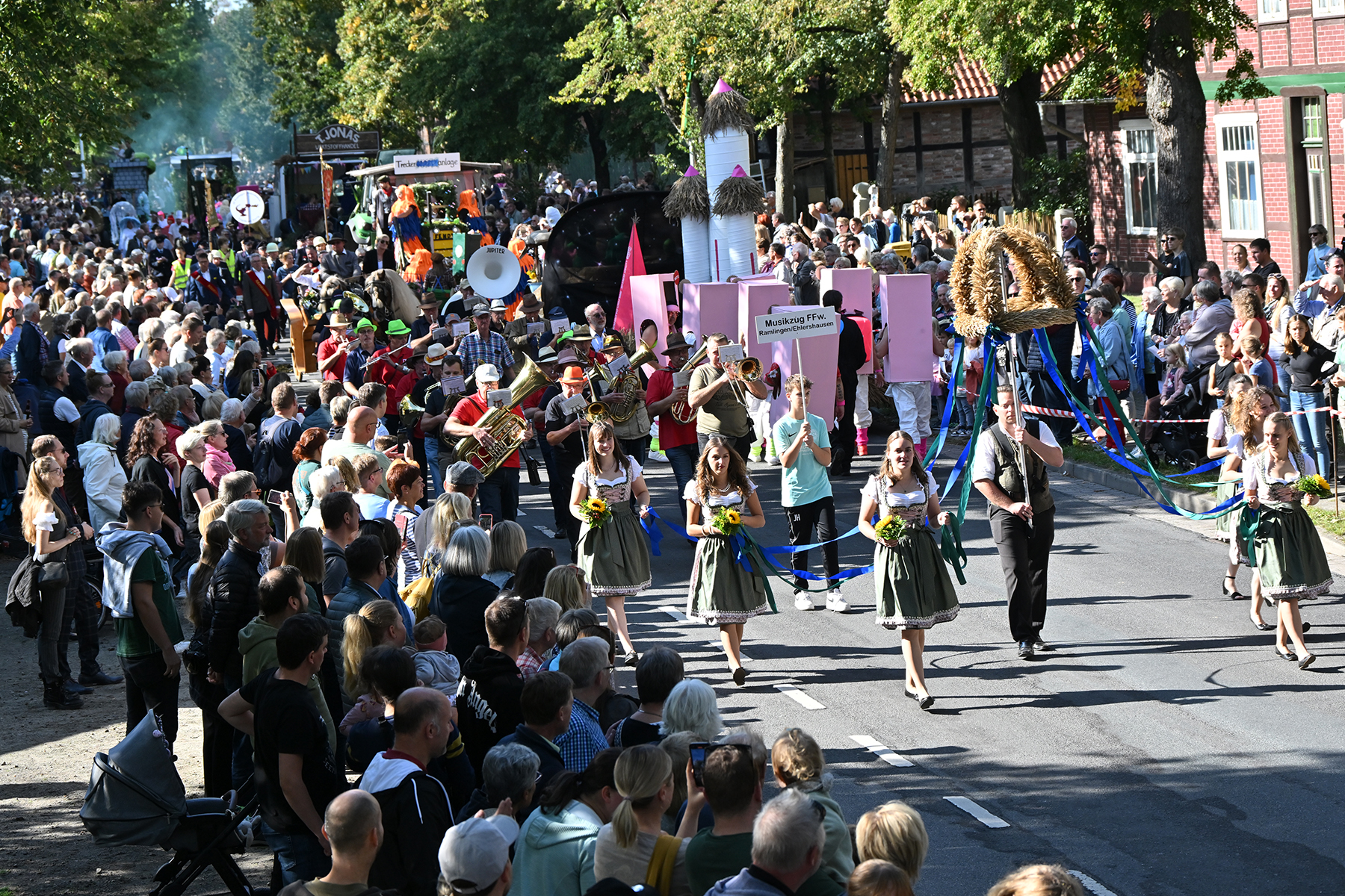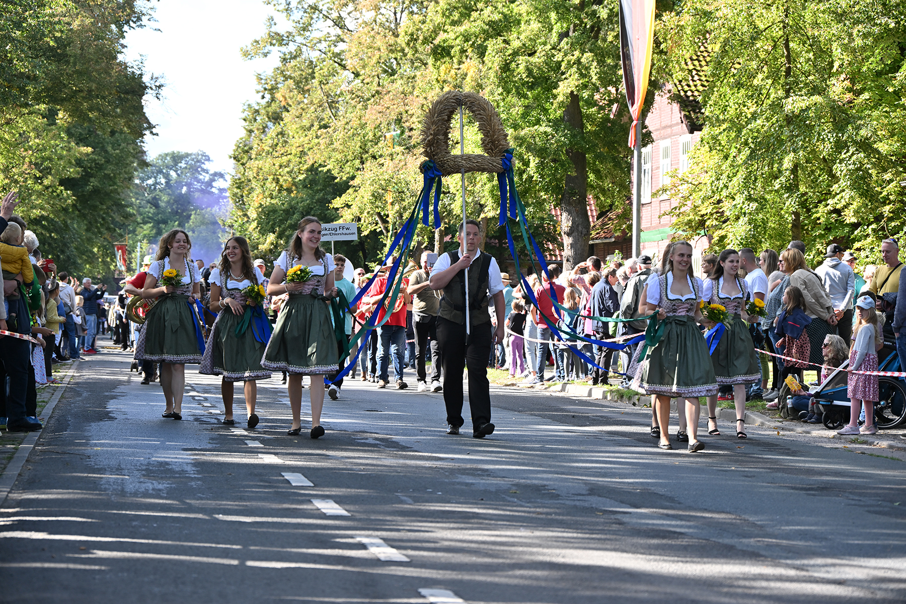 Anschließend reihten sich Erntekrone, Erntekönig und Ortsrat in den Zug ein, der dann zweimal durch den Ort führte. Begleitet wurde der Umzug vom Feuerwehrmusikzug Ramlingen-Ehlershausen, zum Fanfarencorps Thönse, vom Musikzug der Freiwilligen Feuerwehren Burgdorf und Hänigsen sowie vom Musik- und Fanfarenzug des Schützen-Corps Lehrte. Abgesichert wurde der Umzug wie immer von Ehrenamtlichen der Freiwilligen Feuerwehr Weferlingsen.