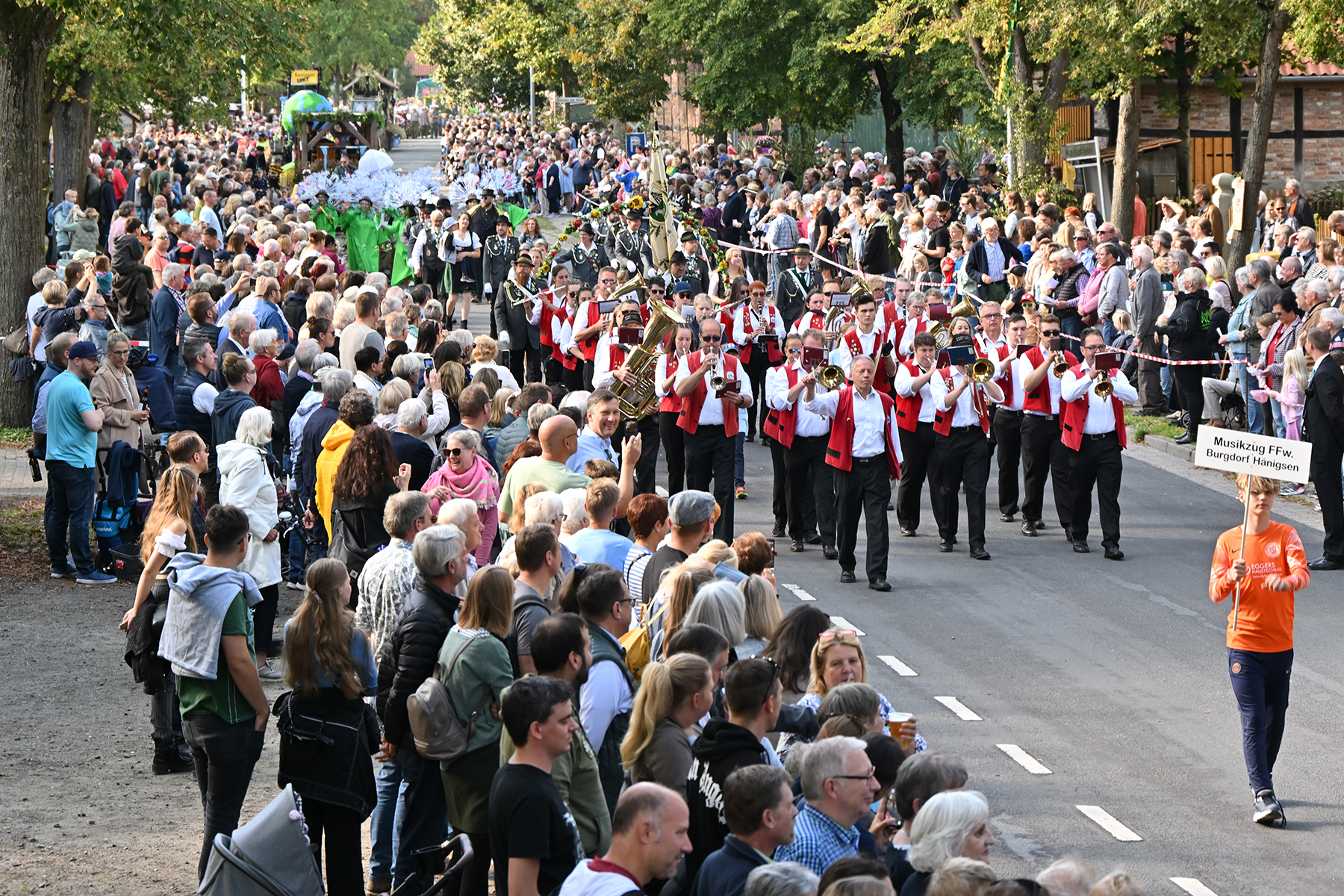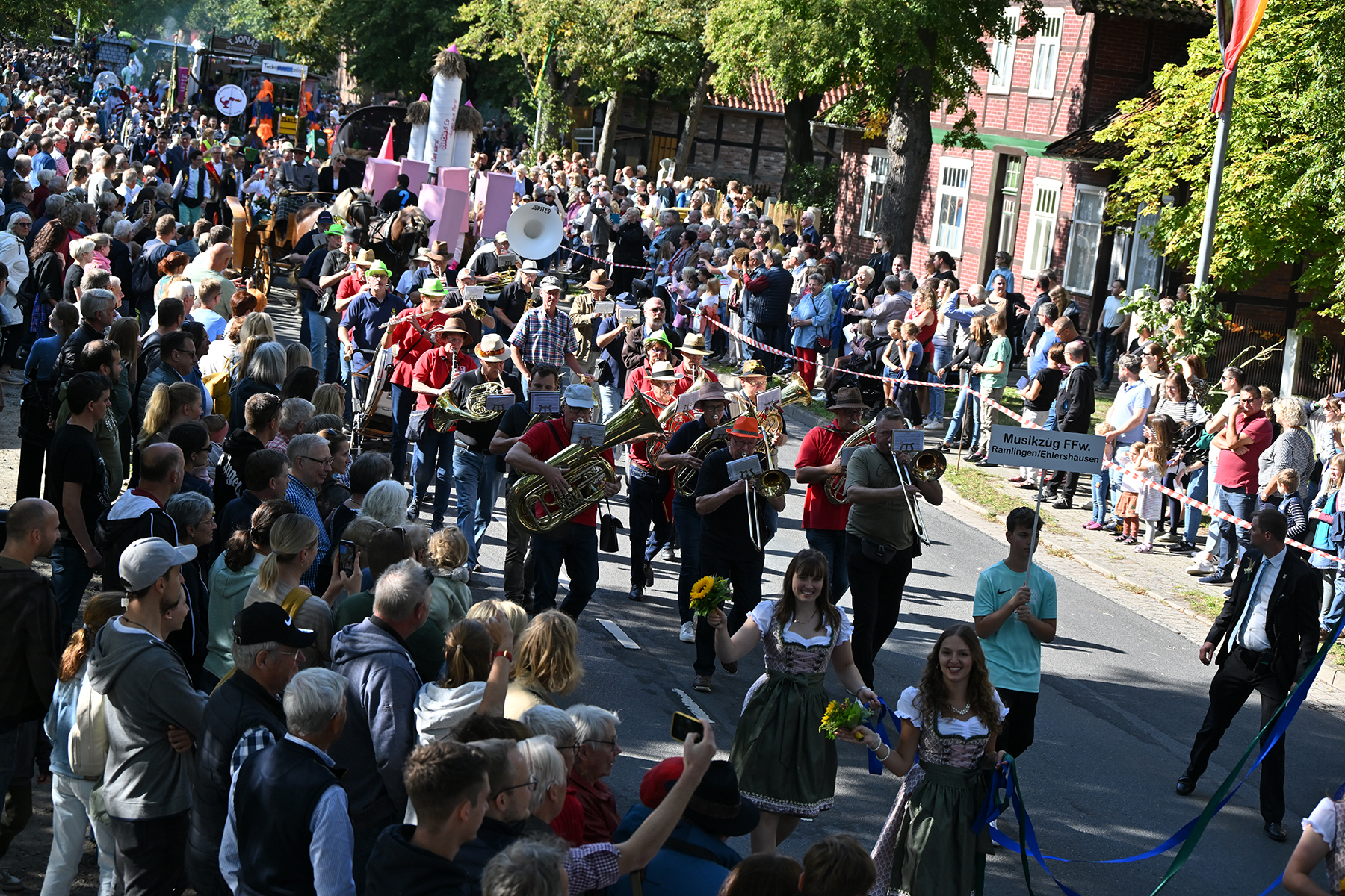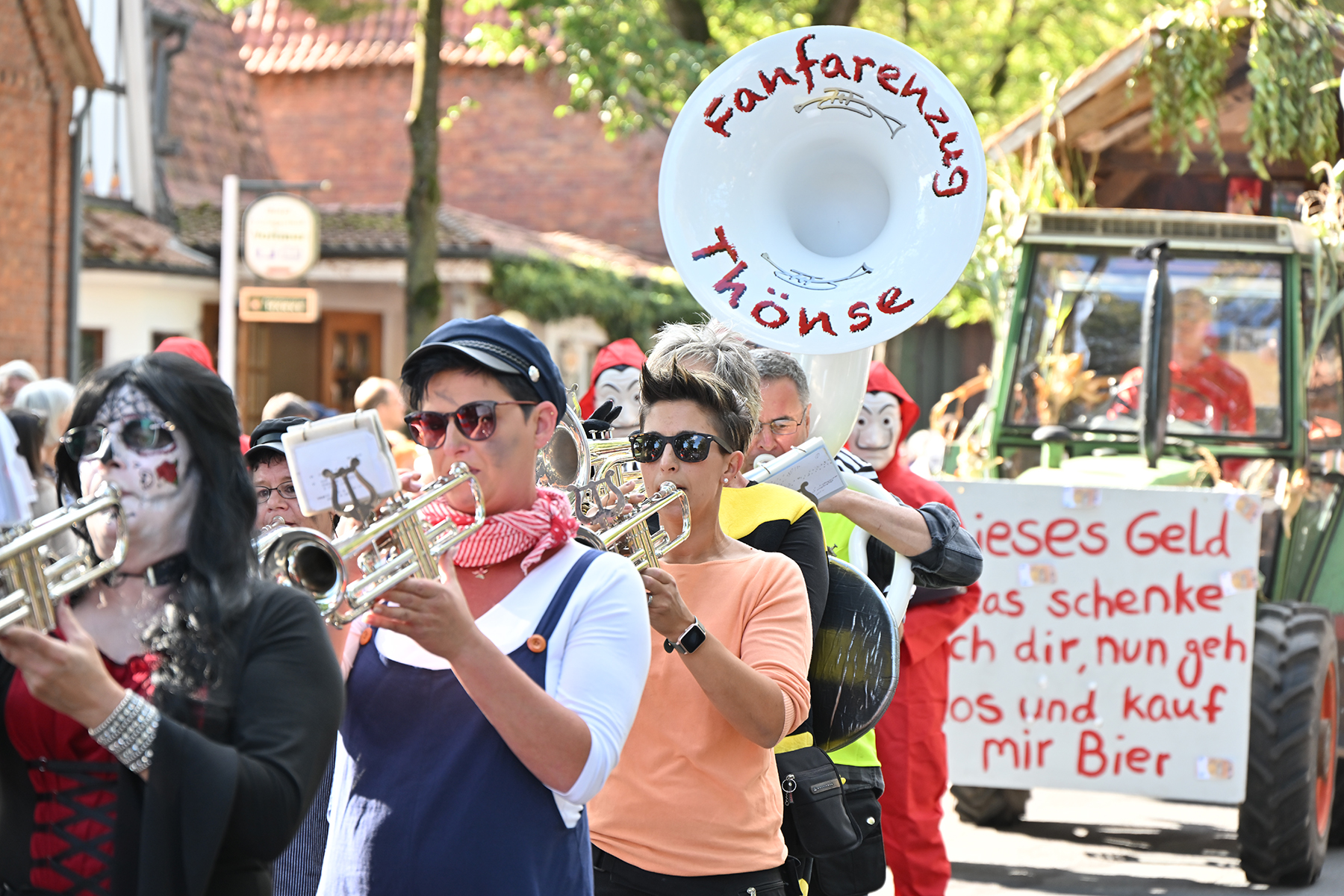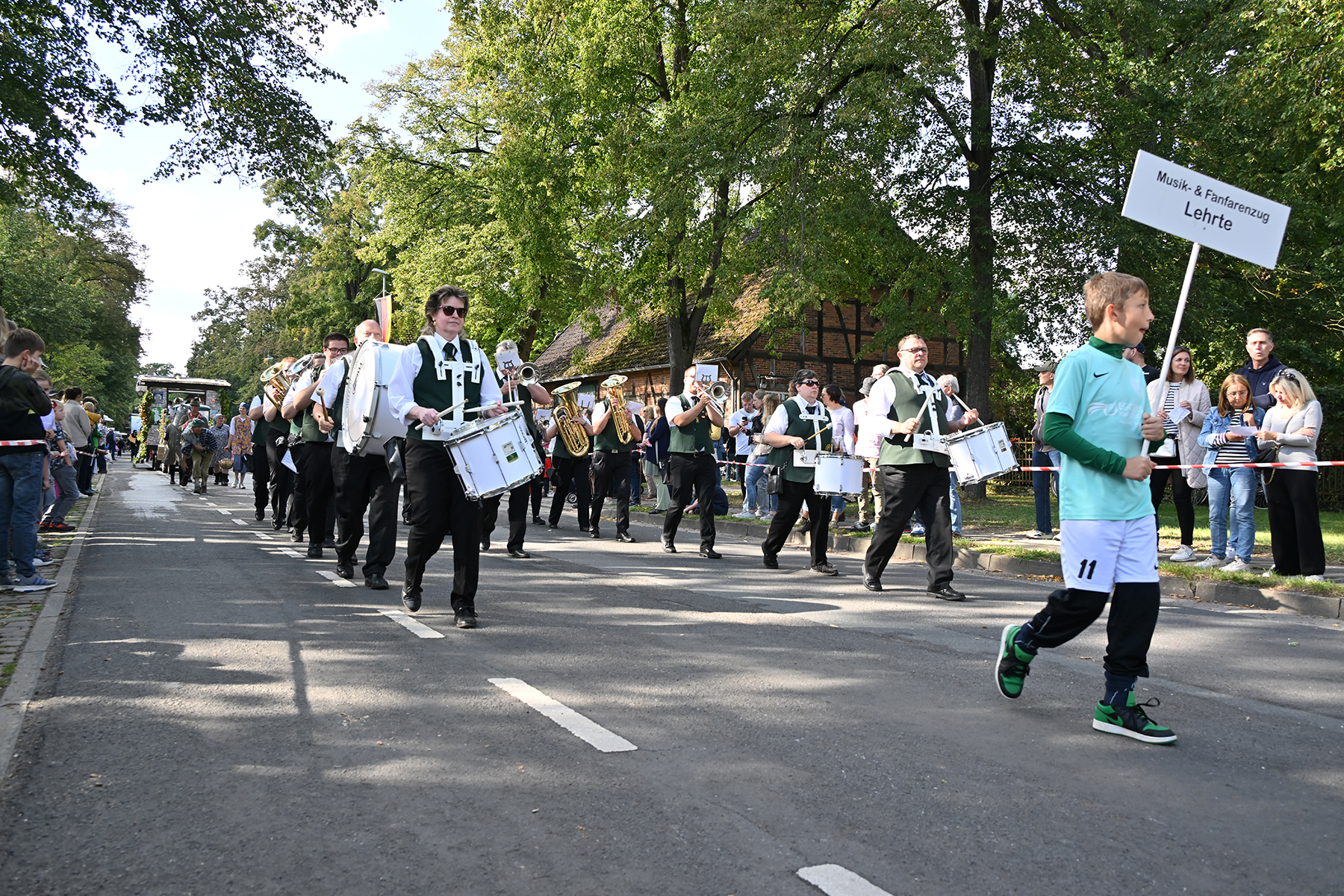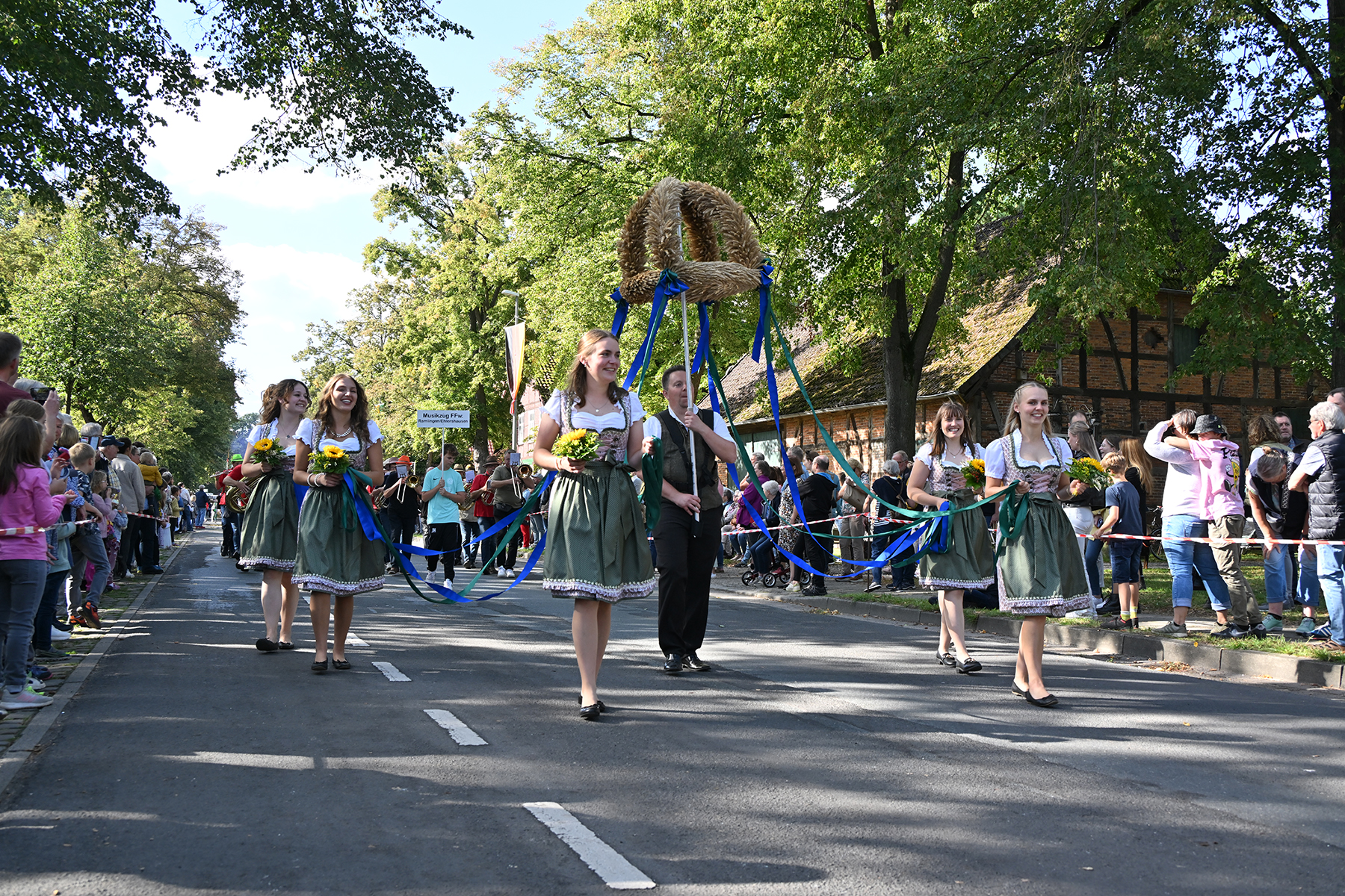 Anschließend reihten sich Erntekrone, Erntekönig und Ortsrat in den Zug ein, der dann zweimal durch den Ort führte. Begleitet wurde der Umzug vom Feuerwehrmusikzug Ramlingen-Ehlershausen, zum Fanfarencorps Thönse, vom Musikzug der Freiwilligen Feuerwehren Burgdorf und Hänigsen sowie vom Musik- und Fanfarenzug des Schützen-Corps Lehrte. Abgesichert wurde der Umzug wie immer von Ehrenamtlichen der Freiwilligen Feuerwehr Weferlingsen.