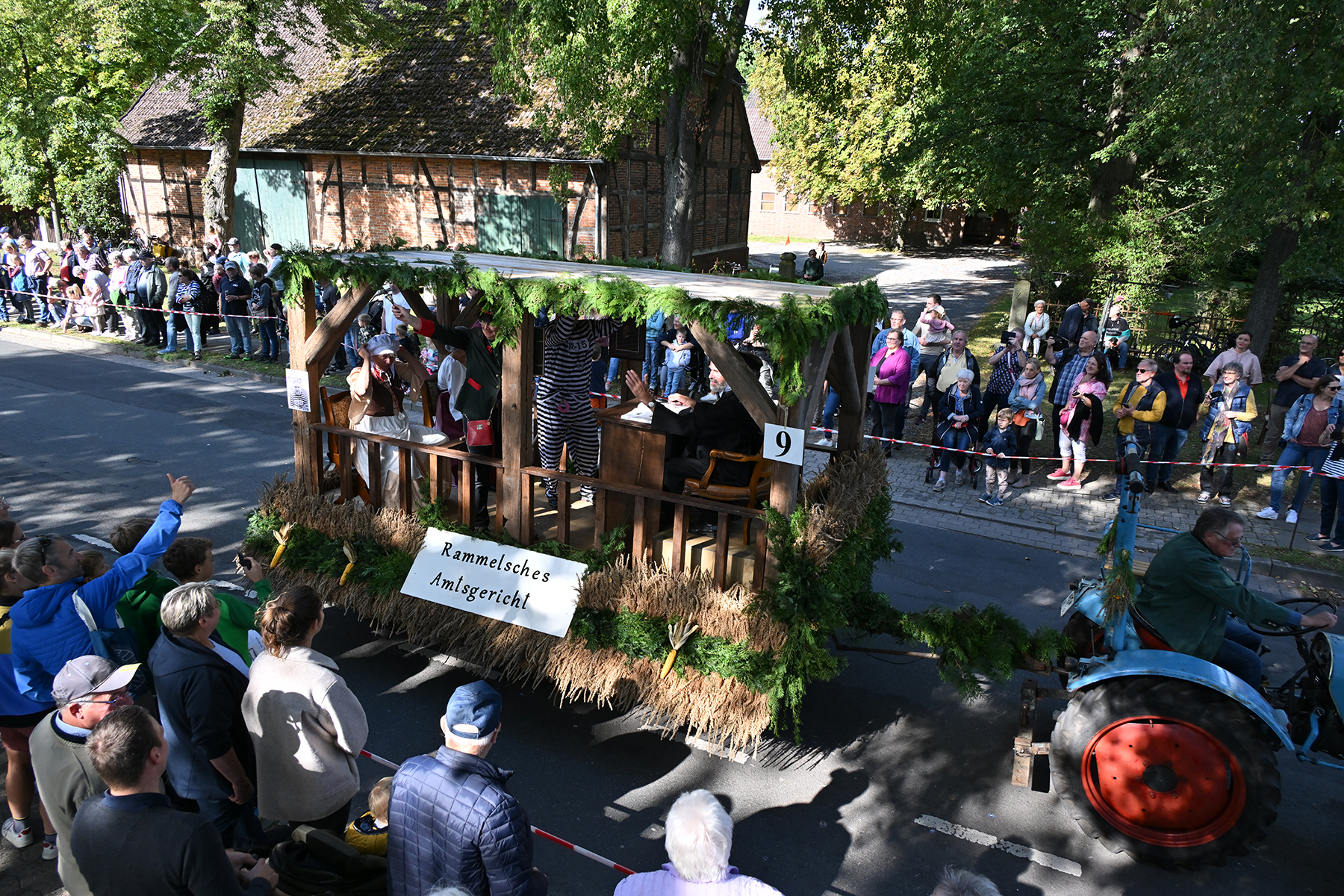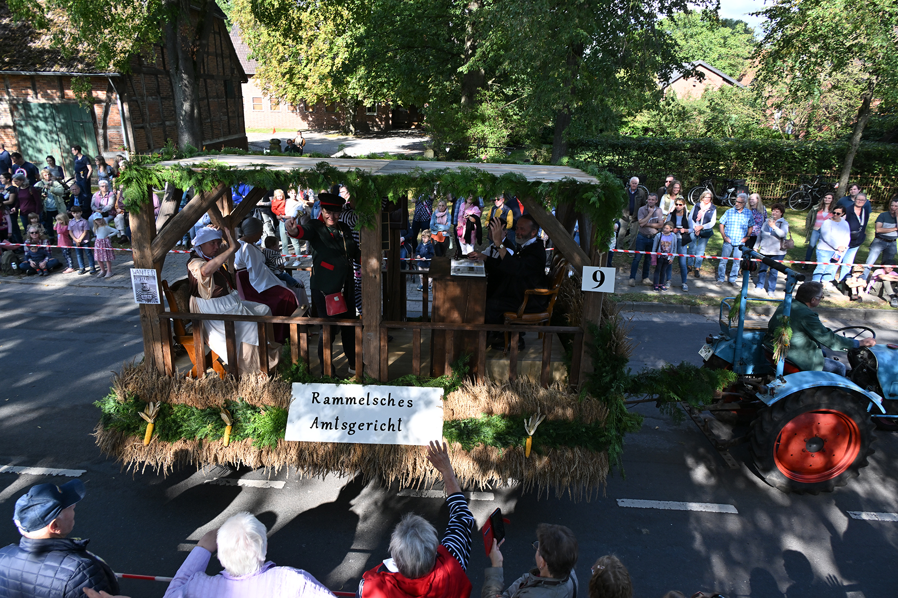 Die wohl schwerste Aufgabe des Tages hatte die Jury. Sie kam in diesem Jahr vom Motorsportverein "de Moorböcke" aus Großmoor. Das vierköpfige Team hatte sich bereits am gestrigen Sonnabend die Wagen und Fußgruppen angesehen, um am heutigen Sonntag den besten Erntewagen und die beste Fußgruppe bekannt geben zu können. Die Jury hatte es wie in den Vorjahren nicht einfach. Viele liebevolle Details der Wagen machten es schwierig, einen Gewinner zu ermitteln. Letztendlich waren alle Teilnehmer Gewinner, doch die beiden Siegerpokale mussten an jeweils ein Team gehen. So gewann bei den Erntewagen die Gruppe "Jules Verne – In 80 Minuten um Ramlingen" um Ortsbürgermeister Wolfram Nolte als Schaffner der Ramlinger Eisenbahngesellschaft vor dem Team "Die drei ??? – und der Raub der Erntekrone" und dem Team "Treibt das Wetter die Ernte vom Feld, schmuggeln Banden Mais für viel Geld".