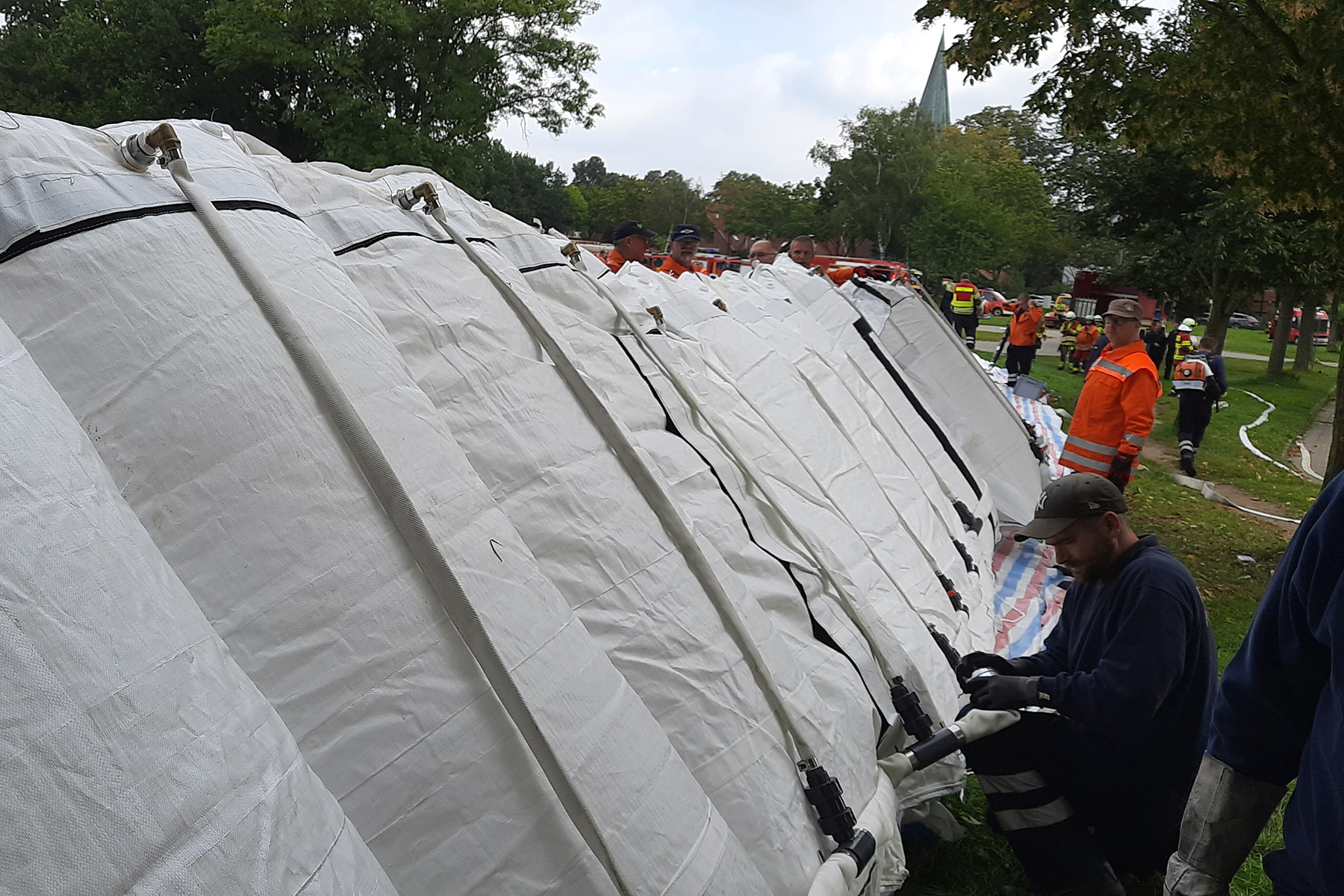 Ziel der angelegten Übung war es zum einen, die Einsatzkräfte in das Hochwasserschutzsystem einzuweisen und damit zu üben. Zum anderen ging es darum, die Führung und Kommunikation innerhalb einer Großschadenslage zu üben.