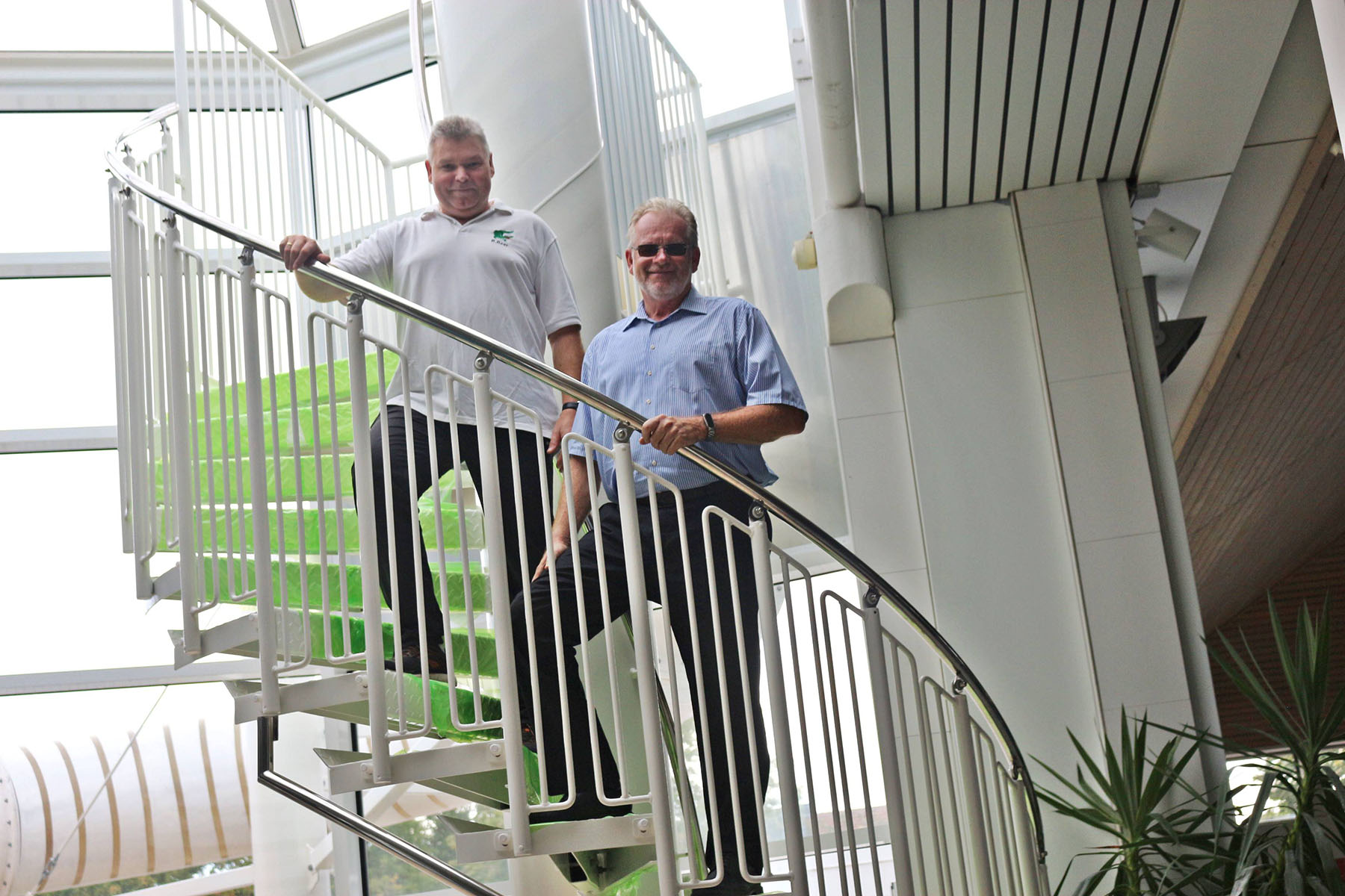 Schwimmmeister Ralf Beer und Stadtwerke-Geschäftsführer Frank Jankowski-Zumbrink (von links) vor dem Treppenaufgang zur 39 Meter langen Wasserrutsche. Damit bekommen große und kleine Wasserratten ihren neuen Wasserspaß. / Foto: Georg Bosse