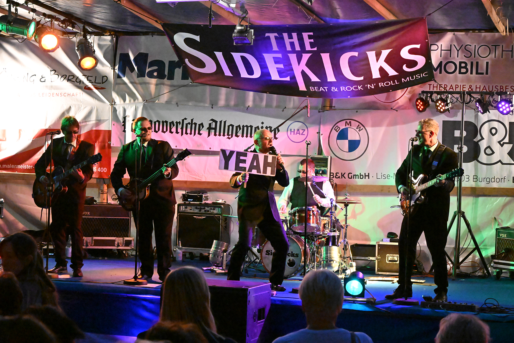 Den Auftakt machte um 17:30 Uhr die Band Gooseflesh auf der Bühne an der Post. Um 19 Uhr startete dann die Band Sidekicks, die auf der Bühne der Junggesellen hinter der Stadtsparkasse auftraten. Spoiler vorweg: Ihr Set war das längste. Während auf den anderen Bühnen die Live-Musik mit Zugaben beendet waren, hörten die Sidekicks Punkt 23 Uhr auf, wie es die Vorgaben verlangten. Eine weitere Zugabe war mit Fingerzeig auf die Uhr nicht mehr möglich.