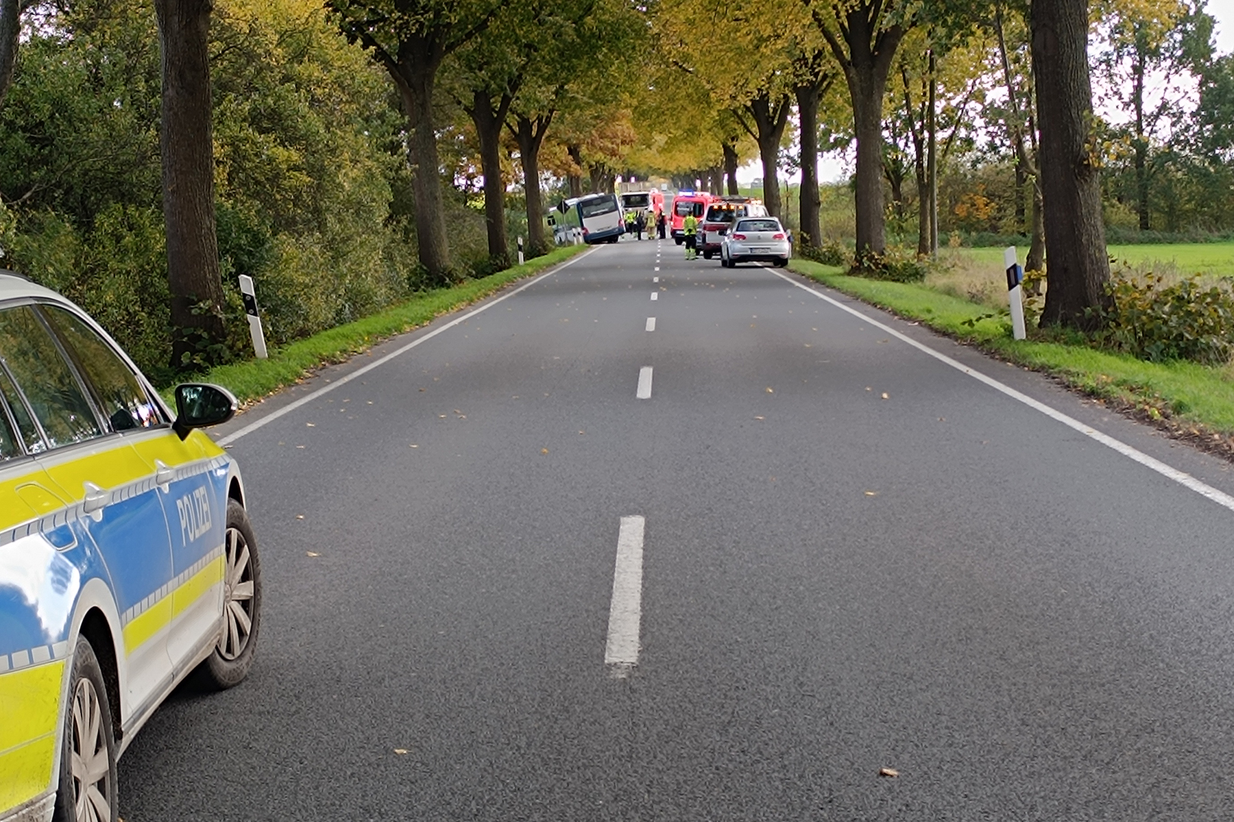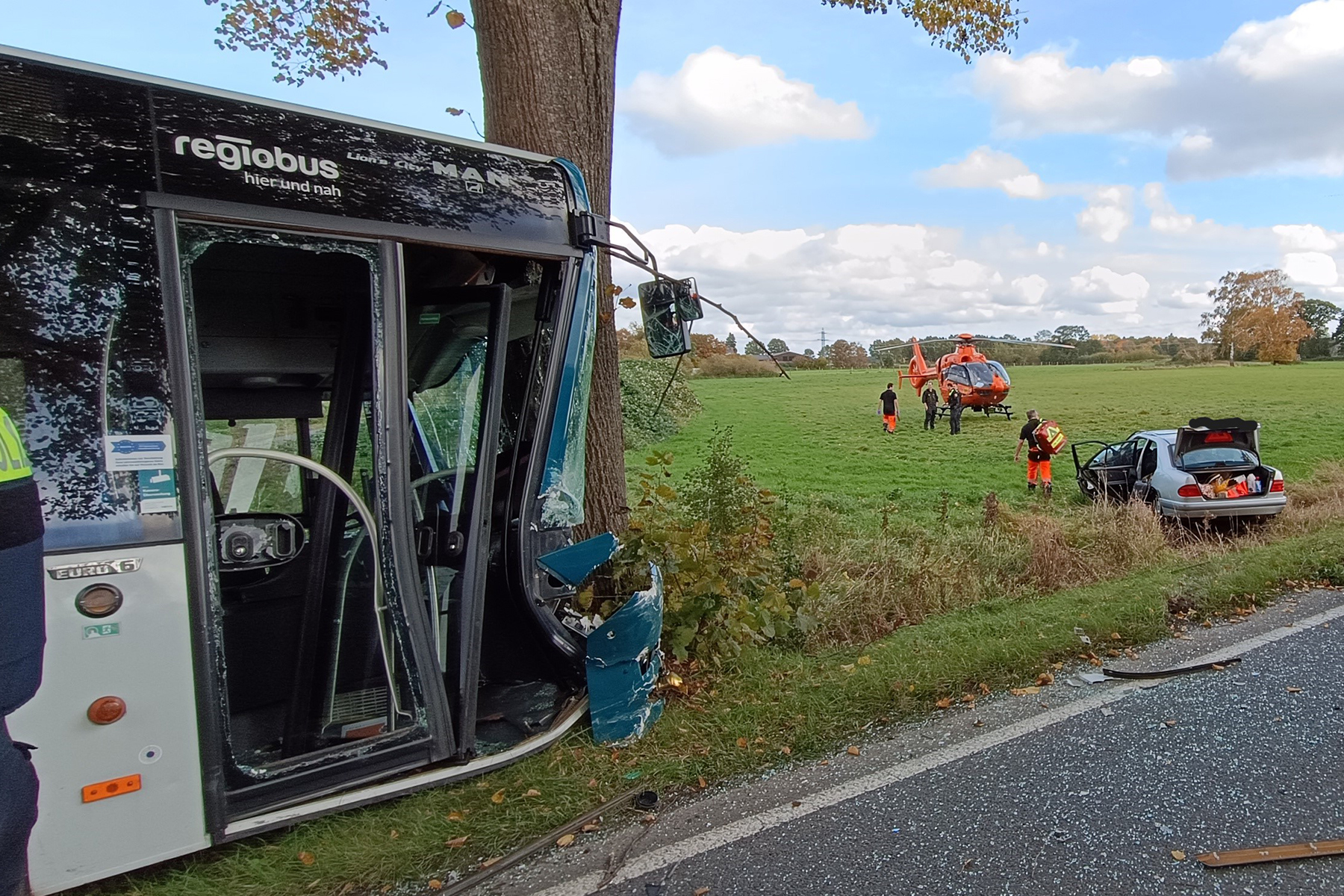 Vor Ort bot sich den Einsatzkräften ein Bild mit einem gegen einen Baum gefahrenen Bus sowie ein auf dem Feld stehendes Auto. Augenscheinlich hatte es vor dem Unfall zwischen diesen beiden Fahrzeugen Kontakt gegeben, teilt die Feuerwehr mit. Zum Glück gab es keine eingeklemmten Personen, so dass die Feuerwehrkräfte keine Menschenrettung mit hydraulischem Rettungsgerät vornehmen mussten.