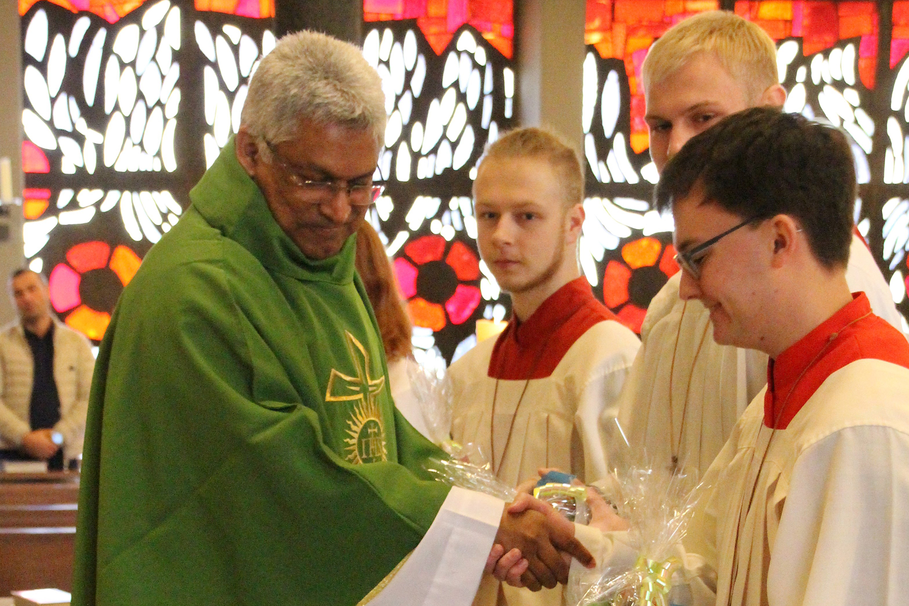 Pater Cherian dankte allen Dreien für die vielen Jahre am Dienst für die Gemeinde. Es sei nicht selbstverständlich, dass sich junge Menschen nach ihrer Erstkommunion kirchlichen Aufgaben widmen und damit wesentlich zur Gestaltung der Gottesdienste beitragen wollen. Pater Cherian wies in seinen Dankesworten auch noch einmal darauf hin, dass er hoffe, dass sich alle drei auch weiterhin für die Gemeinde engagieren. "Wir sind mit jungen Menschen nicht gerade reich gesegnet", so der Pater. Darum sei es wichtig, dass gerade sie, die sich über viele Jahre in der Gemeinde eingebracht haben, diese Freude an kirchlicher Gestaltung an Jüngere weitergeben.