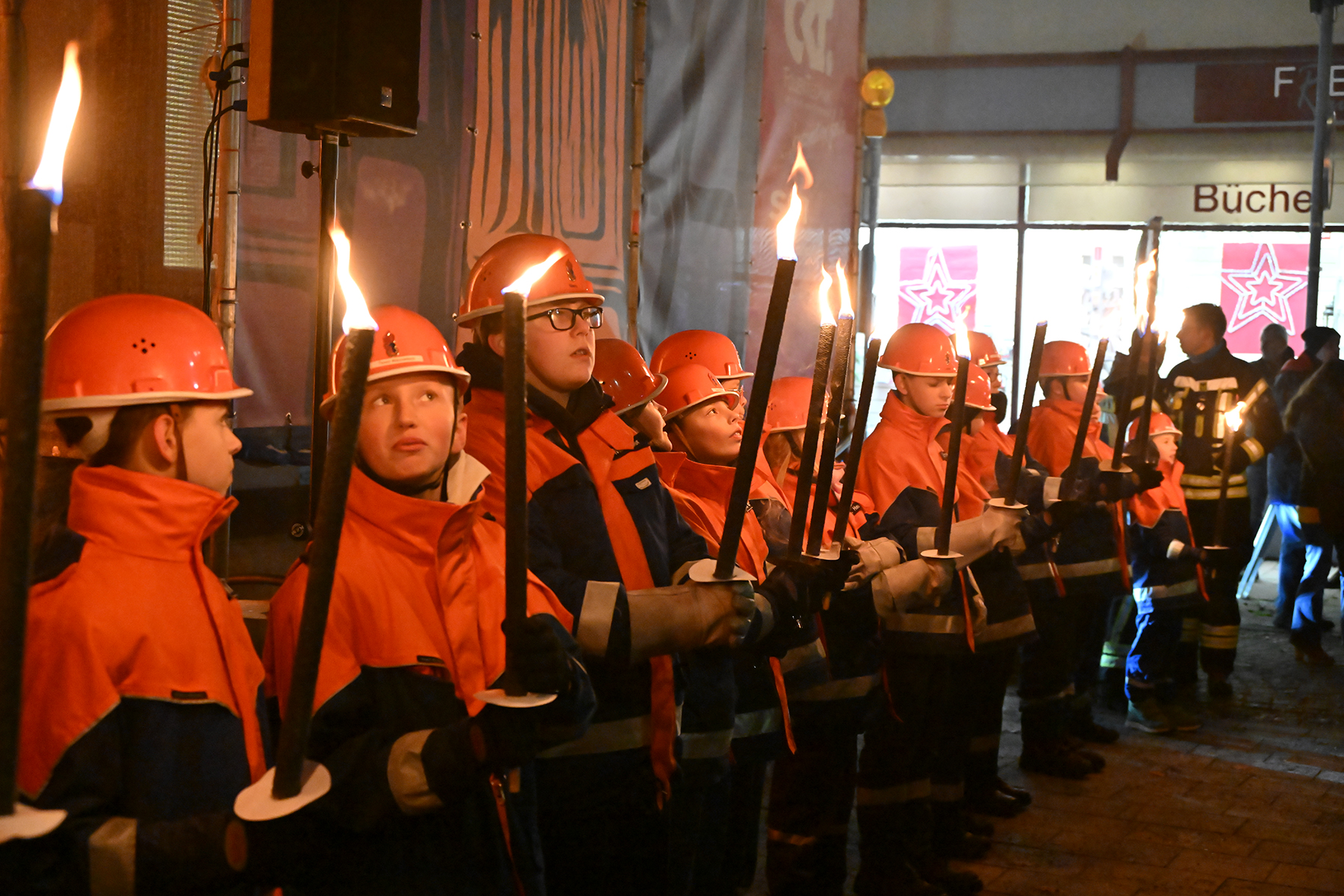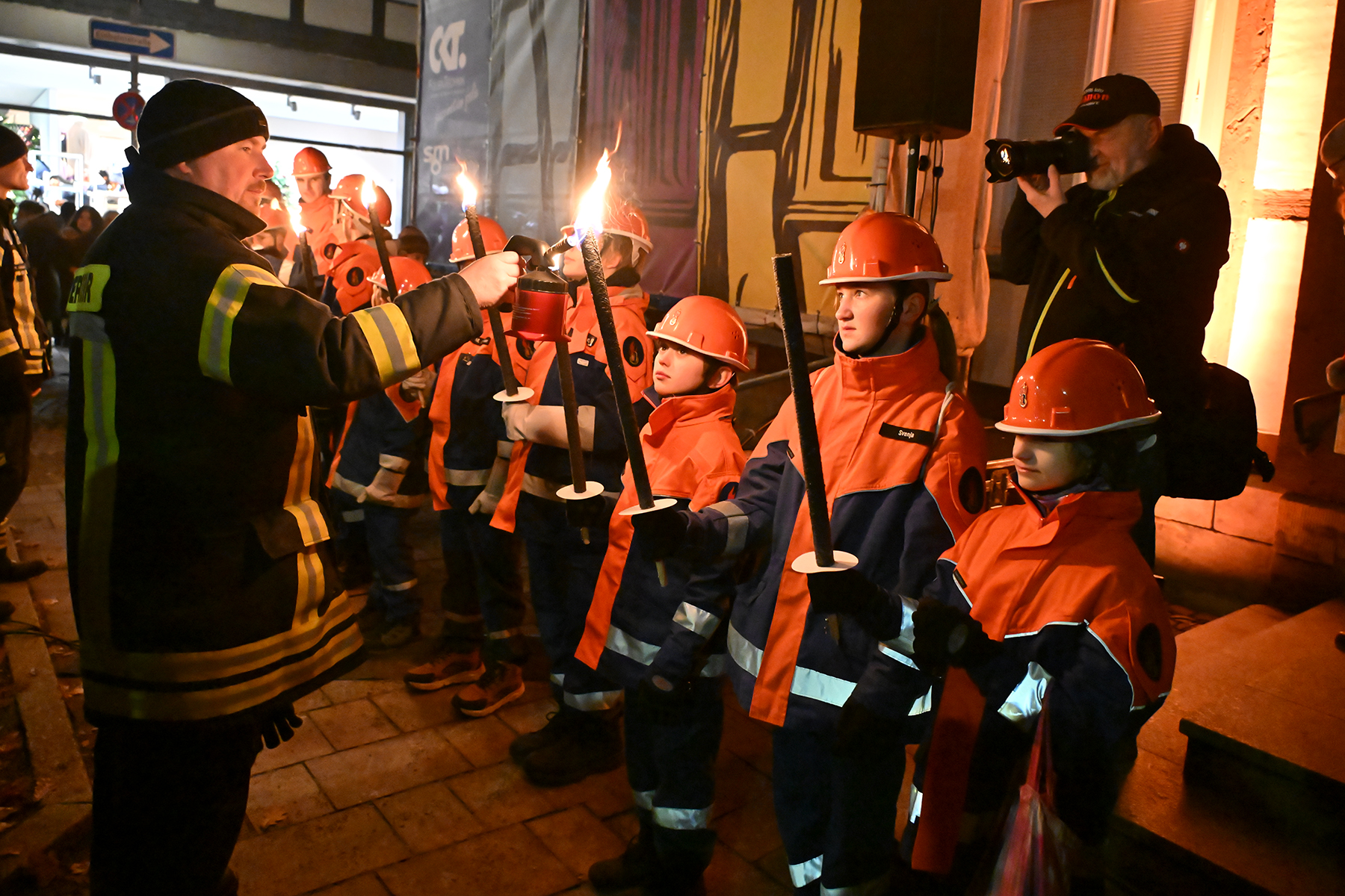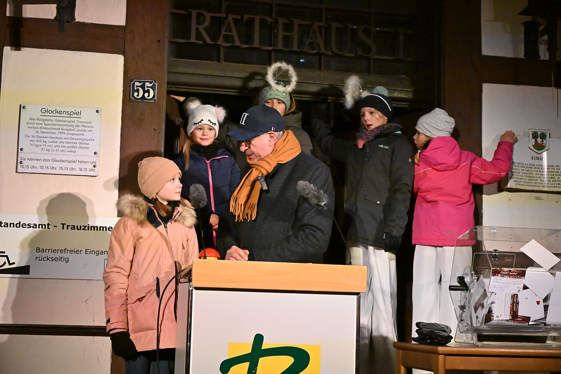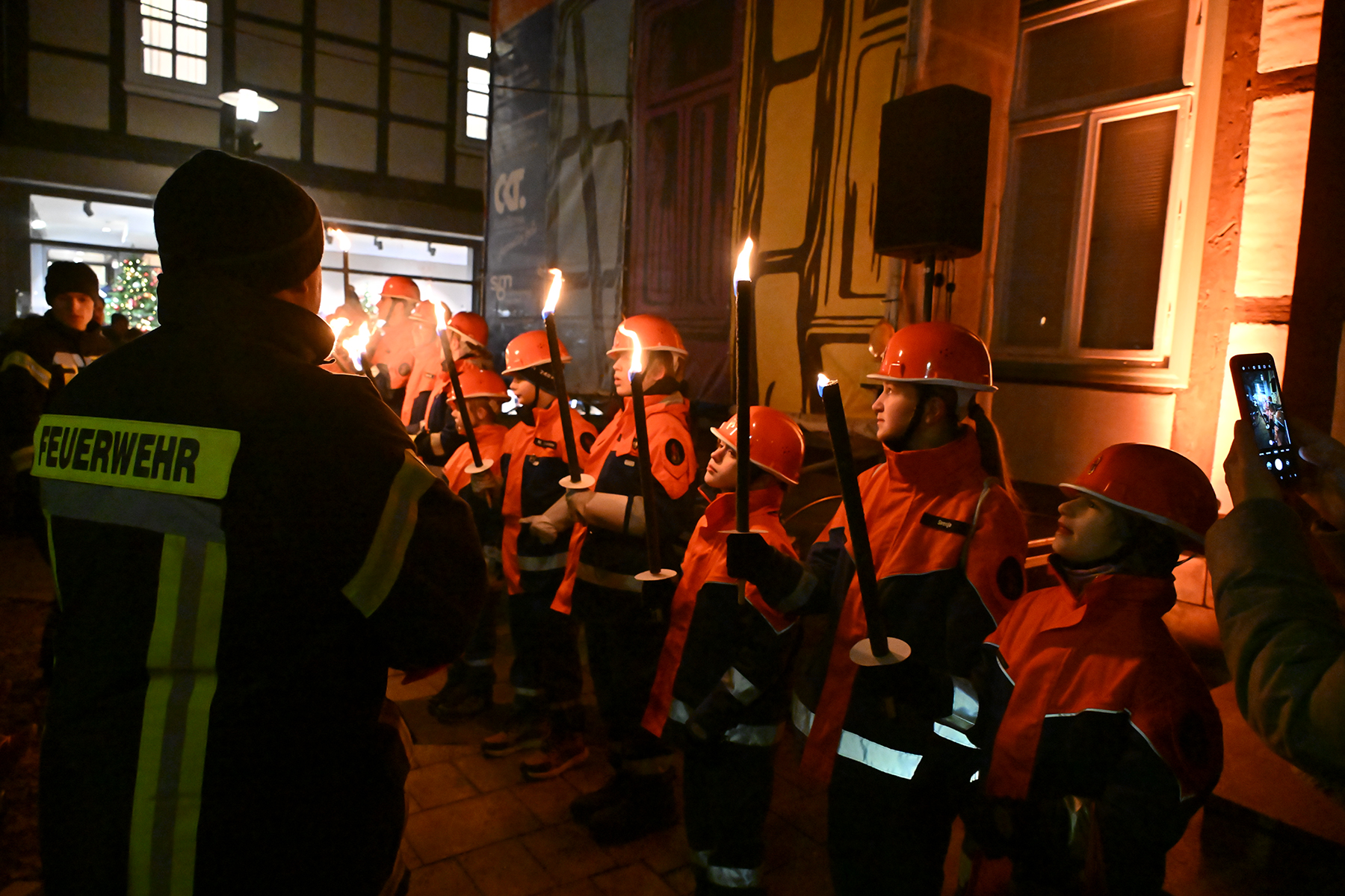 Zuvor hatte die neunjährige Elina den roten Buzzer gedrückt und damit die Weihnachtsbeleuchtung in Burgdorf eingeschaltet. Lautstark wurde von Zehn der Countdown von den Anwesenden heruntergezählt und bei Null mit Freude die eingeschaltete Weihnachtsbeleuchtung betrachtet. 230.000 Lichter leuchten nun in der Innenstadt, wie der Bürgermeister verriet. Er dankte den Organisatoren und Sponsoren. "Wir würden das nicht hinbekommen ohne die Sponsoren", so der Bürgermeister. Rund 70 Unternehmen und Vereine unterstützen die Weihnachtsbeleuchtung. Auch in diesem Jahr waren Mitglieder der Jugendfeuerwehren der Stadt Burgdorf mit Fackeln vor Ort und illuminierten die Szenerie vor dem Rathaus I.
