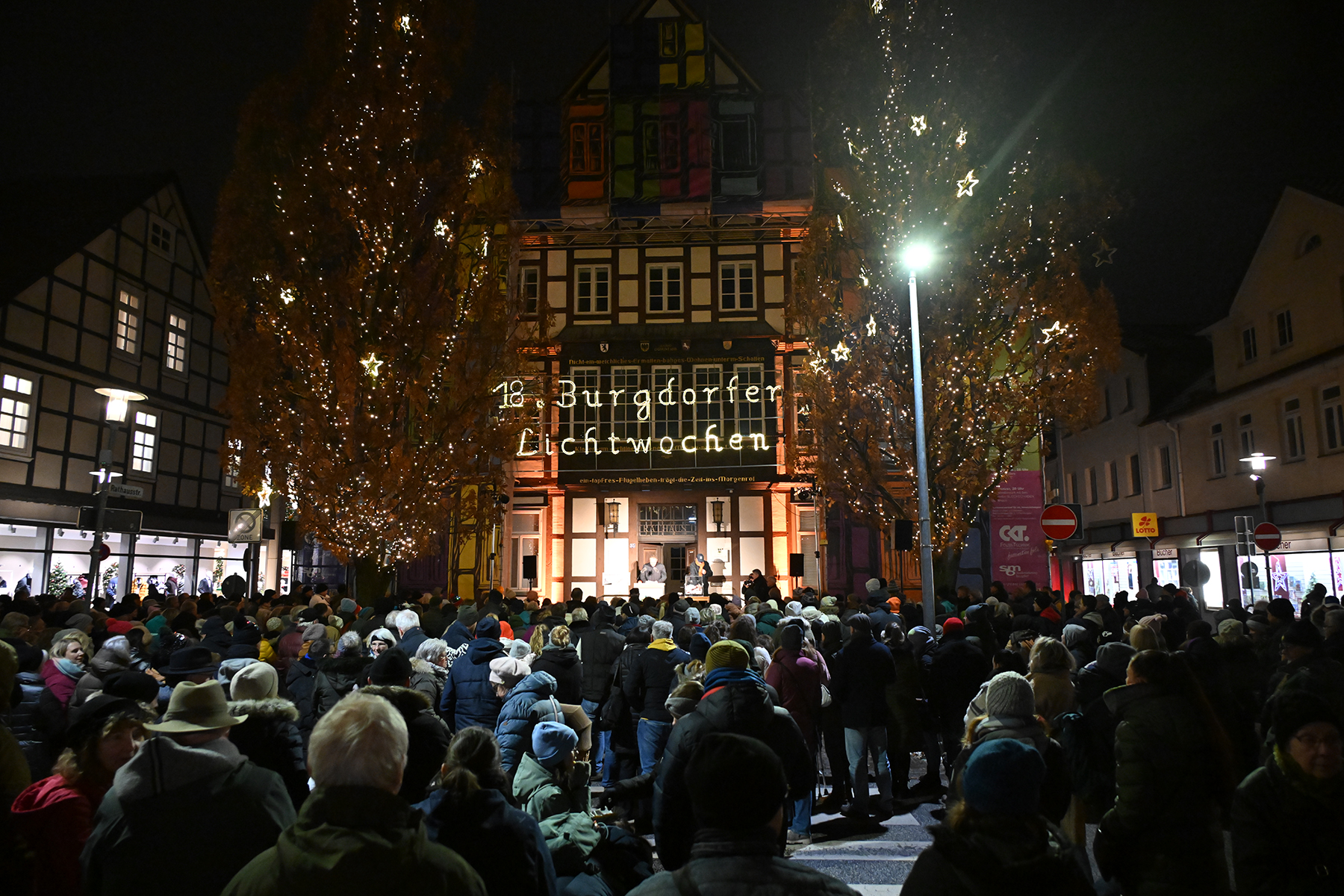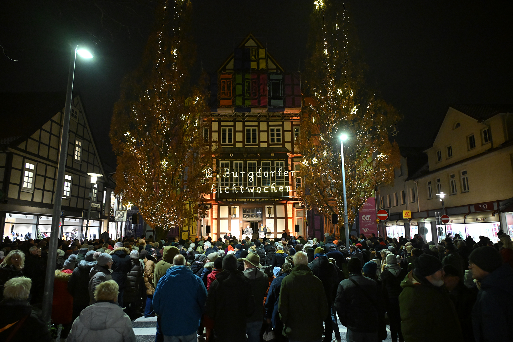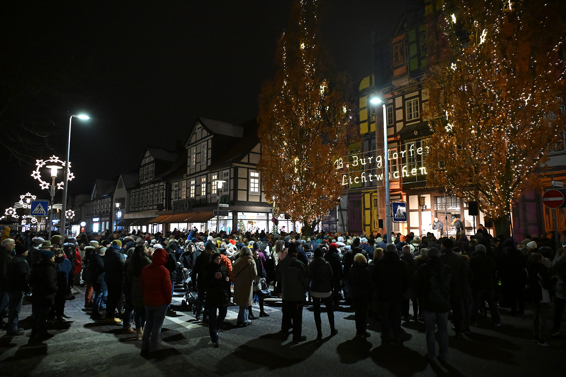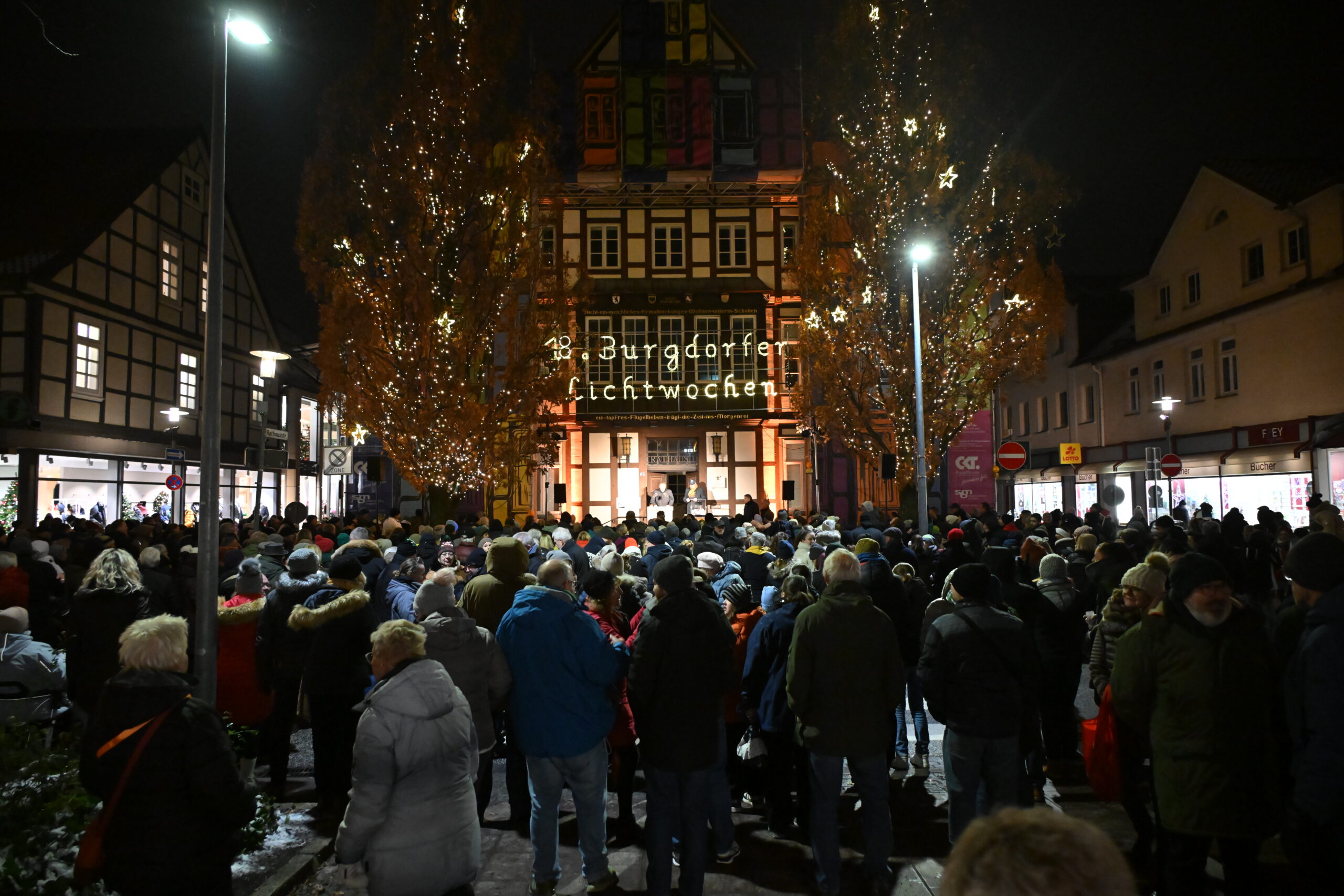 Ein wenig fehlte dann aber doch ein wichtiger Teil der Eröffnung der Lichtwochen: Das Fanfarencorps "Wikinger" Burgdorf bringt die Besucher vor dem Rathaus I in der Burgdorfer Marktstraße normalerweise in Stimmung. In diesem Jahr mussten die Musiker kurzfristig absagen. "Aufgrund der niedrigen Temperaturen", wie Bürgermeister Armin Pollehn den mehreren Hundert Besuchern vor dem Rathaus und auf der für den Fahrzeugverkehr gesperrten Marktstraße erklärte. Die Instrumente könnten bei Minustemperaturen Schaden nehmen.