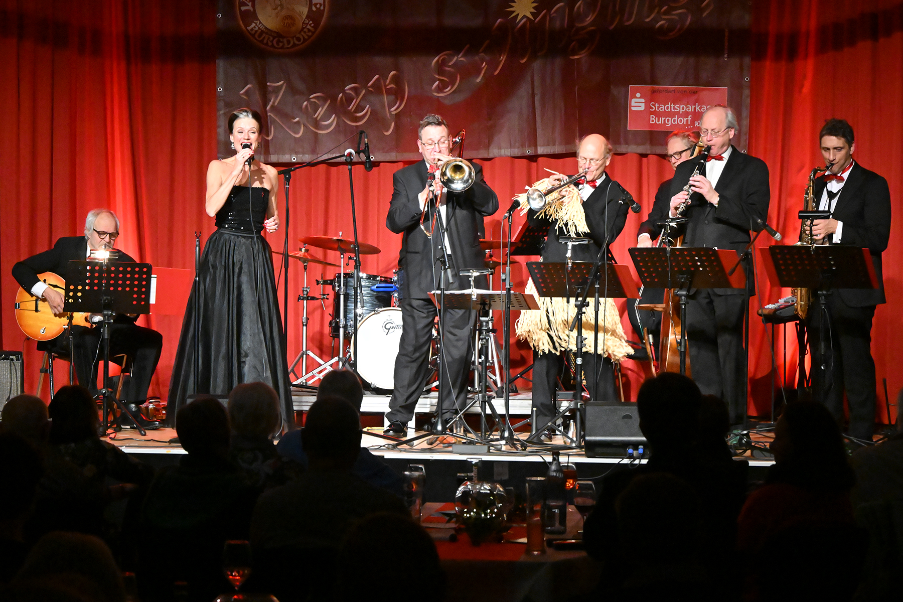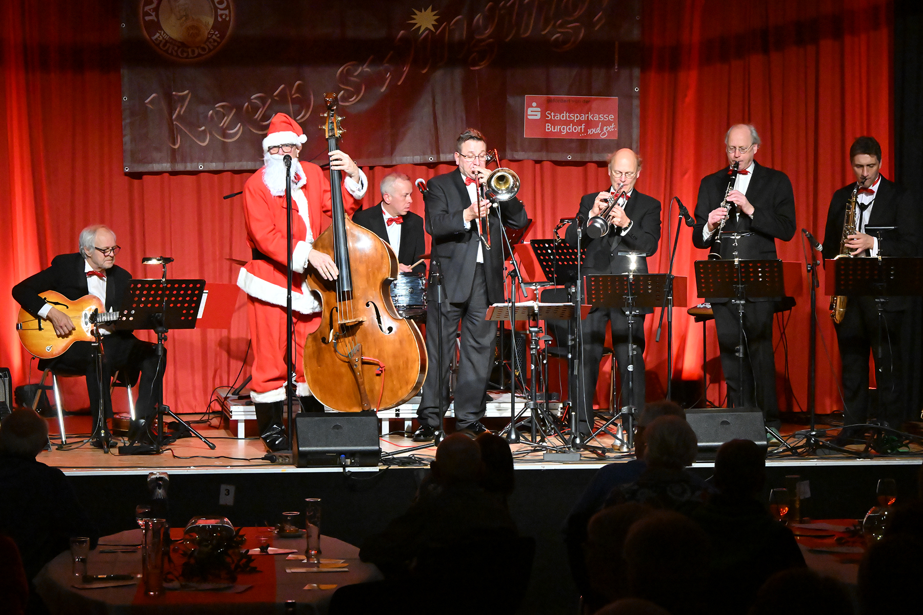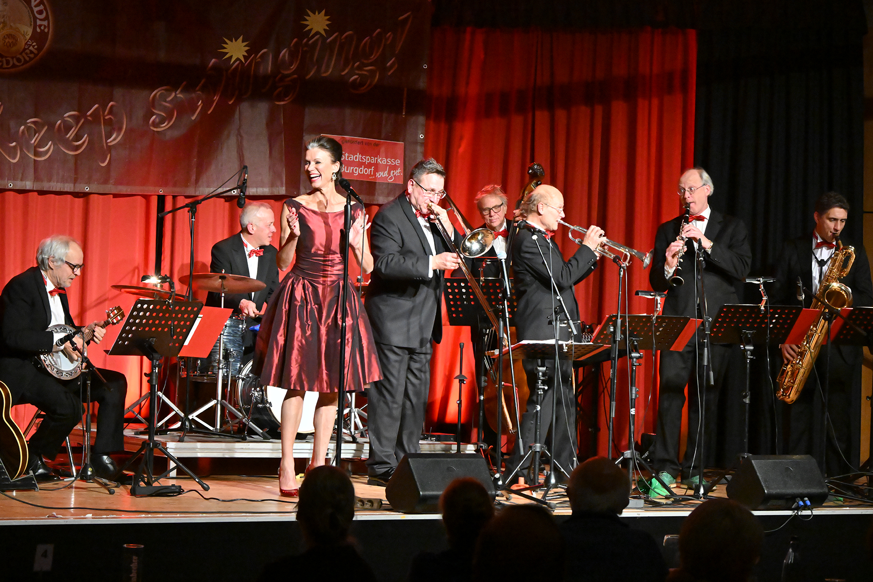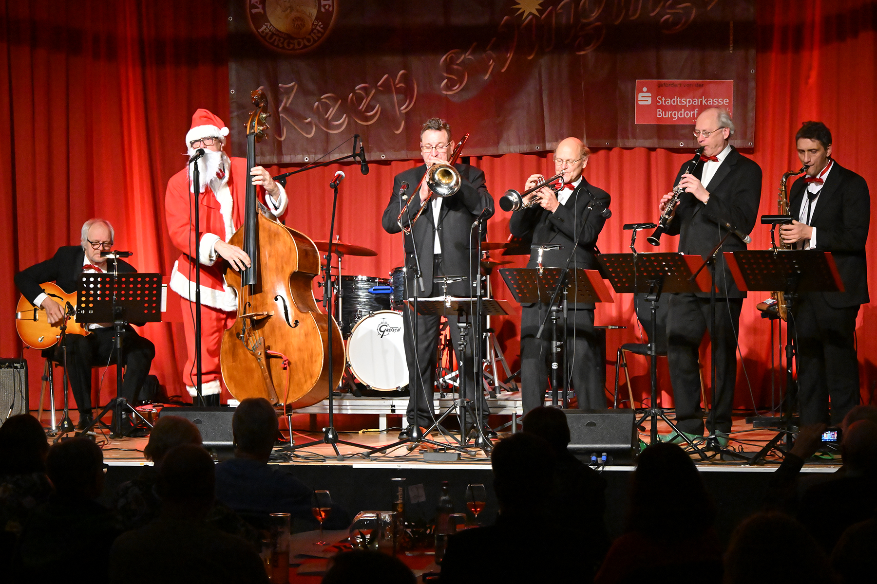 Unter dem Motto "Wonderful Christmas Time" hatten die Jazzfreunde Burgdorf am gestrigen Sonnabend, 9. Dezember 2023, zu einem glanzvollen Konzert im ausverkauften Saal des Stadthauses Burgdorf eingeladen. Joe Wulf & The Gentlemen of Swing präsentierten in unnachahmlicher Art und Weise ihre mitreißende Musik, so dass die Tanzfläche immer gefüllt war. Die Swingtänzer hatten wieder keine Entfernung gescheut, um in Burgdorf zu "performen". Selbst die Band war begeistert.