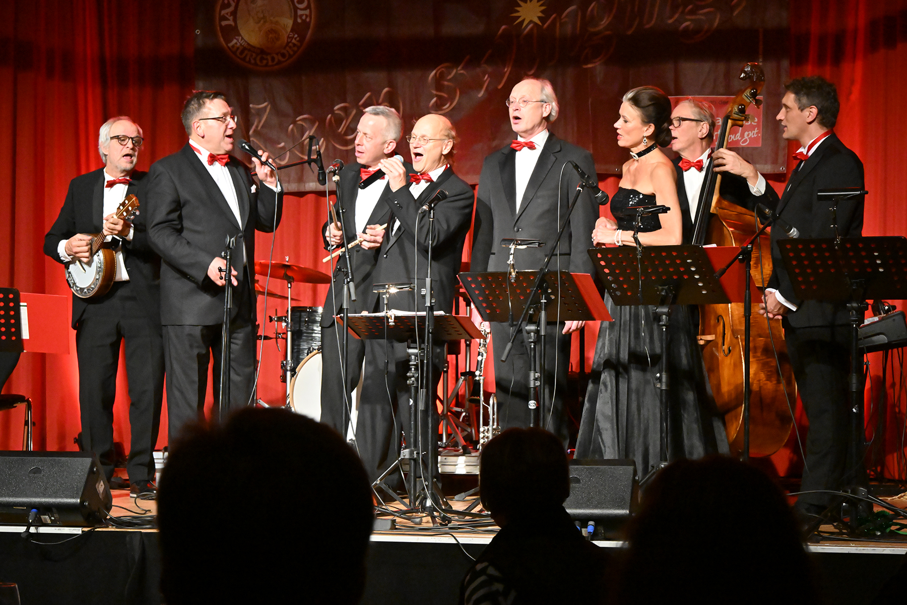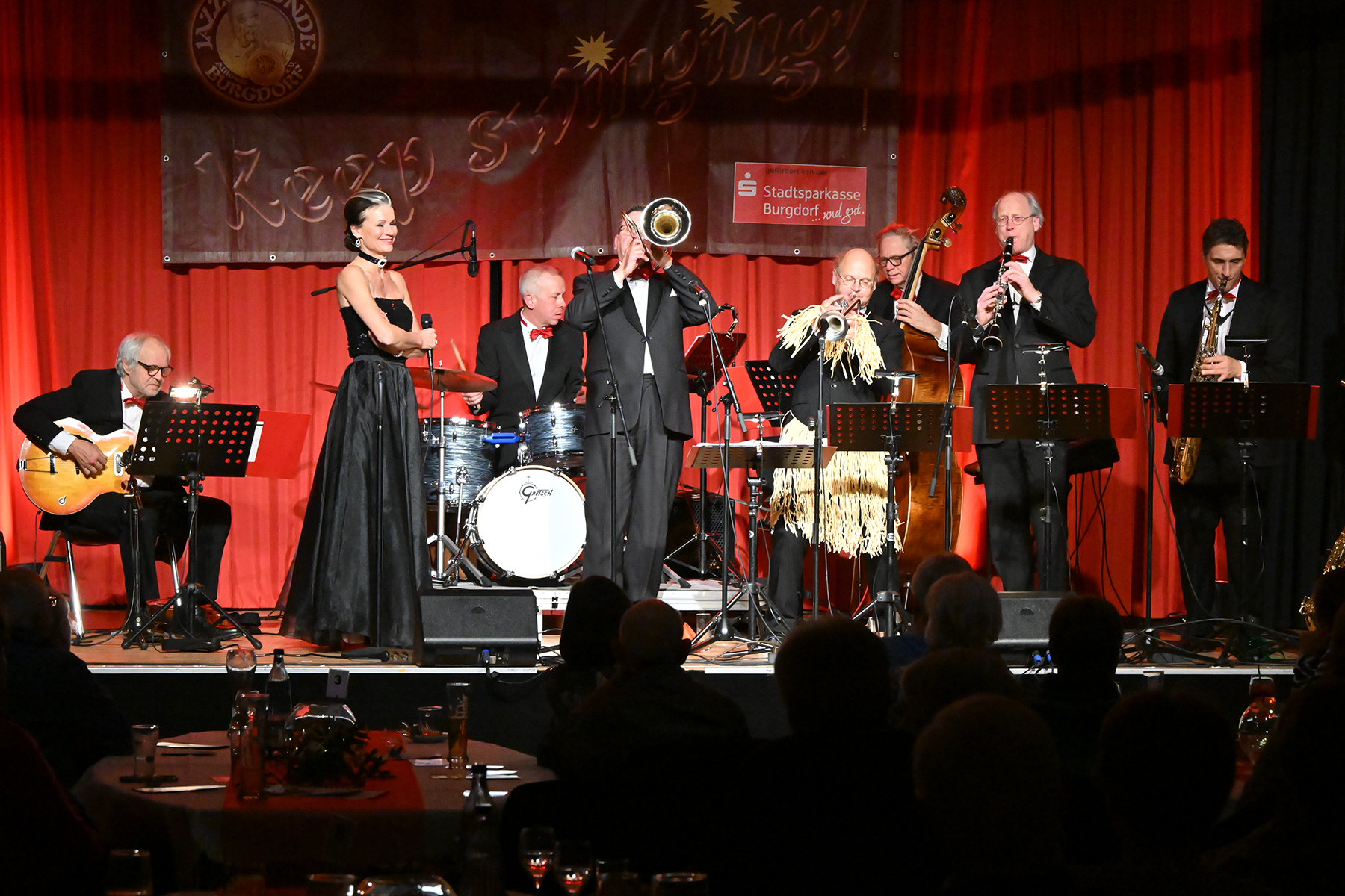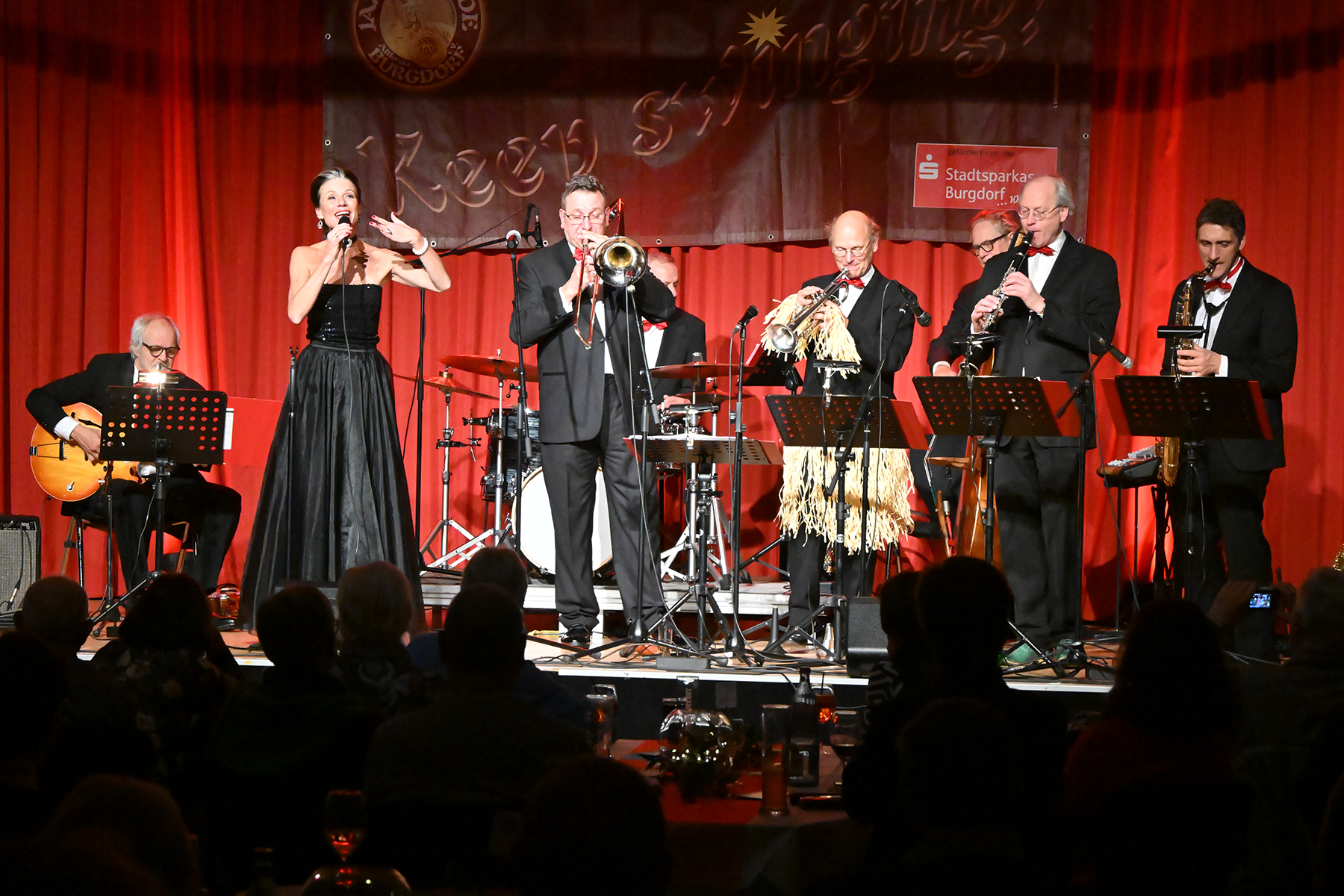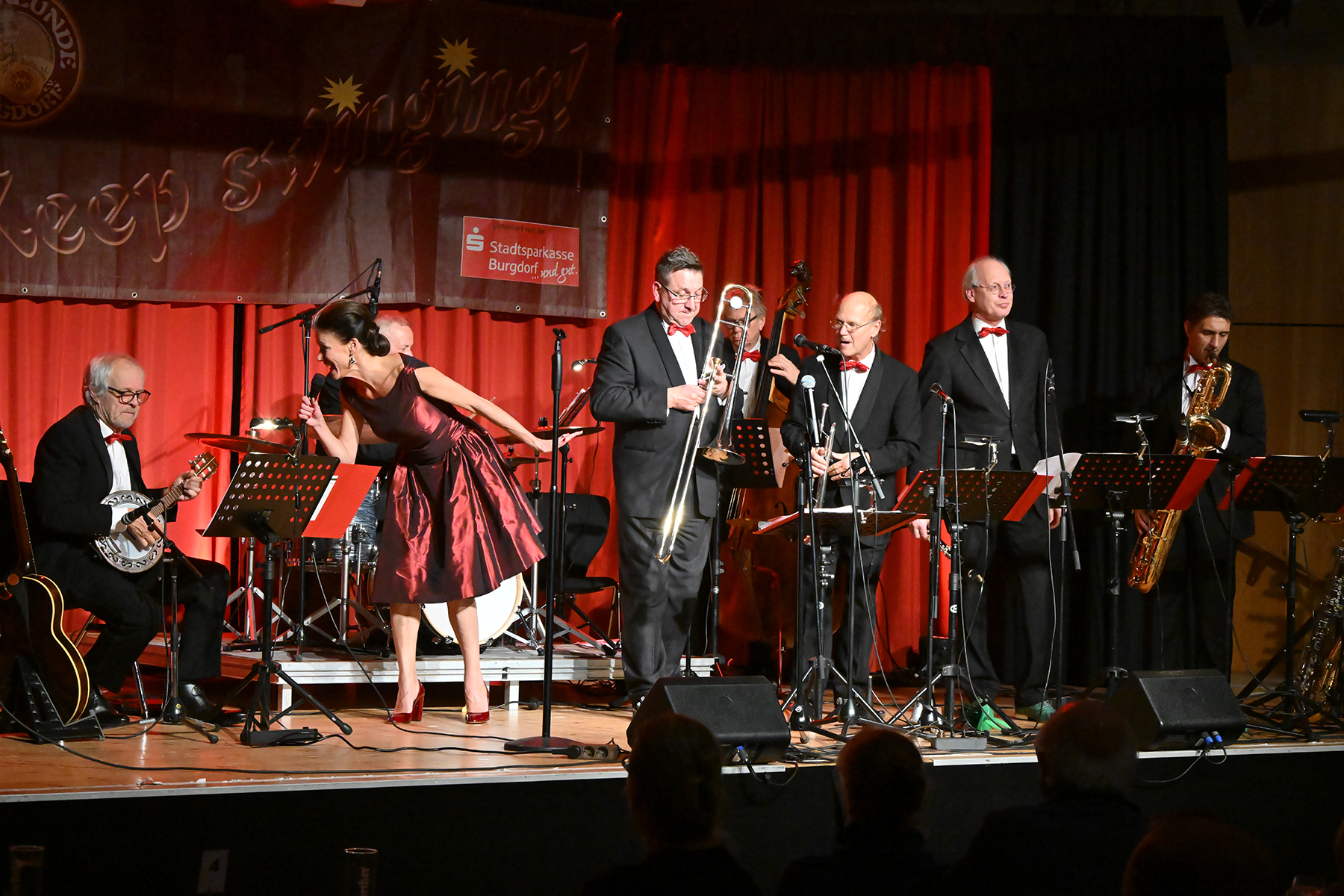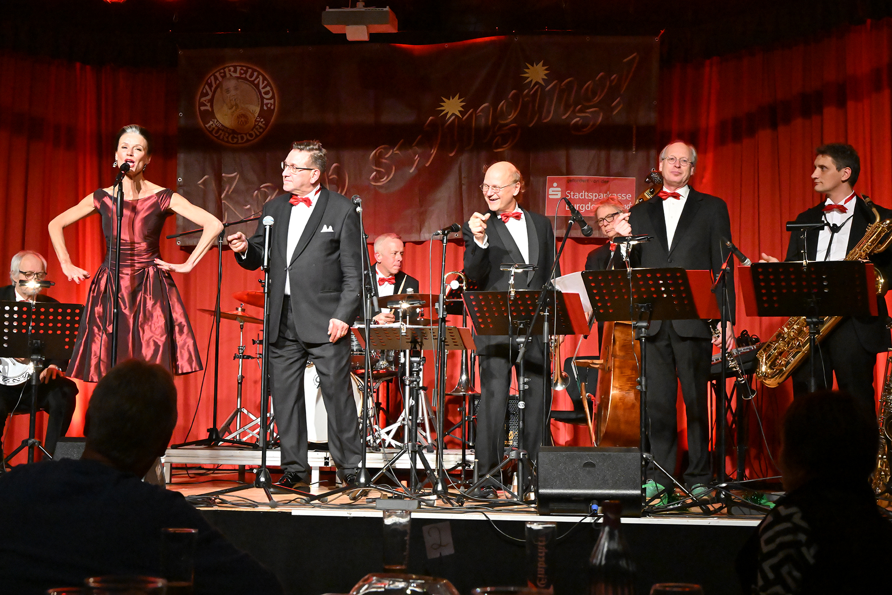 Unter dem Motto "Wonderful Christmas Time" hatten die Jazzfreunde Burgdorf am gestrigen Sonnabend, 9. Dezember 2023, zu einem glanzvollen Konzert im ausverkauften Saal des Stadthauses Burgdorf eingeladen. Joe Wulf & The Gentlemen of Swing präsentierten in unnachahmlicher Art und Weise ihre mitreißende Musik, so dass die Tanzfläche immer gefüllt war. Die Swingtänzer hatten wieder keine Entfernung gescheut, um in Burgdorf zu "performen". Selbst die Band war begeistert.