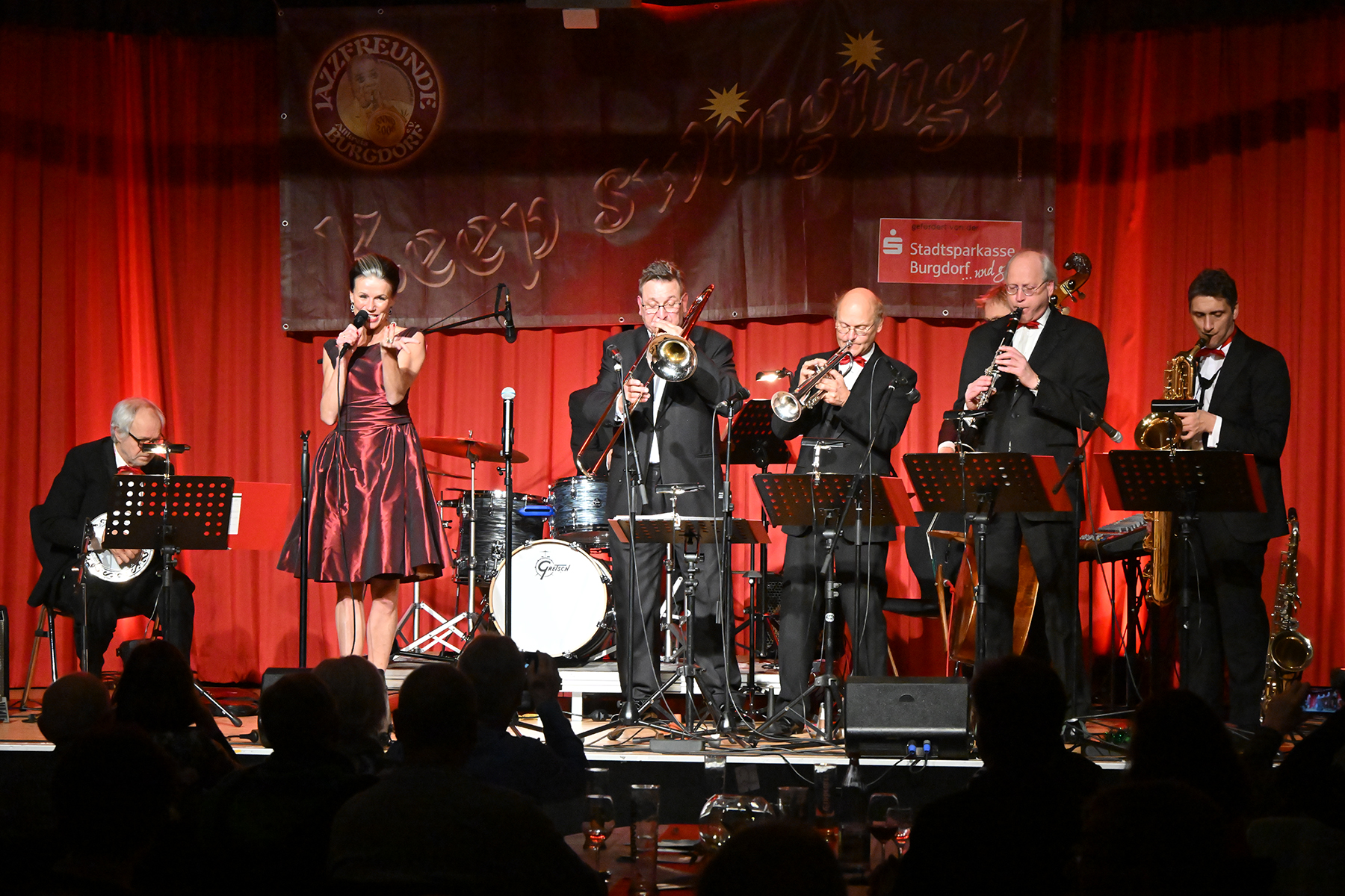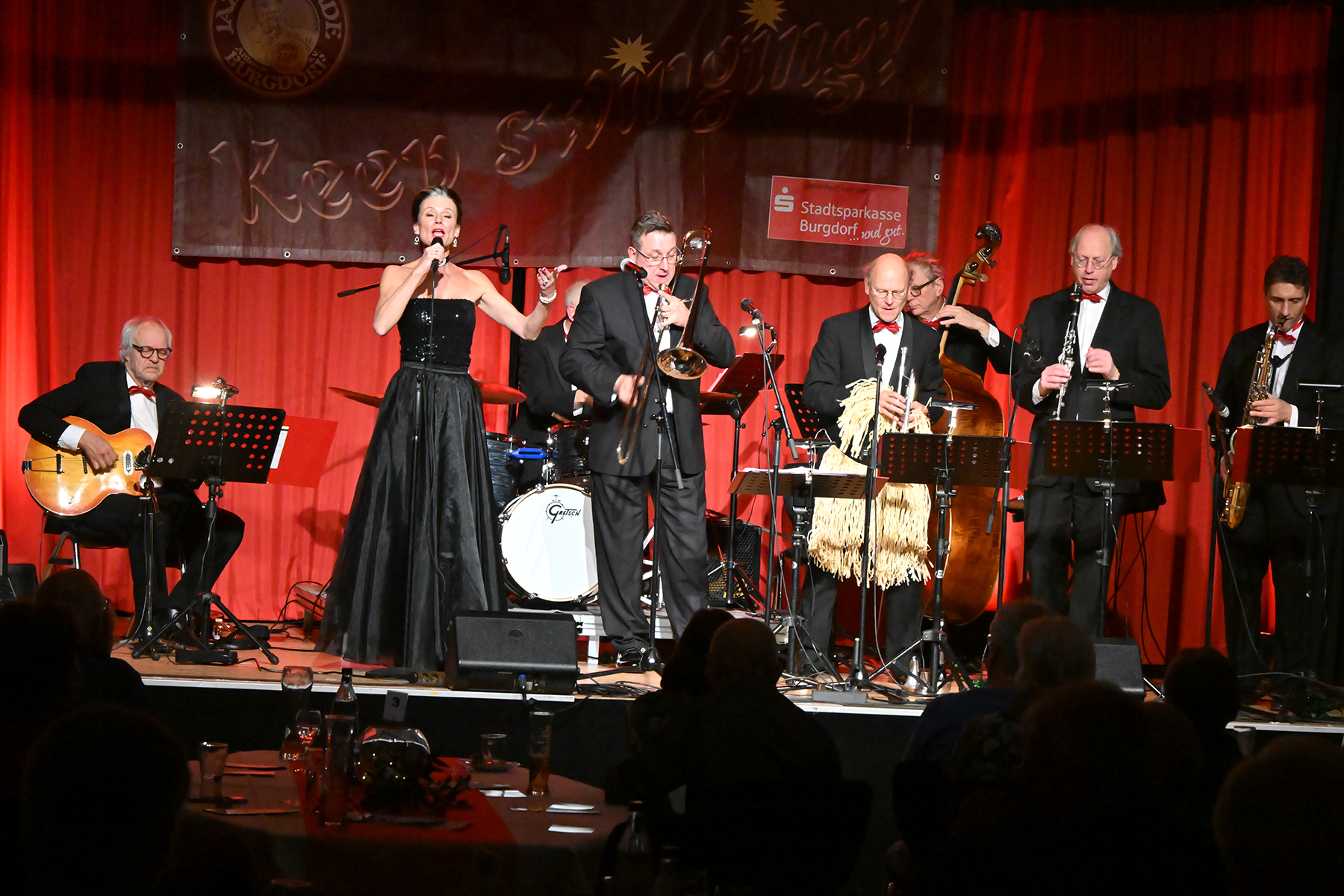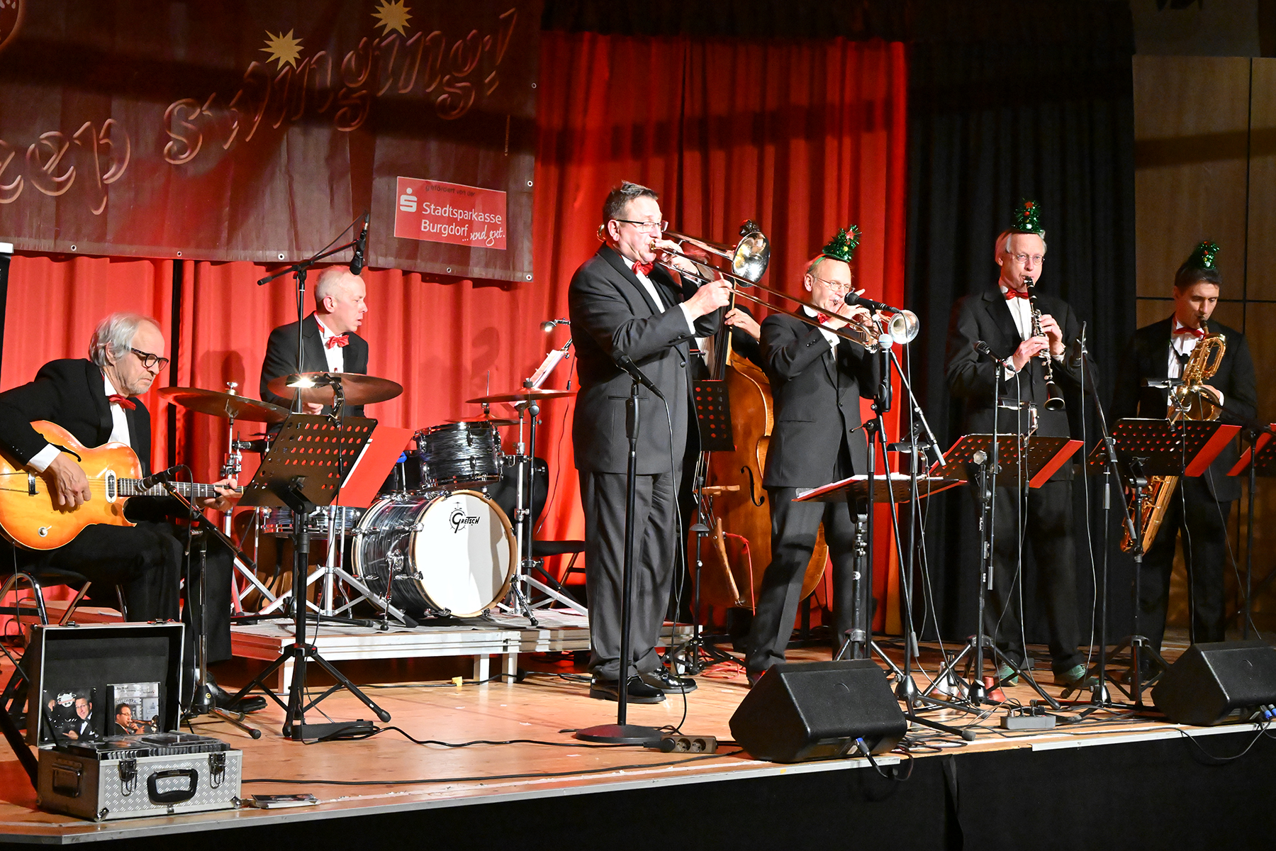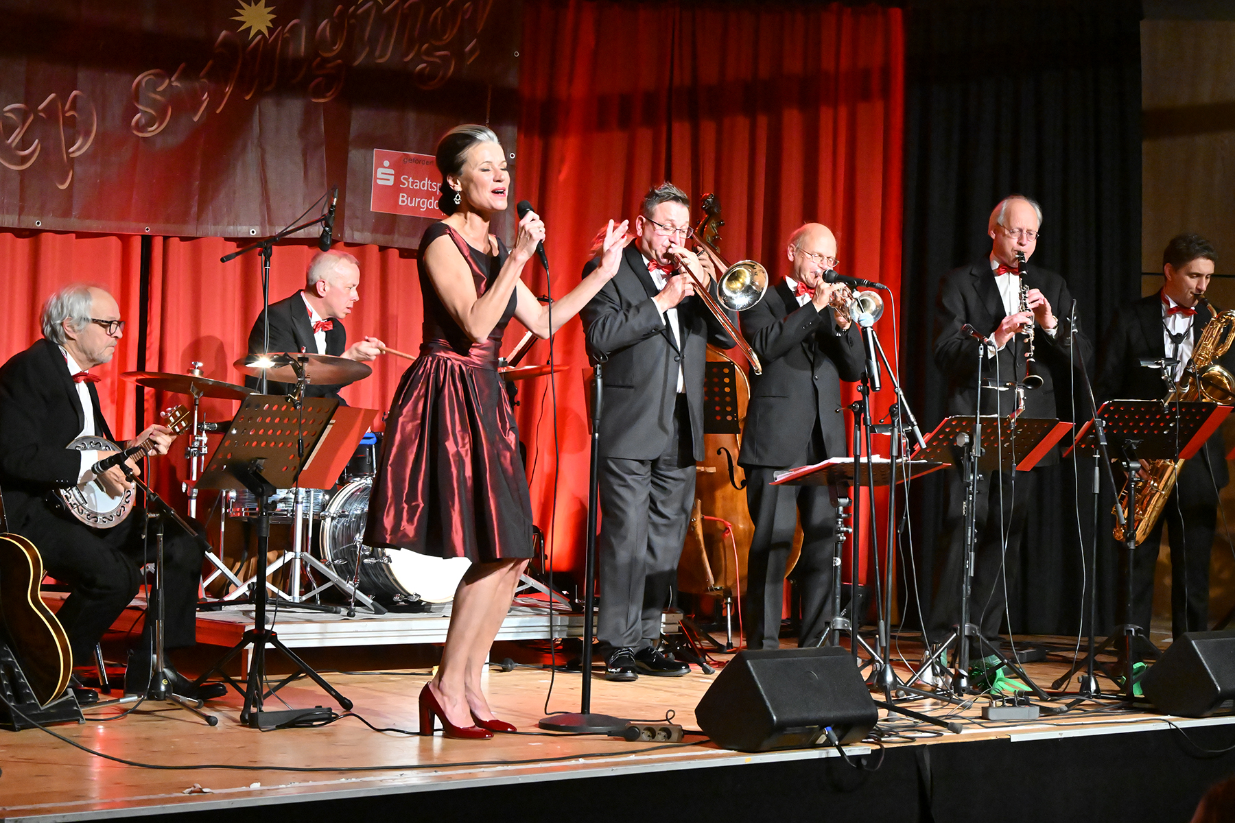 Unter dem Motto "Wonderful Christmas Time" hatten die Jazzfreunde Burgdorf am gestrigen Sonnabend, 9. Dezember 2023, zu einem glanzvollen Konzert im ausverkauften Saal des Stadthauses Burgdorf eingeladen. Joe Wulf & The Gentlemen of Swing präsentierten in unnachahmlicher Art und Weise ihre mitreißende Musik, so dass die Tanzfläche immer gefüllt war. Die Swingtänzer hatten wieder keine Entfernung gescheut, um in Burgdorf zu "performen". Selbst die Band war begeistert.