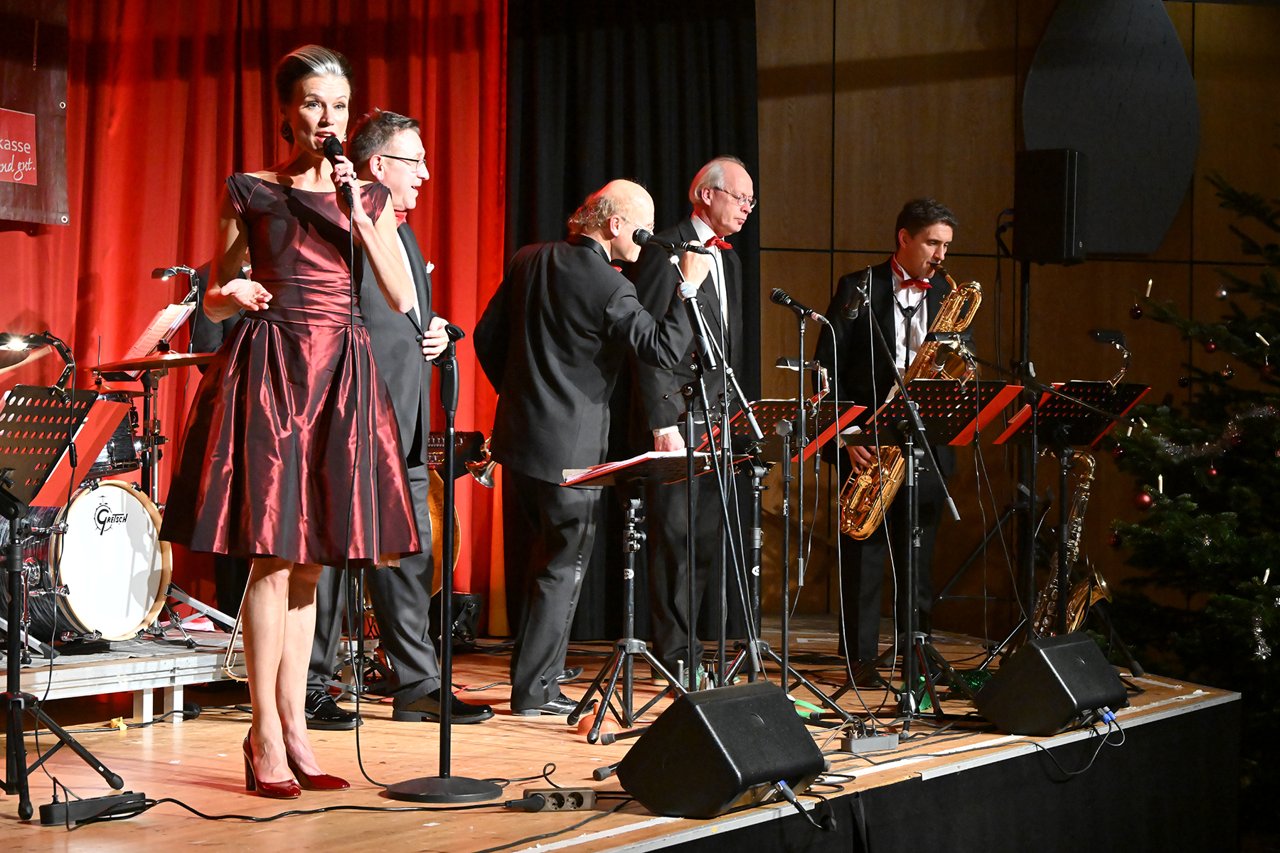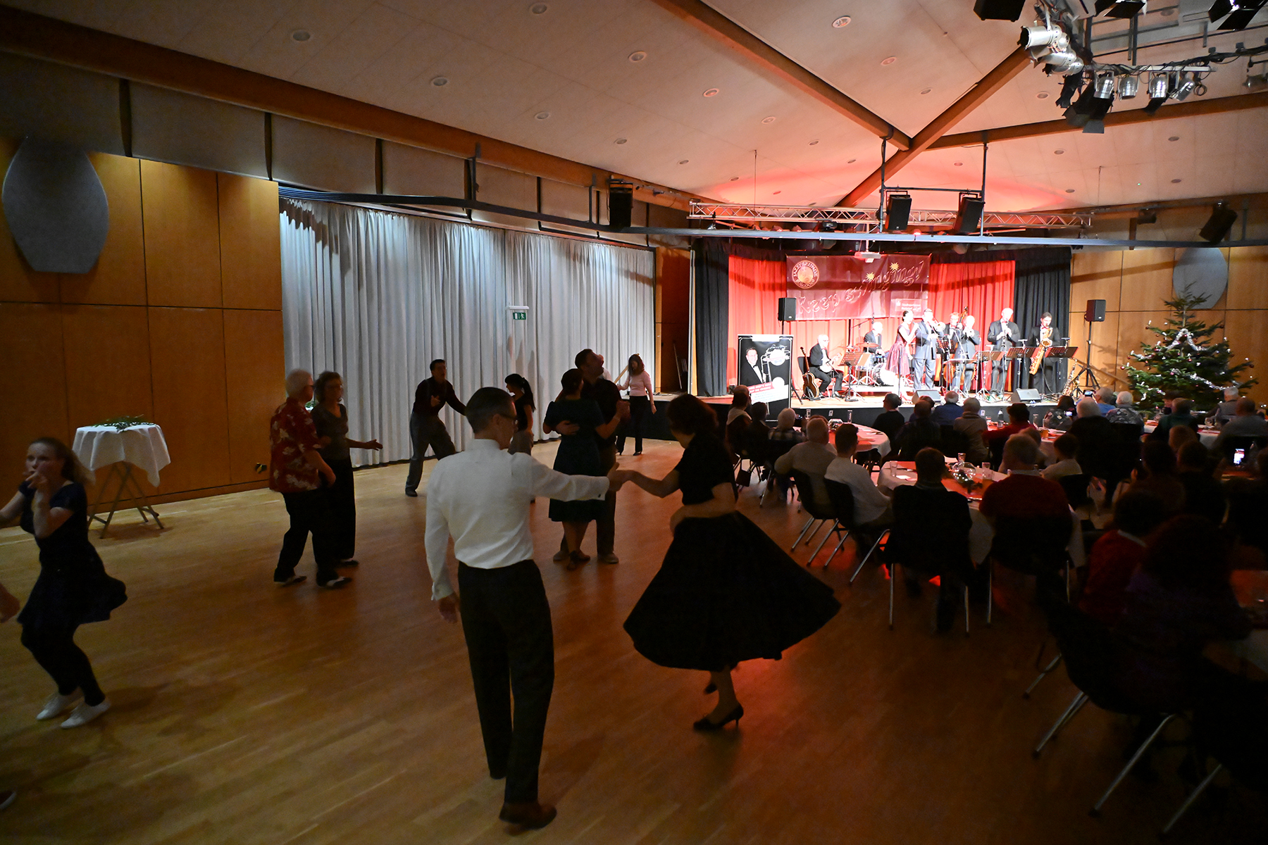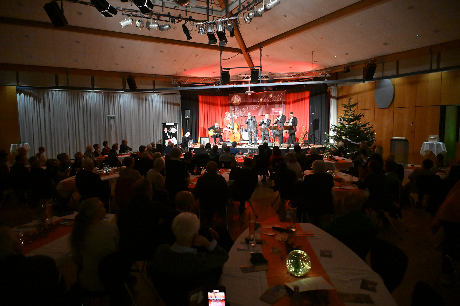 Festlich geschmückte Tische und ein strahlender Tannenbaum ließen Adventsstimmung aufkommen. Und das Menü 1, "Currywurst/Pommes", fand rasanten Absatz. Die Band spielte die schönsten Swingtitel, American Standards und deutsche Weihnachtlieder im typischen Joe Wulf-Sound.