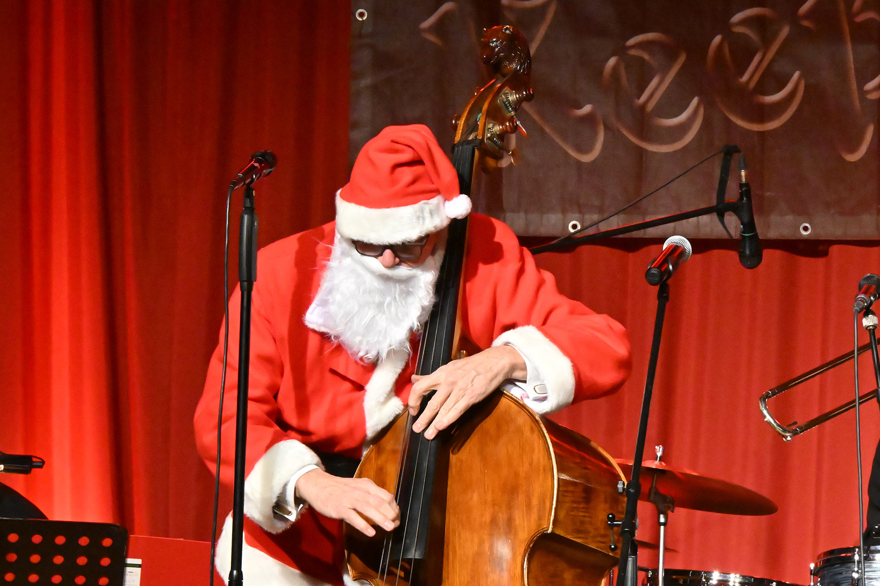 Ein Lieblingstitel der Band ist "Blue Christmas", von Elvis bekannt gemacht. Sensationell Angela’s "Mele Kalikimaka", ein Hawai-Song von Bing Crosby. Joe kündigte das uralte Adventslied "Tochter Zion, freue dich" lächelnd an: Drummer Wolfgang werde es mit dem Besen begleiten, da er früher Hausmeister war und er in Erinnerung von seiner Exfrau träume. Ja, der Humor kam an diesem Abend nicht zu kurz. So durfte der Weihnachtsmann in Gestalt von Jochen nicht fehlen. Er und die ganze Band ließen das Publikum erstaunen, weil alle singen können und das auch taten.