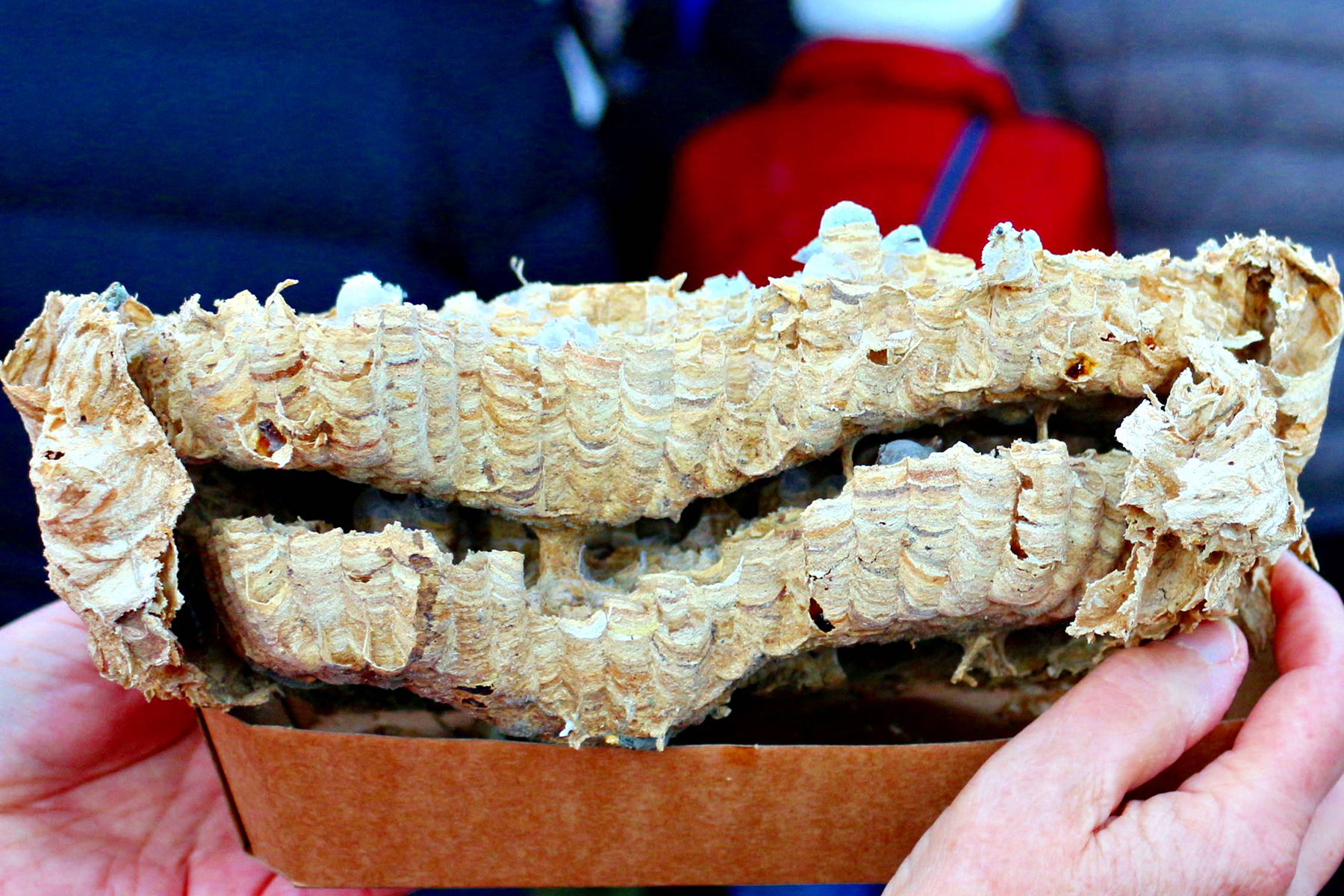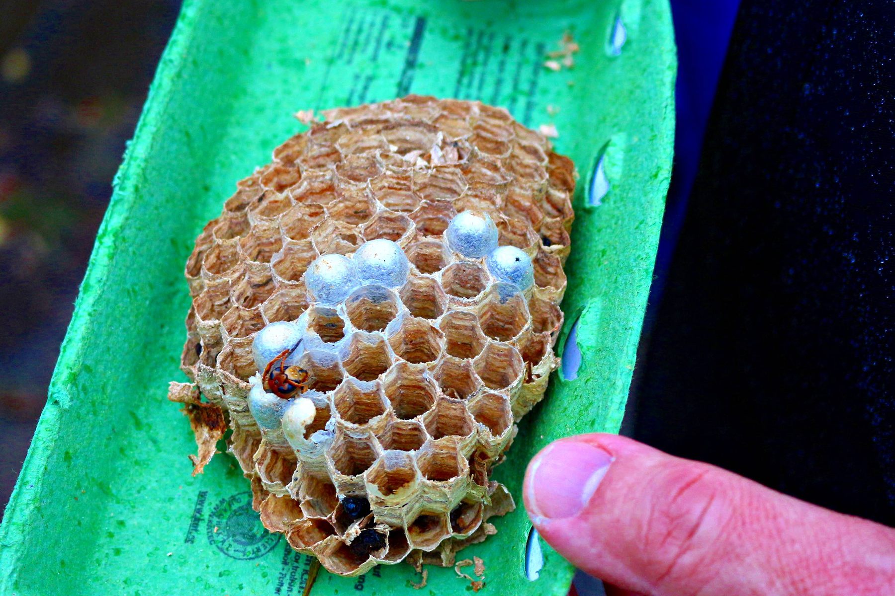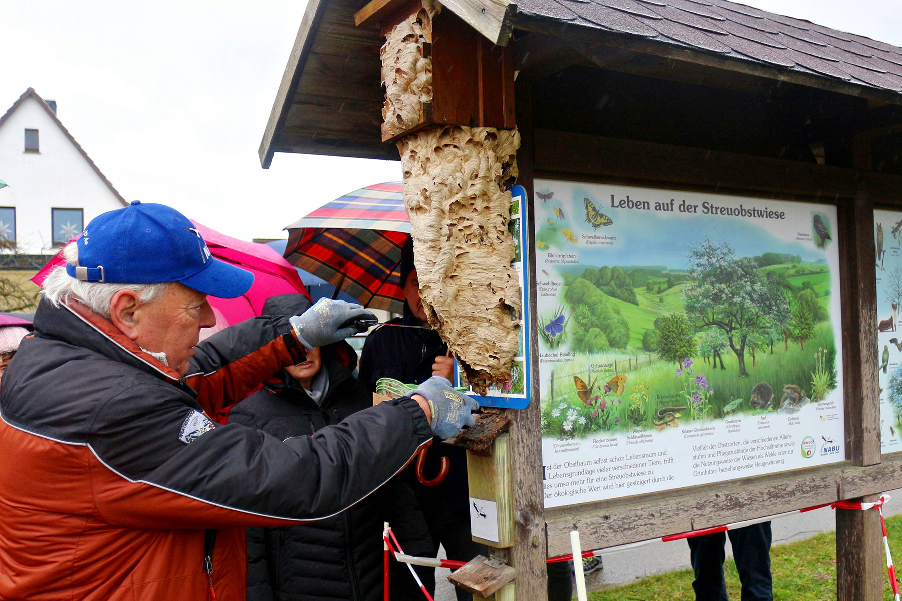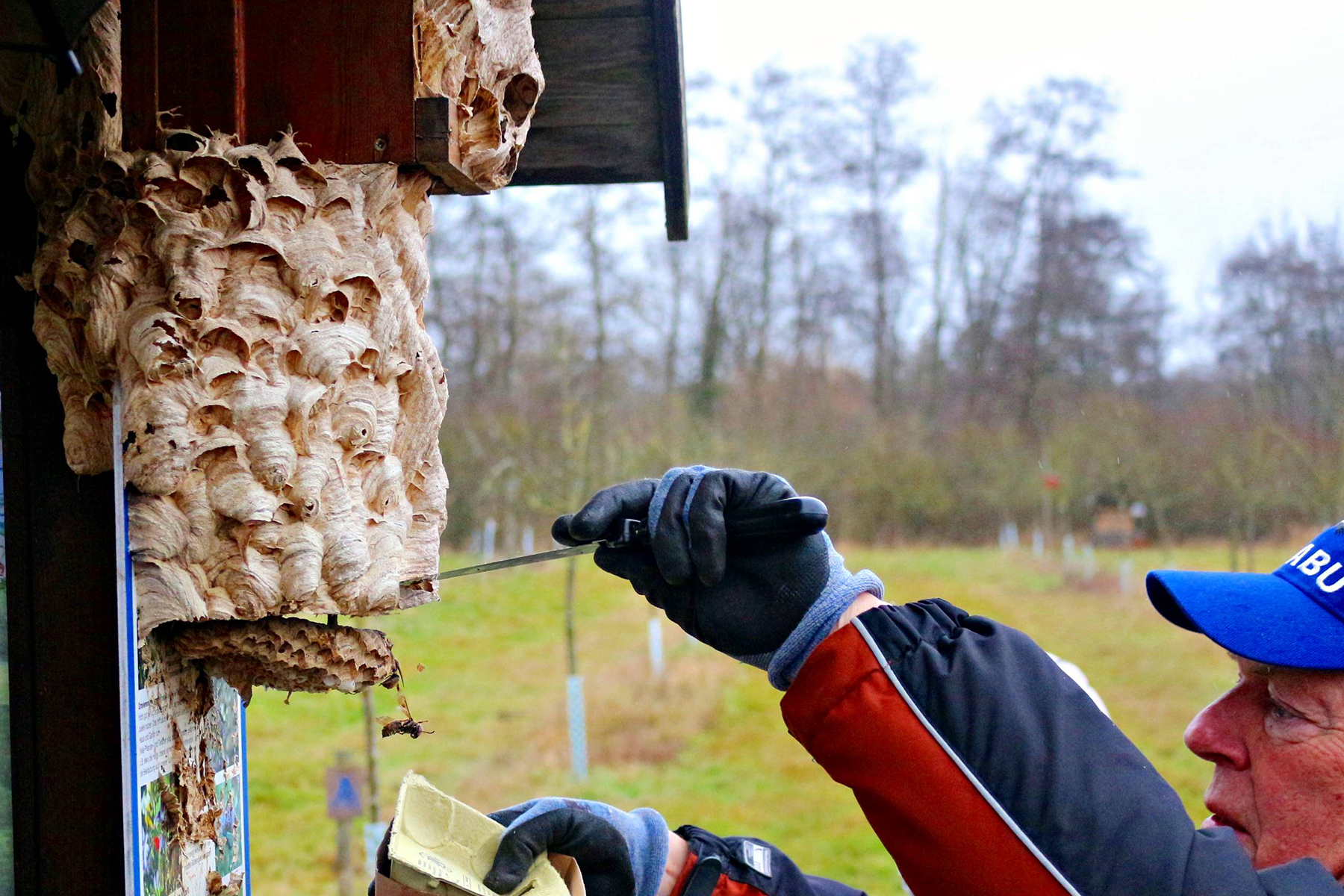 Hornissen bevorzugen als Neststandorte regengeschützte, dunkle Hohlräume wie Baumhöhlen. Sie nehmen aber auch künstliche Plätze, zum Beispiel Vogelnistkästen, Dachböden oder Geräteschuppen, an. So wie das Hornissenvolk, welches sich ausgerechnet die Info-Tafel des NABU Burgdorf/Lehrte/Uetze auf der Streuobstwiese an der Eseringer Straße für seinen Nestbau ausgesucht hatte. Ab Mitte Juni 2023 hatten die Insekten begonnen, ihr Nest geschützt unter dem First der Info-Tafel zu bauen und später nach unten erweitert. Damit war das Hornissennest "auf Augenhöhe" und Ernst Schmidt konnte der Gruppe die innere Architektur des Gebildes anschaulich machen, indem er einige Teile herausschnitt. "Diese Gelegenheit zur genaueren Betrachtung ist einmalig und kein Problem, weil Hornissen jedes Jahr ein neues Nest anlegen. Alte Nester werden nicht wiederverwendet", erklärte Ernst Schmidt.