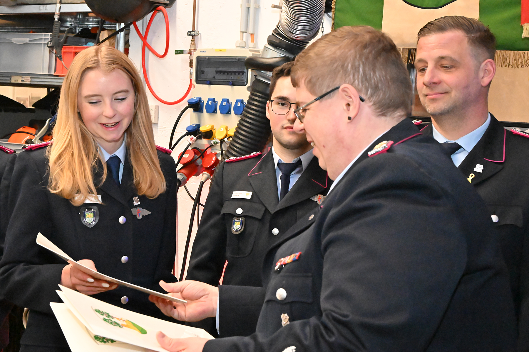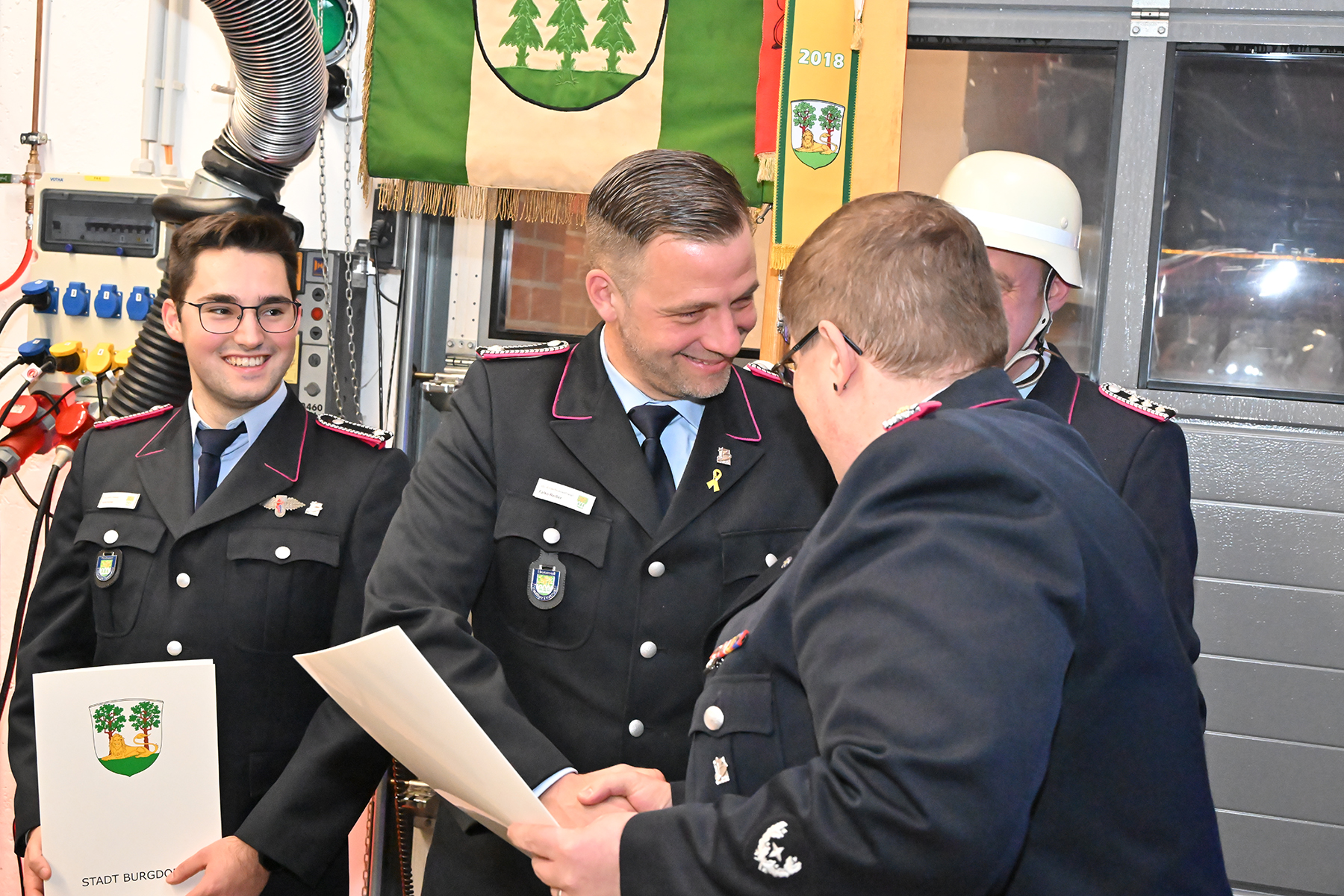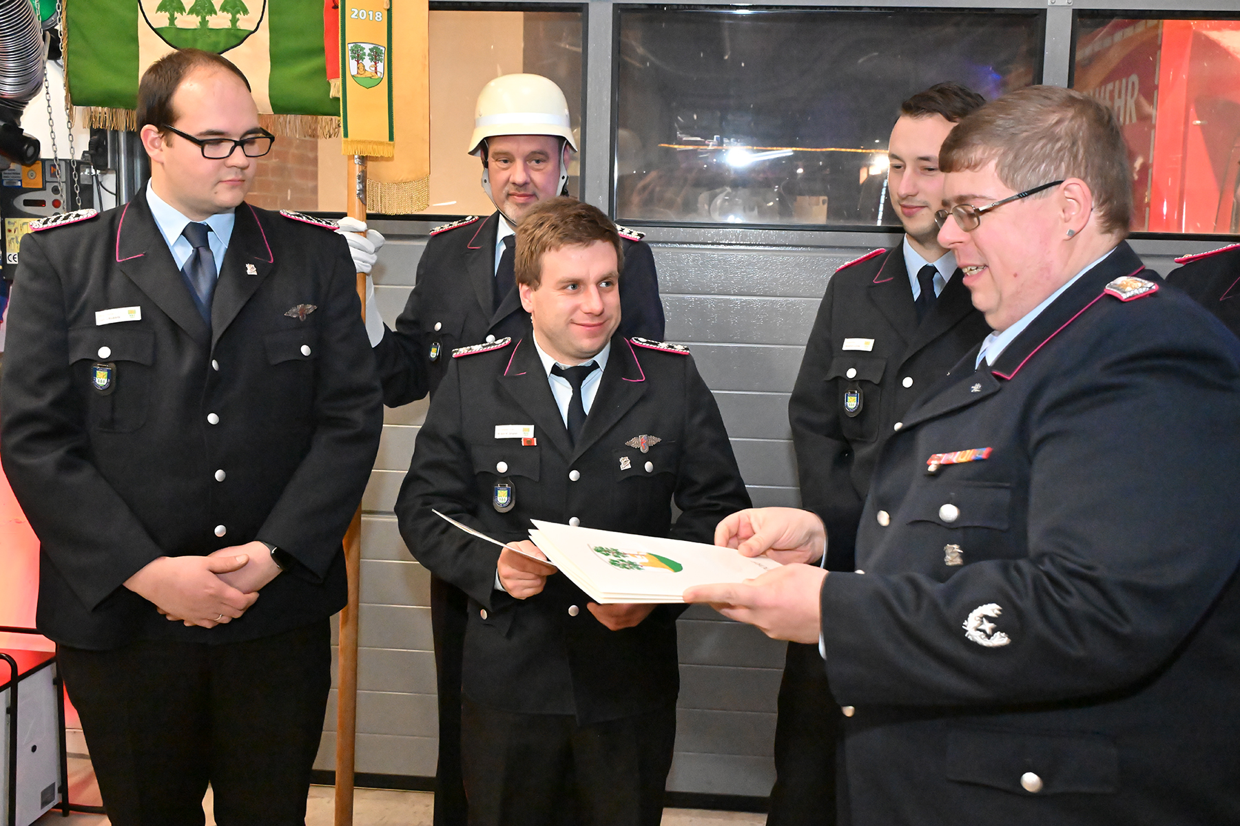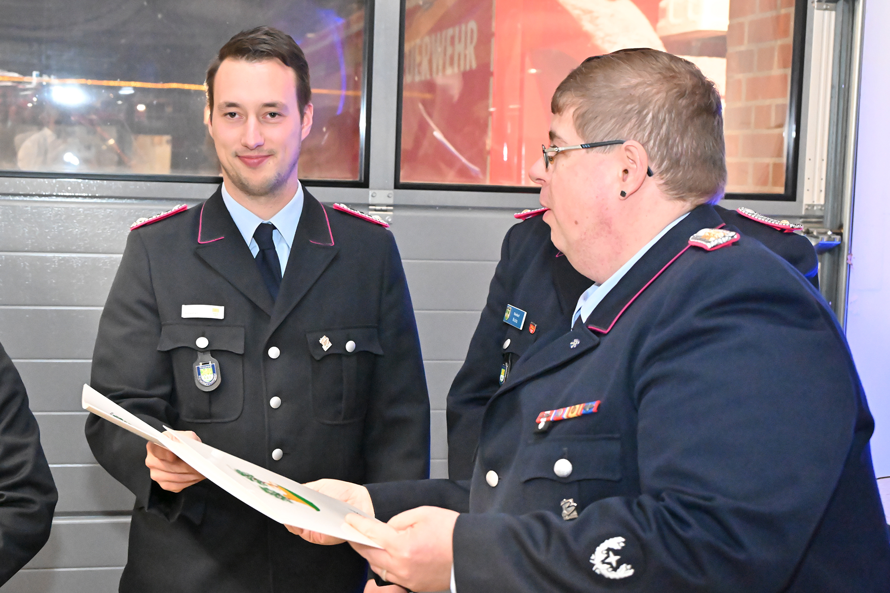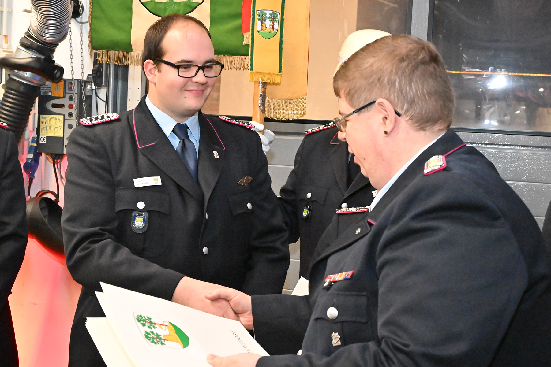 Aufgrund absolvierter Lehrgänge und erforderlicher Dienstzeit konnten auch wieder neue Dienstgrade vergeben werden. Den ersten Dienstgrad ihrer Feuerwehrlaufbahn erhielten Lina Leder, die zur Feuerwehrfrau ernannt wurde, und Philipp Steiner, der sich nun Feuerwehrmann nennen darf. Zur Oberfeuerwehrfrau wurde Alina Pawlik ernannt, und Felix Köbe erhielt ebenso wie Falko Reißer den Dienstgrad Hauptfeuerwehrmann. Zum Löschmeister wurde Robin Hußmann ernannt. Den Dienstgrad Oberlöschmeister erhielt Lukas Raddatz, und zum Hauptlöschmeister wurde Sebastian Lübbe ernannt. Der stellvertretende Ortsbrandmeister Marc-Robert Krey erhielt den Dienstgrad Erster Hauptlöschmeister.