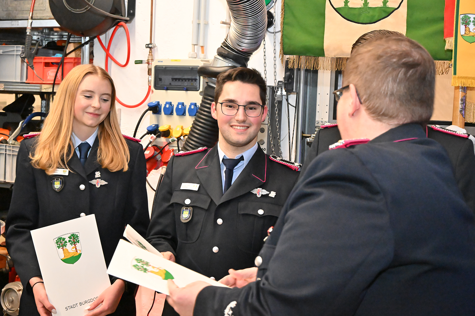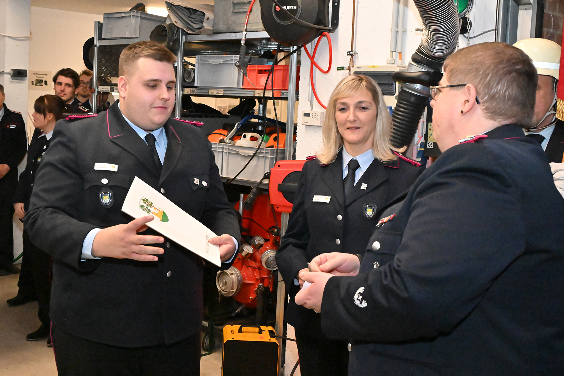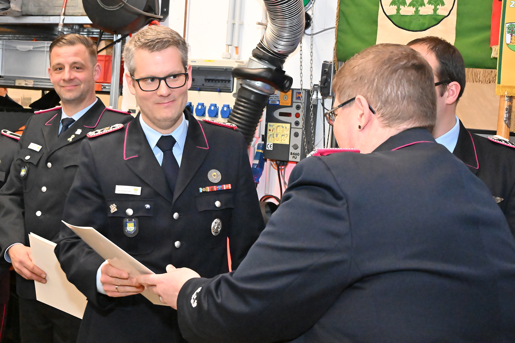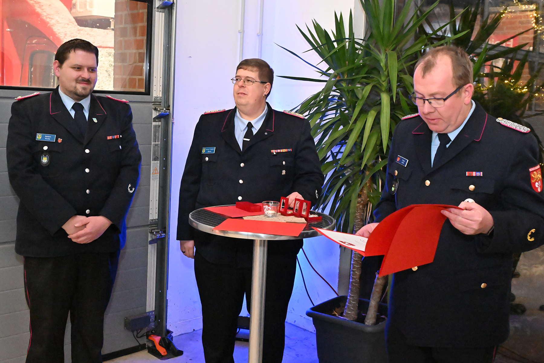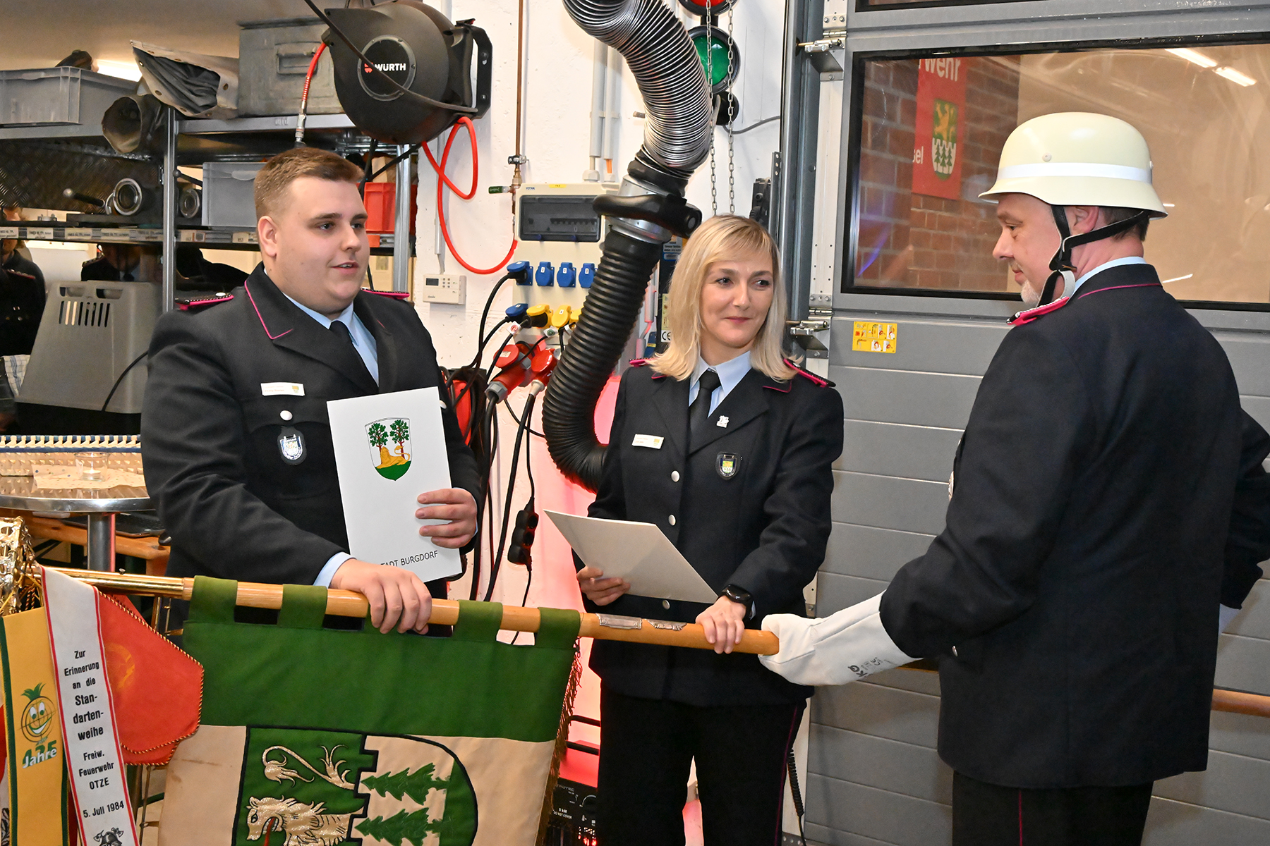 Aufgrund absolvierter Lehrgänge und erforderlicher Dienstzeit konnten auch wieder neue Dienstgrade vergeben werden. Den ersten Dienstgrad ihrer Feuerwehrlaufbahn erhielten Lina Leder, die zur Feuerwehrfrau ernannt wurde, und Philipp Steiner, der sich nun Feuerwehrmann nennen darf. Zur Oberfeuerwehrfrau wurde Alina Pawlik ernannt, und Felix Köbe erhielt ebenso wie Falko Reißer den Dienstgrad Hauptfeuerwehrmann. Zum Löschmeister wurde Robin Hußmann ernannt. Den Dienstgrad Oberlöschmeister erhielt Lukas Raddatz, und zum Hauptlöschmeister wurde Sebastian Lübbe ernannt. Der stellvertretende Ortsbrandmeister Marc-Robert Krey erhielt den Dienstgrad Erster Hauptlöschmeister.