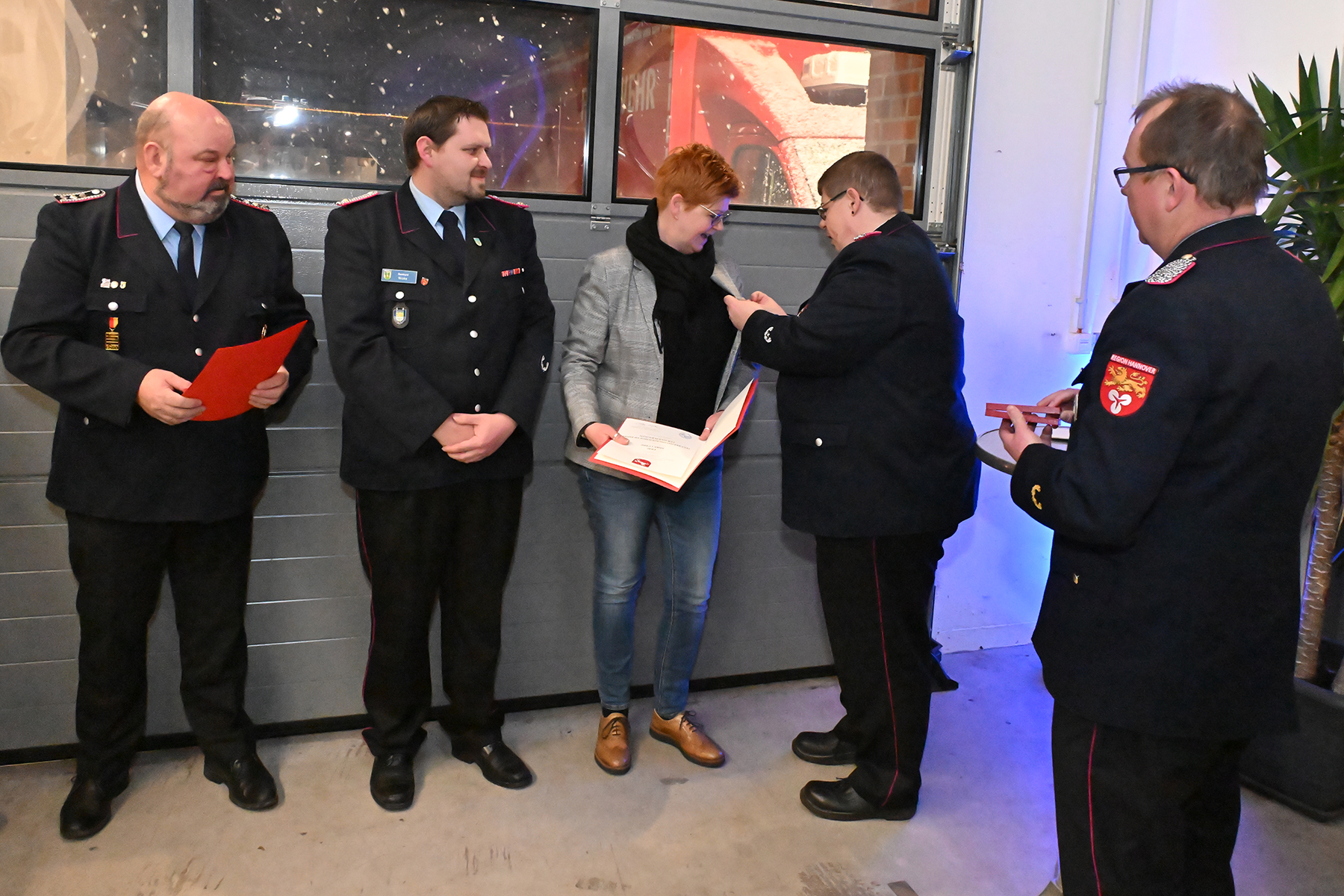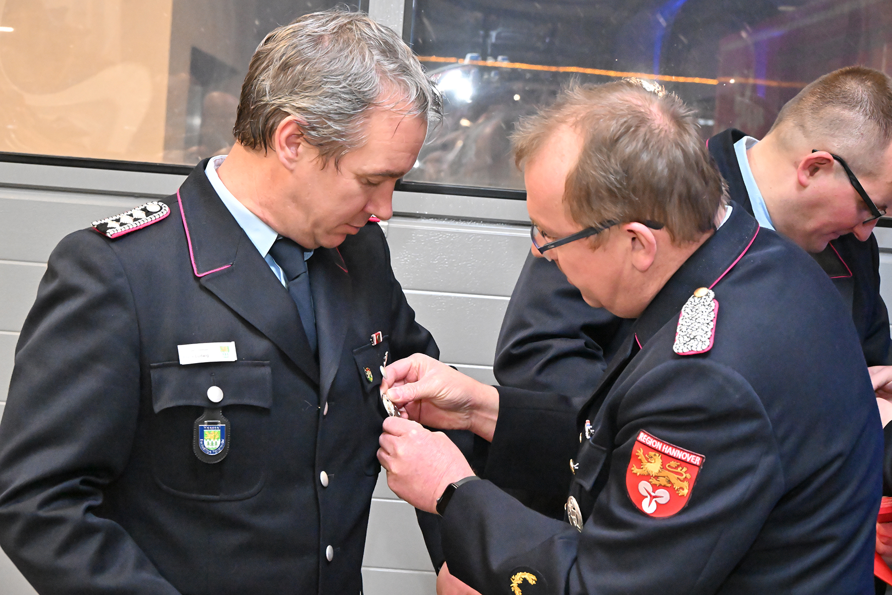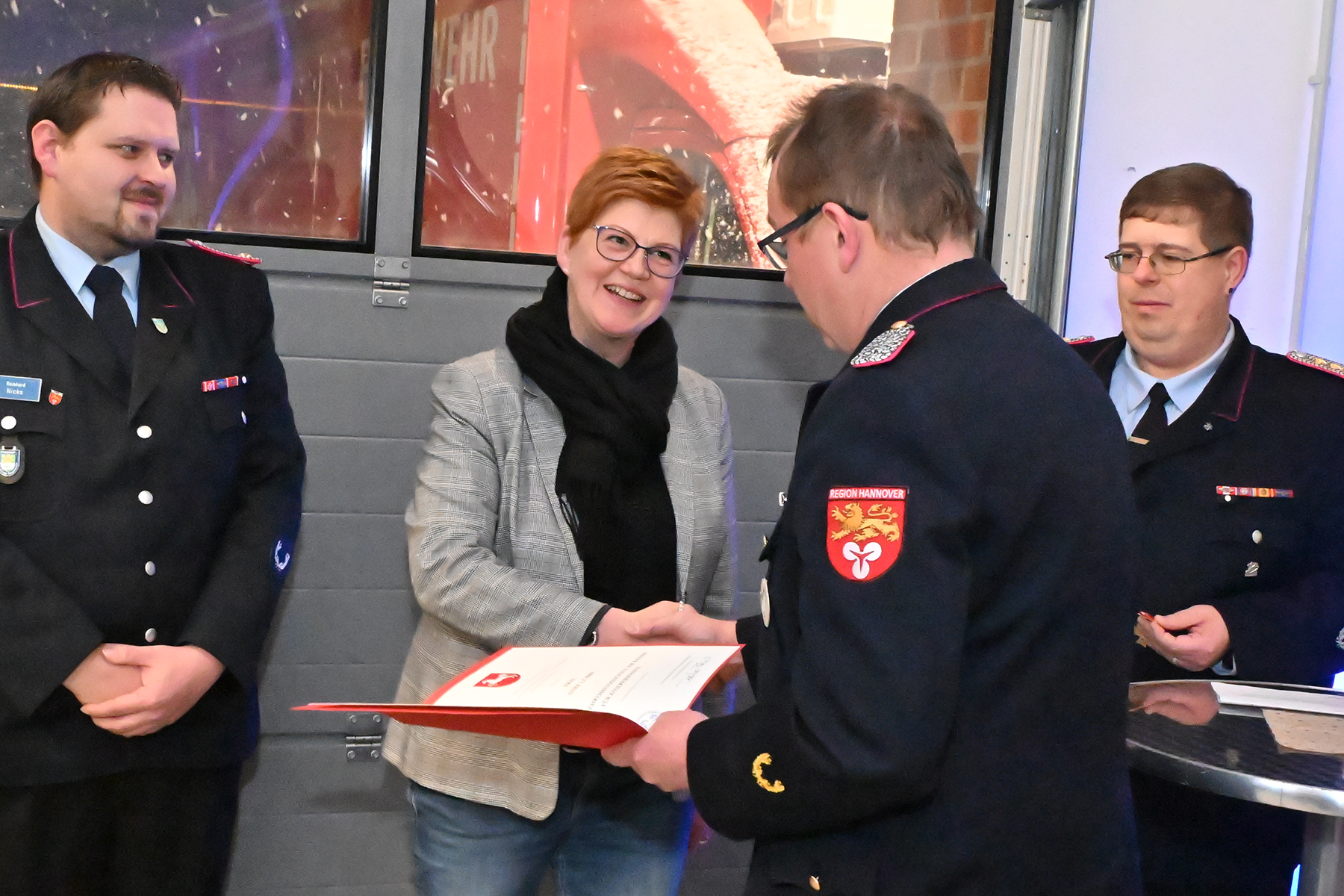 Für langjährige Mitgliedschaft in der Feuerwehr wurden durch das Land Niedersachsen Frank Ludwig und Christoph Grotjahn geehrt, die das Feuerwehr-Ehrenzeichen des Landes Niedersachsen für 25-jährige aktive Mitgliedschaft erhielten. Für 40-jährige aktive Mitgliedschaft in der Feuerwehr wurde Heiko Sacher mit dem Feuerwehr-Ehrenzeichen des Landes Niedersachsens ausgezeichnet. Eine besondere Ehre wurde Anke Lübbe zuteil. Sie erhielt aufgrund ihres besonderen Einsatzes für die Ortsfeuerwehr das Niedersächsische Feuerwehr-Ehrenzeichen am Bande für Zivilpersonen. Als Ehefrau des im vergangenen Jahr zum Ehrenortsbrandmeister ernannten langjährigen Ortsbrandmeisters Karsten Lübbe habe sie sich über Maßen für die Ortsfeuerwehr eingesetzt, wie Stadtbrandmeister Dennis-Frederik Heuer in seiner Laudatio betonte.