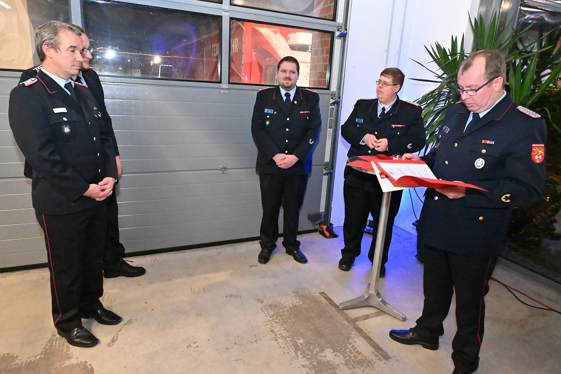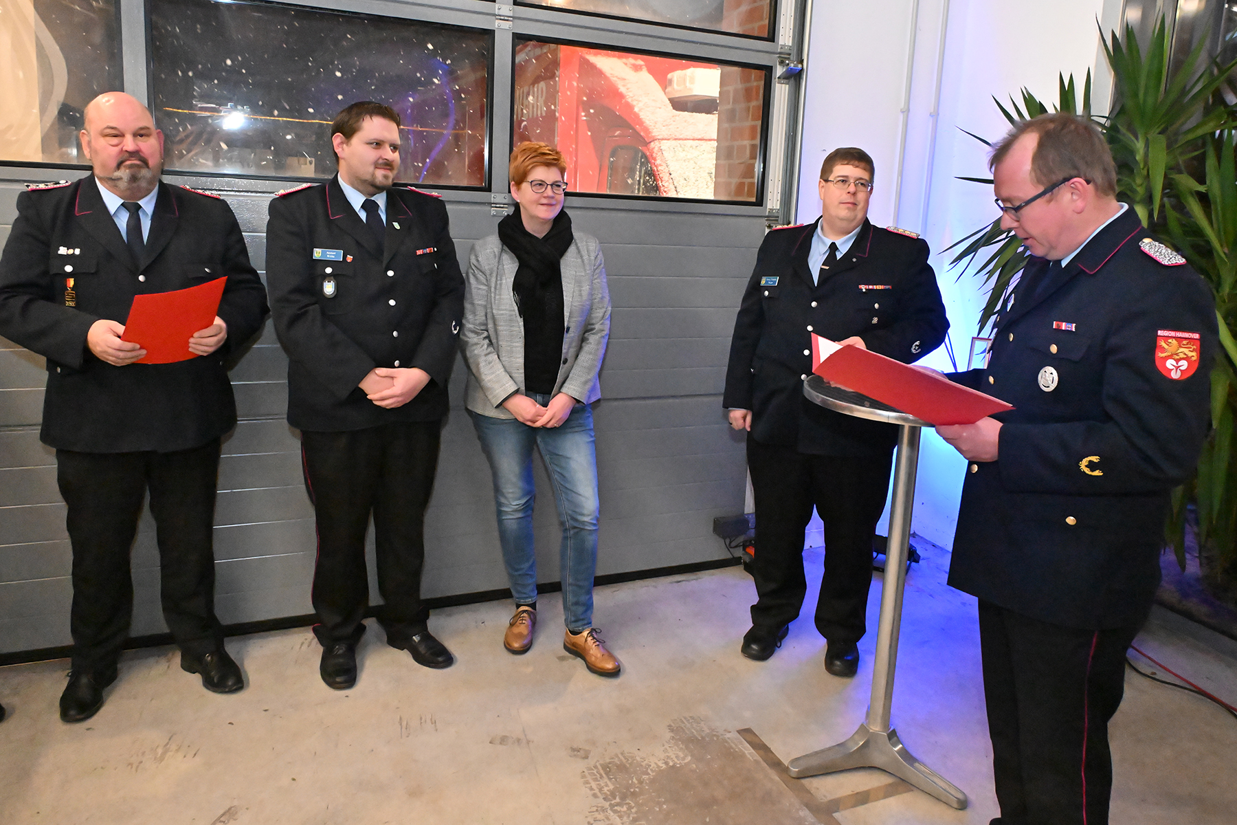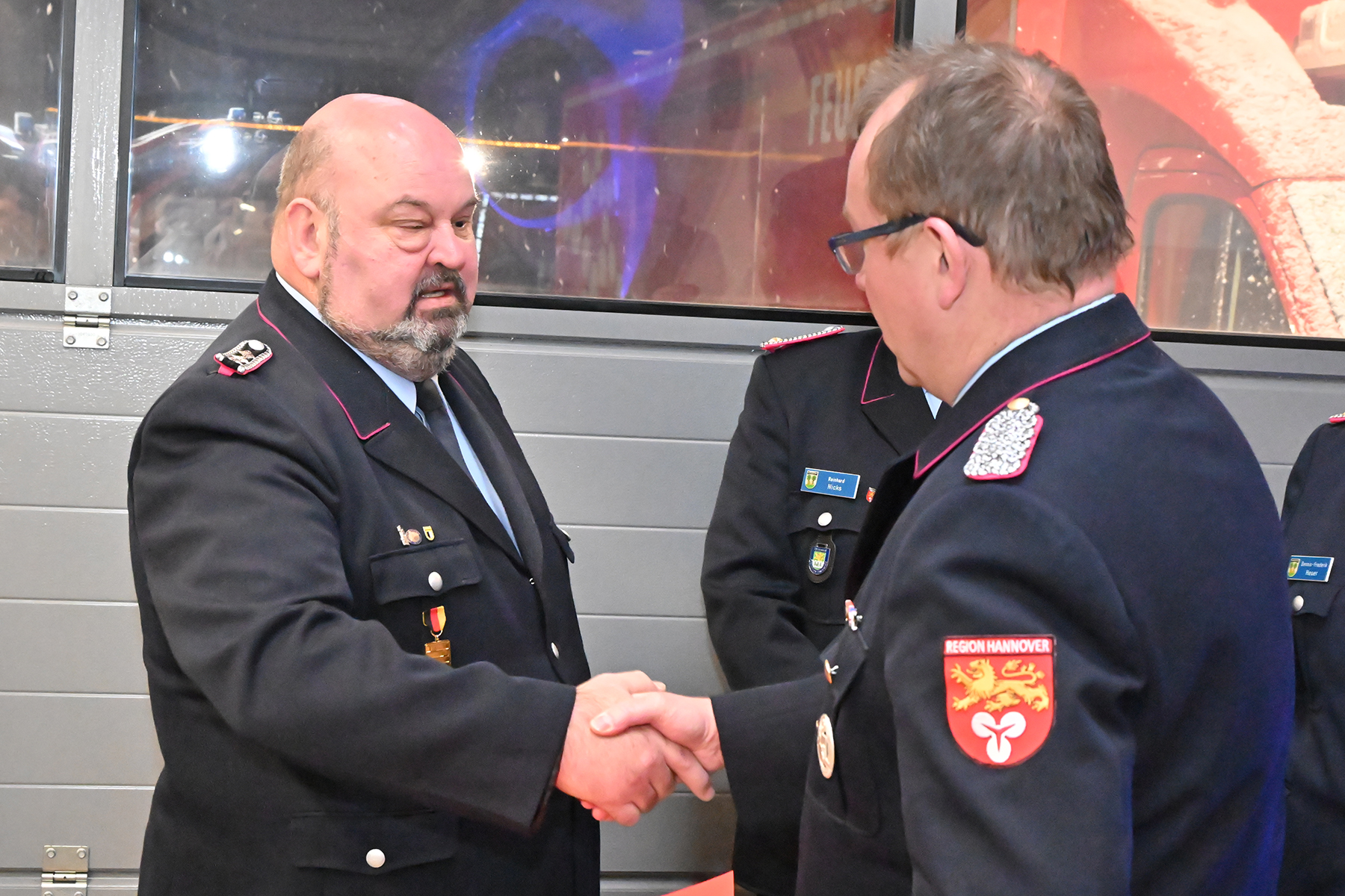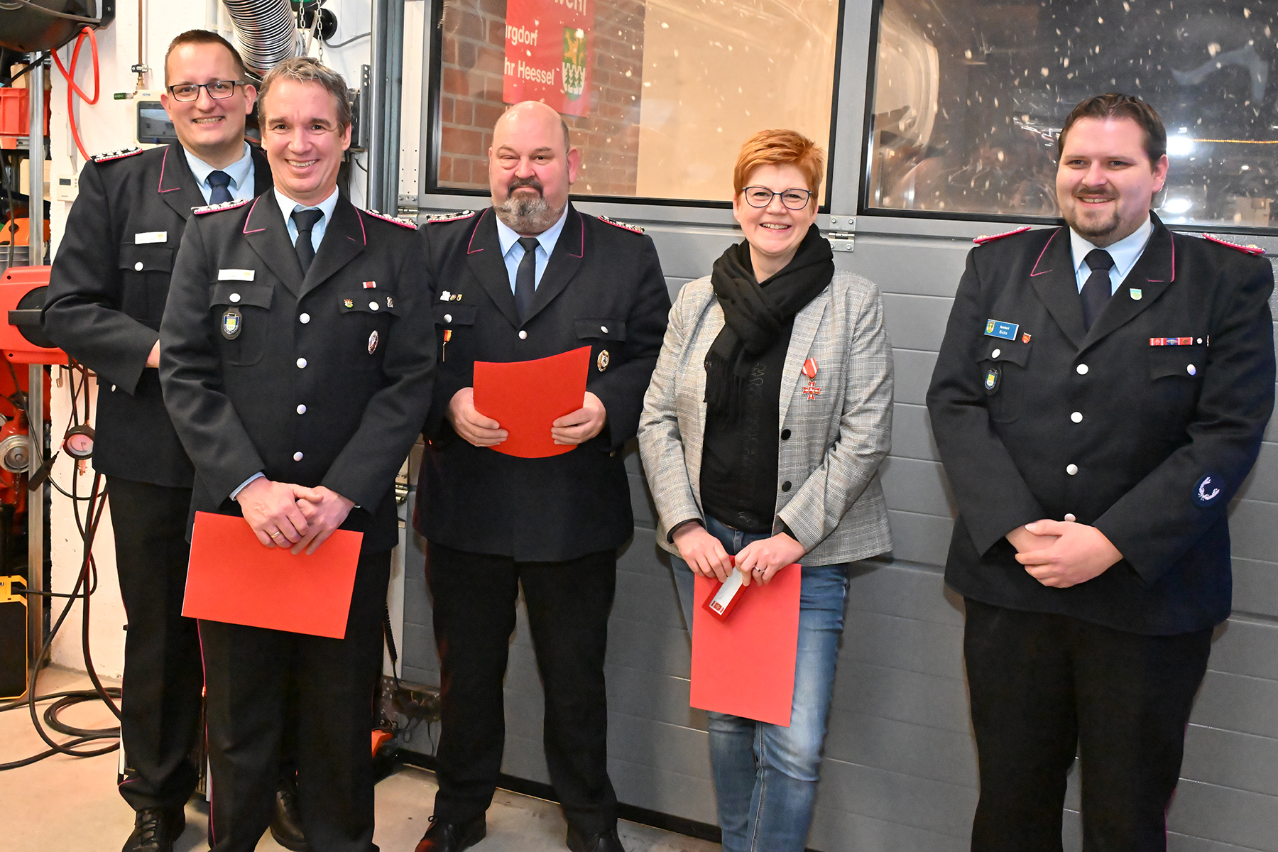Für langjährige Mitgliedschaft in der Feuerwehr wurden durch das Land Niedersachsen Frank Ludwig und Christoph Grotjahn geehrt, die das Feuerwehr-Ehrenzeichen des Landes Niedersachsen für 25-jährige aktive Mitgliedschaft erhielten. Für 40-jährige aktive Mitgliedschaft in der Feuerwehr wurde Heiko Sacher mit dem Feuerwehr-Ehrenzeichen des Landes Niedersachsens ausgezeichnet. Eine besondere Ehre wurde Anke Lübbe zuteil. Sie erhielt aufgrund ihres besonderen Einsatzes für die Ortsfeuerwehr das Niedersächsische Feuerwehr-Ehrenzeichen am Bande für Zivilpersonen. Als Ehefrau des im vergangenen Jahr zum Ehrenortsbrandmeister ernannten langjährigen Ortsbrandmeisters Karsten Lübbe habe sie sich über Maßen für die Ortsfeuerwehr eingesetzt, wie Stadtbrandmeister Dennis-Frederik Heuer in seiner Laudatio betonte.