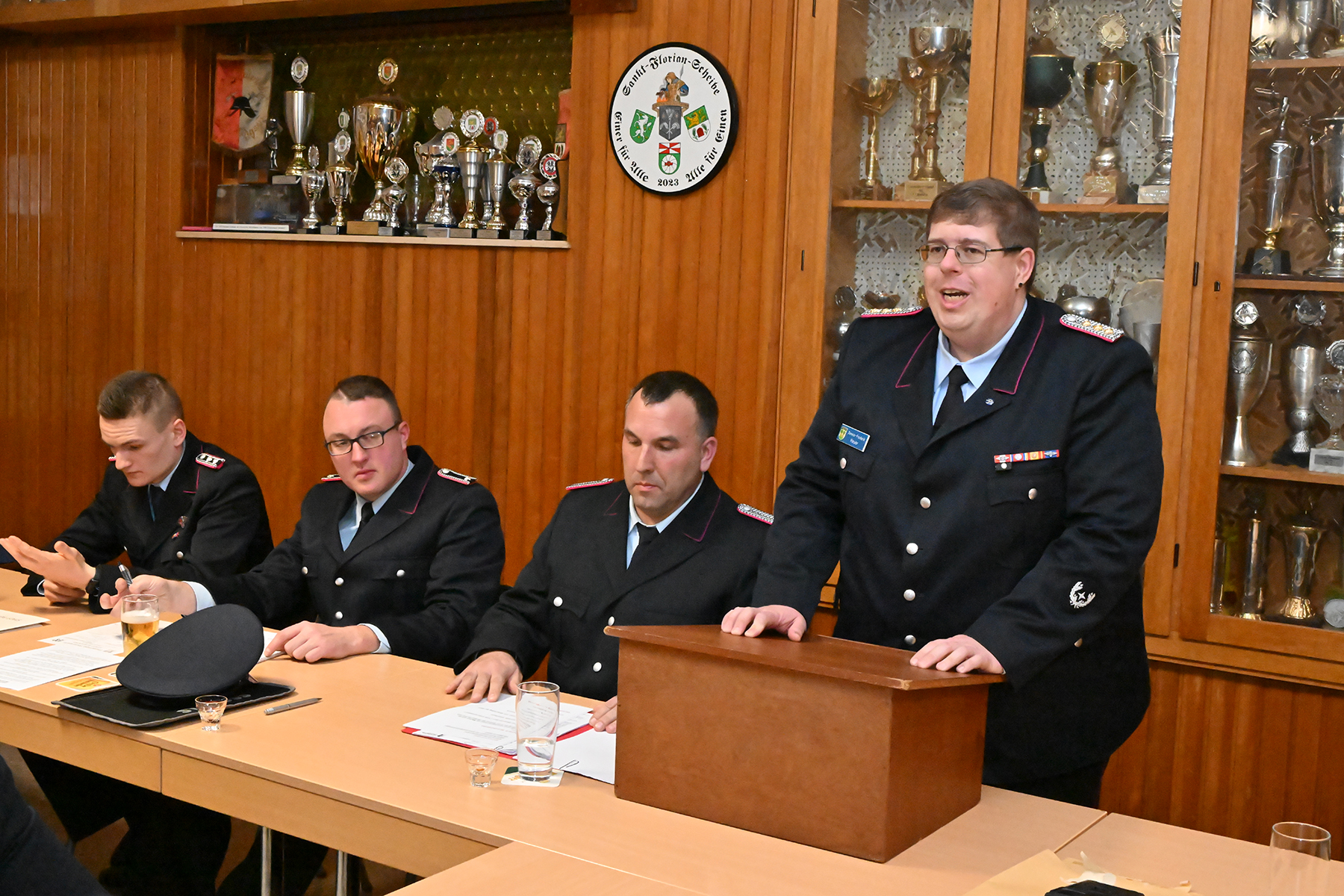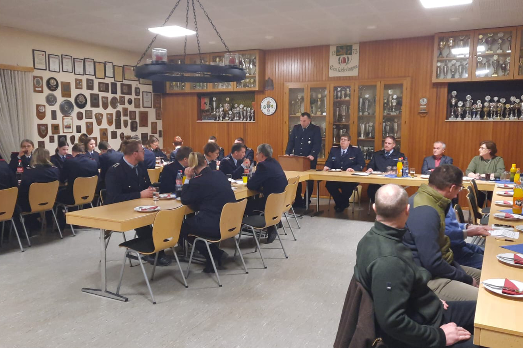 Rund 40 Gäste konnte Björn Batschauer zur Jahreshauptversammlung im Feuerwehrhaus begrüßen. Darunter Stadtbrandmeister Dennis-Frederik Heuer, den stellvertretenden Brandschutzabschnittsleiter Tim Herrmann, den 1. Stadtrat Michael Kugel, die Feuerwehrausschuss-Vorsitzende Beate Neitzel und den Ehrenstadtbrandmeister Alfred Brönnemann.