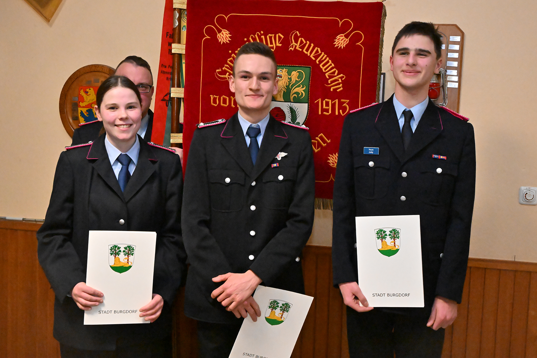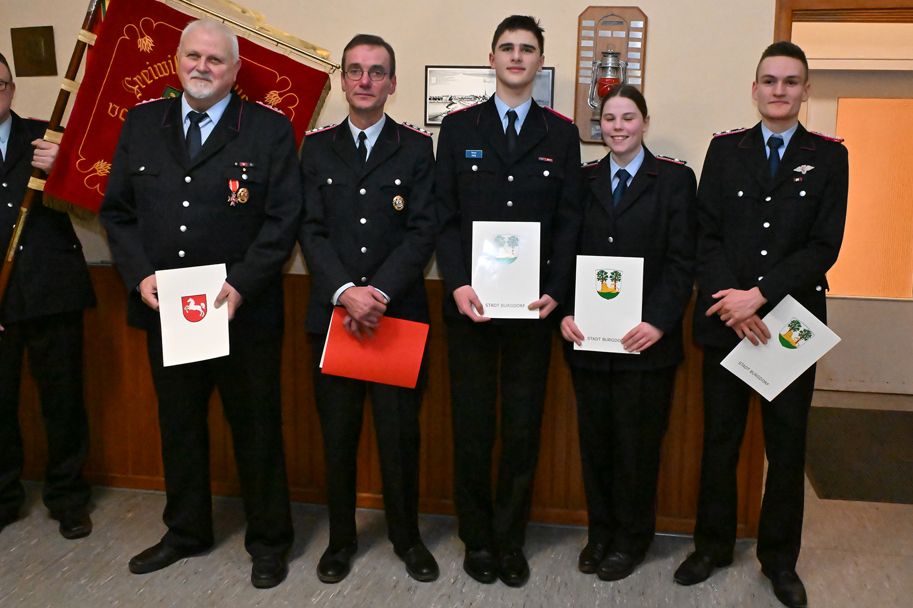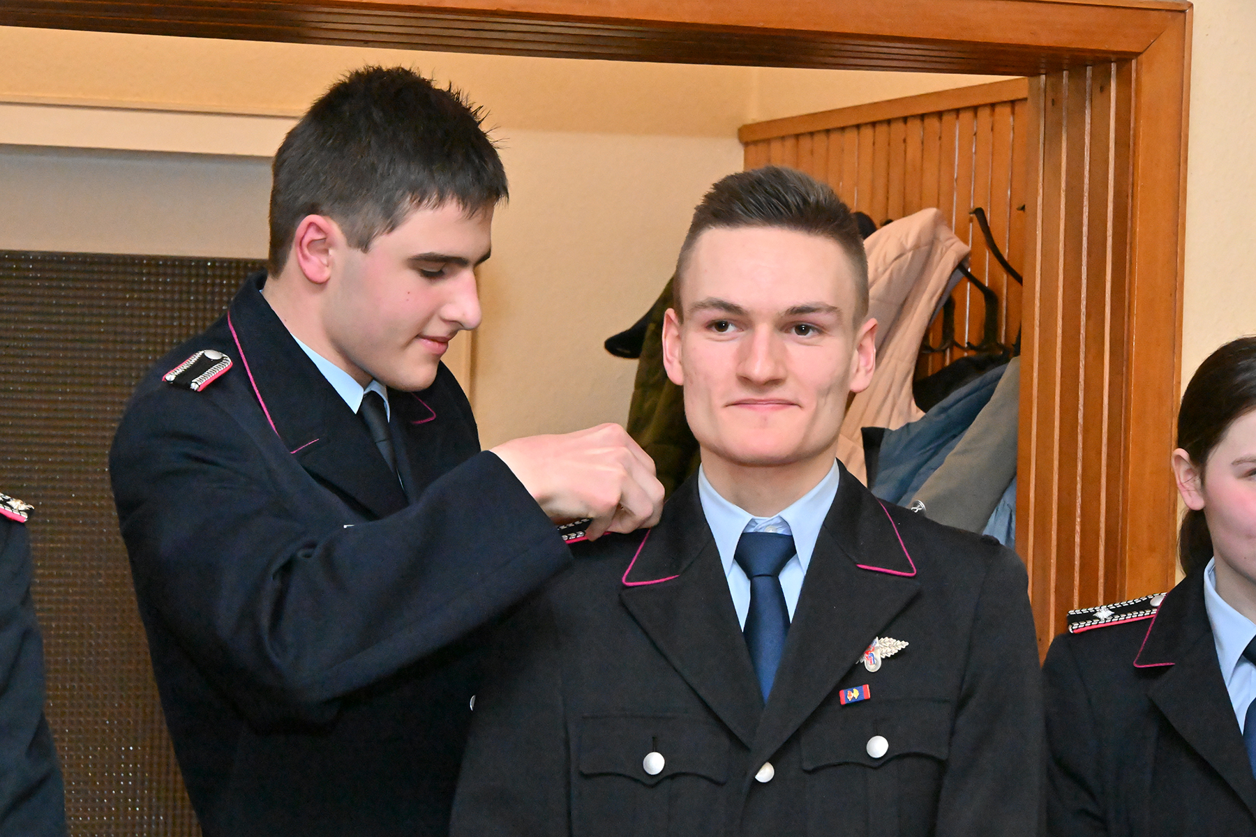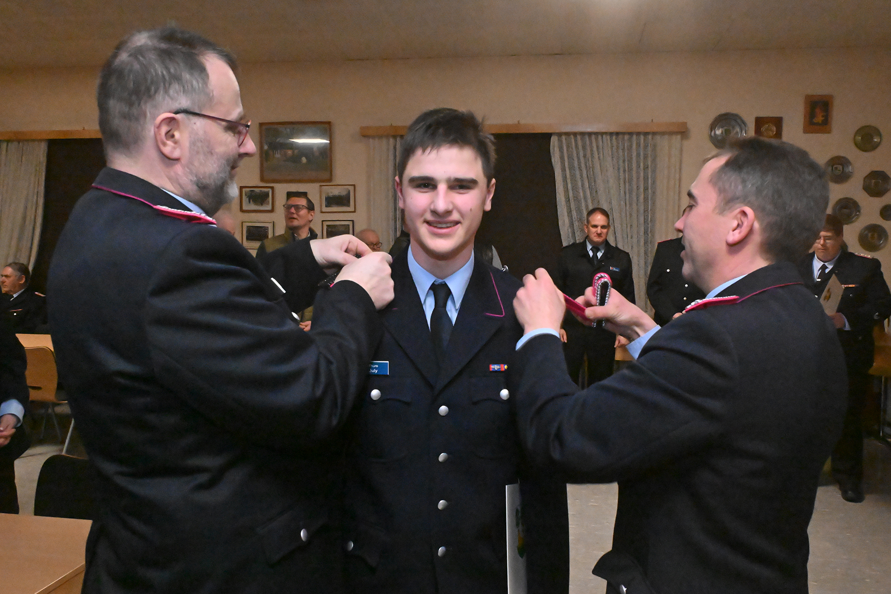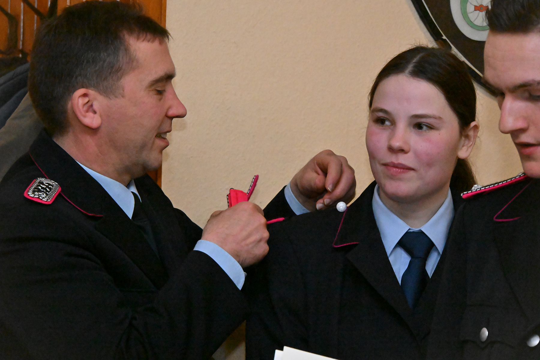 Neben Wahlen und Berichten konnten auch nach Abschluss erforderlicher Lehrgänge und Dienstzeit wieder neue Dienstgrade vergeben werden. Thure July wurde zum Feuerwehrmann und Miriam Carlens zur Oberfeuerwehrfrau ernannt. Den Dienstgrad Hauptfeuerwehrmann erhielt Maximilian Oelze.