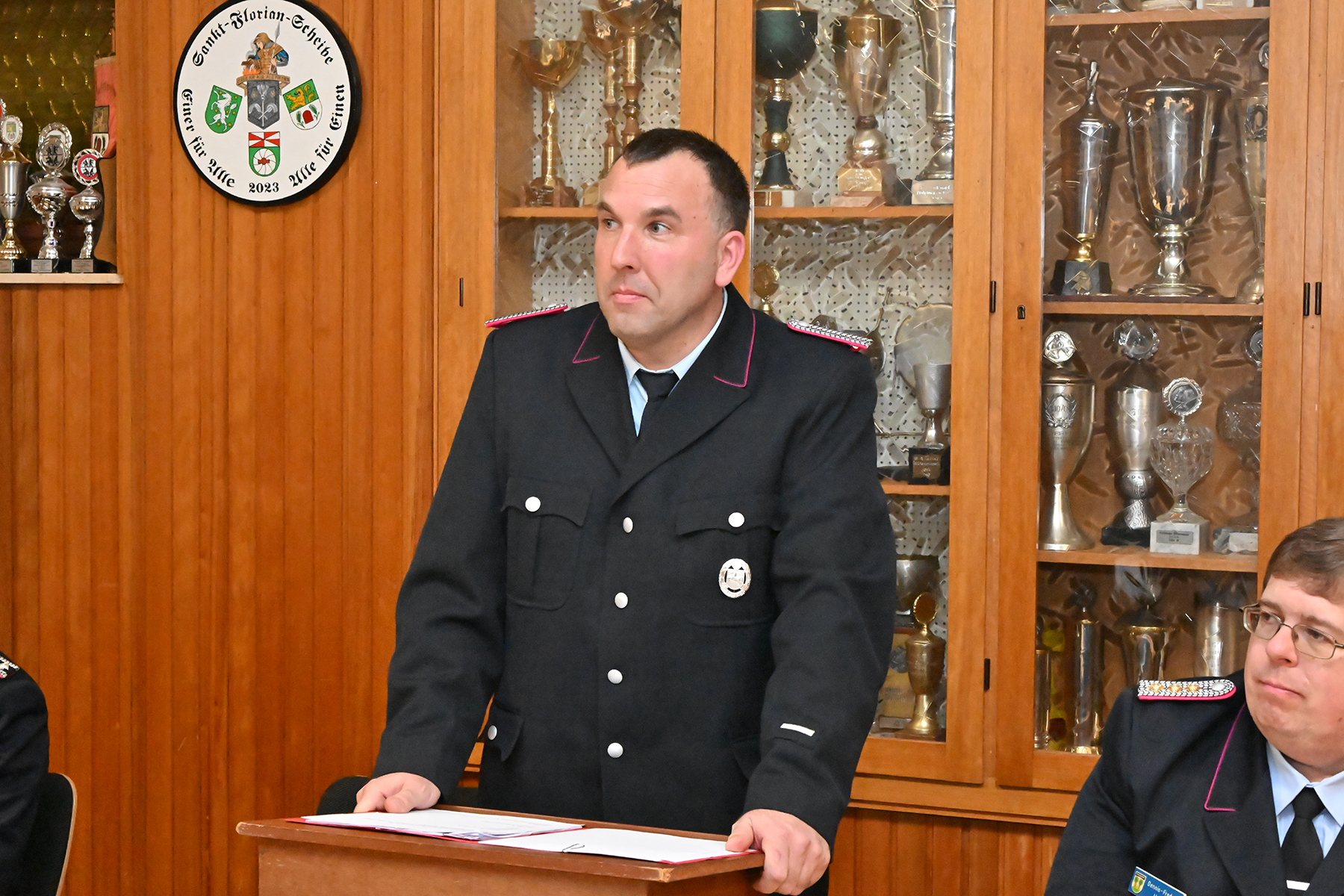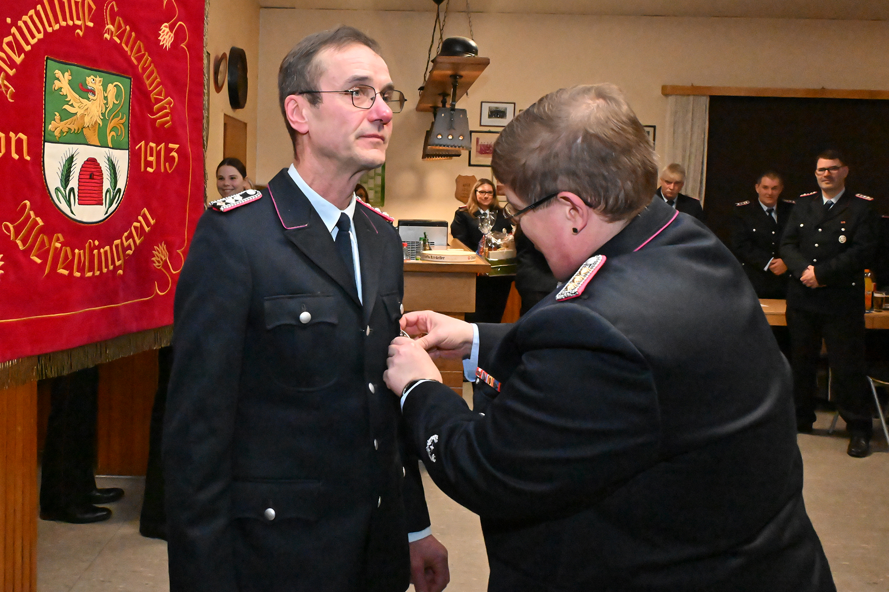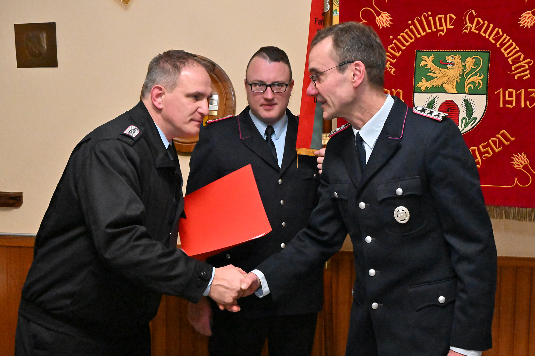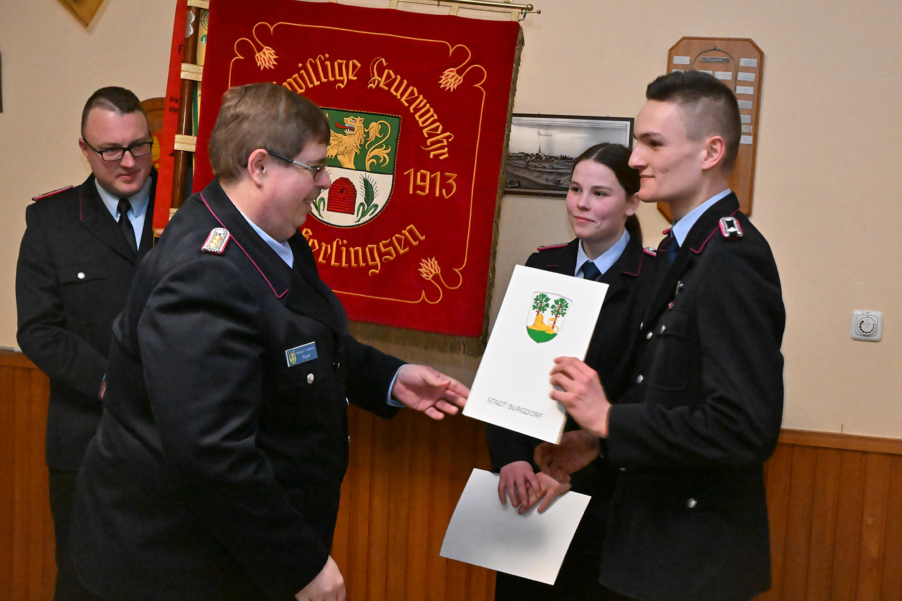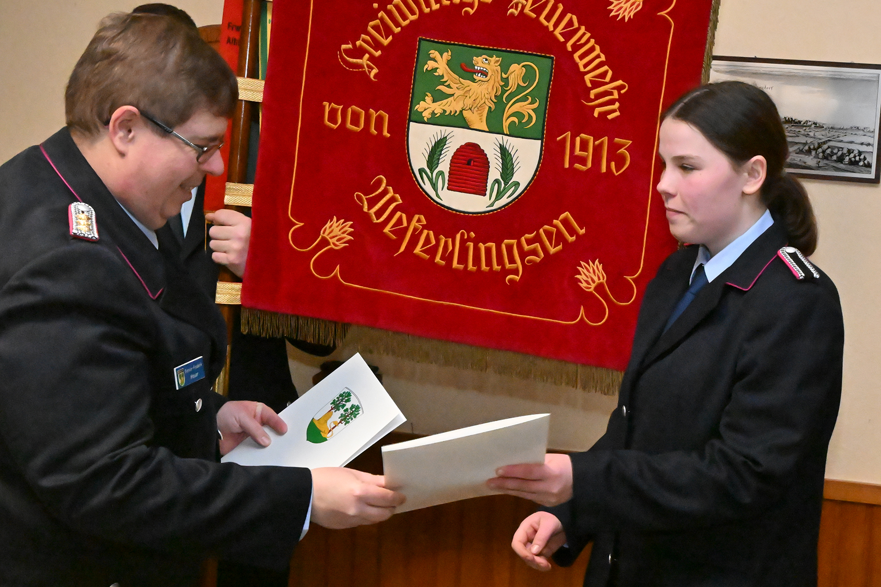 Neben Wahlen und Berichten konnten auch nach Abschluss erforderlicher Lehrgänge und Dienstzeit wieder neue Dienstgrade vergeben werden. Thure July wurde zum Feuerwehrmann und Miriam Carlens zur Oberfeuerwehrfrau ernannt. Den Dienstgrad Hauptfeuerwehrmann erhielt Maximilian Oelze.