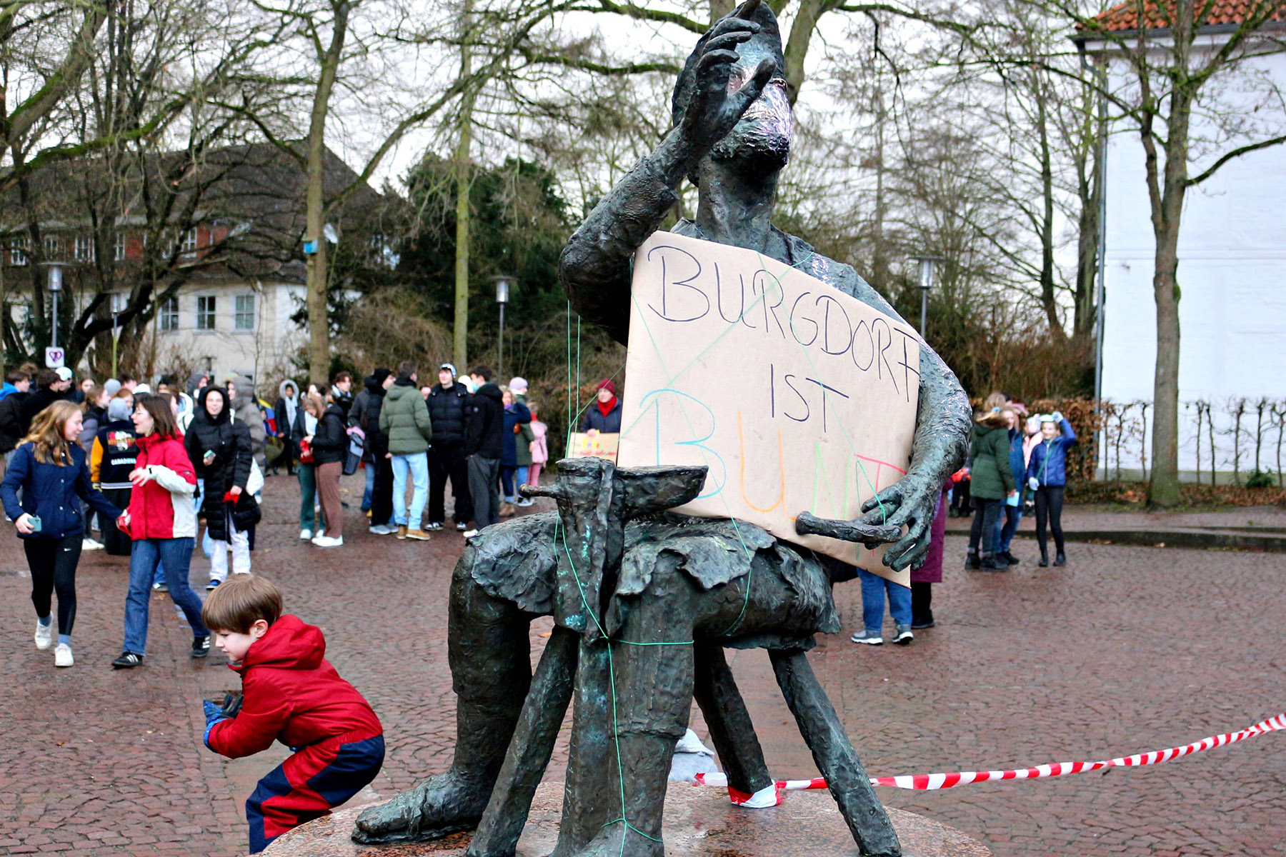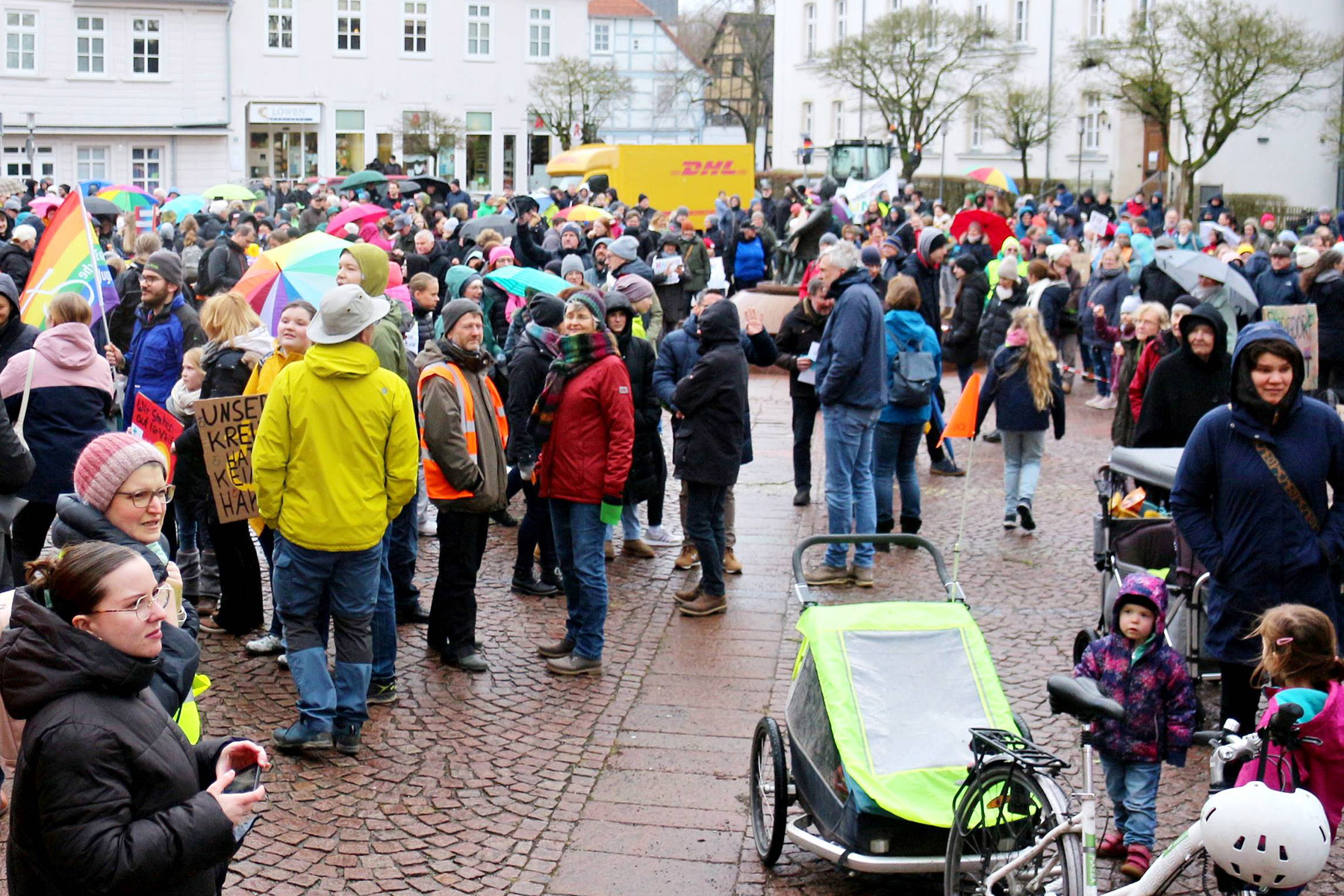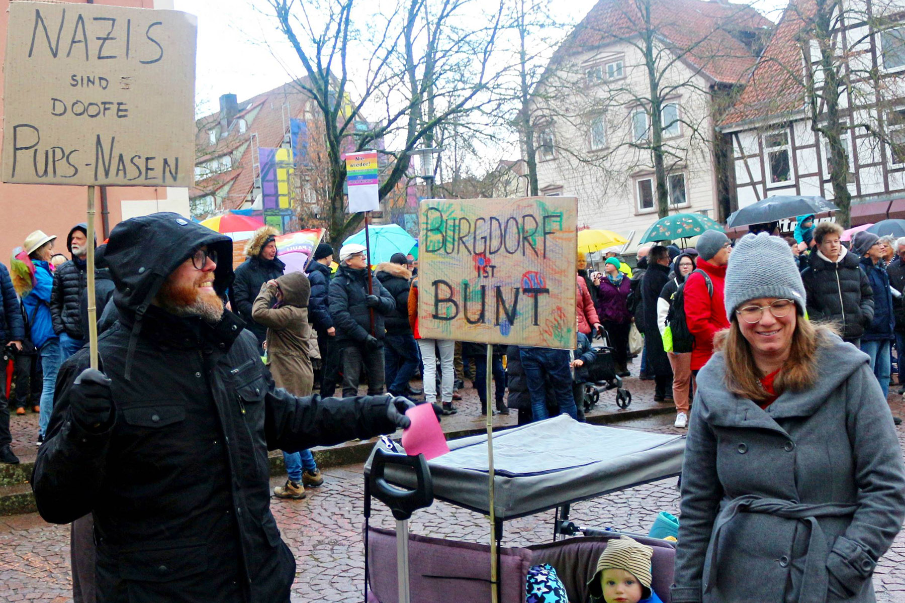 Das war sichtlich auch ganz im Sinne von Hunderten Burgdorfern, die dem Aufruf gefolgt waren. Sie hatten sich zu Füßen der St. Pankratiuskirche rund um den Wicken Thies-Brunnen versammelt und hielten Rechtsextremen in der Alternative für Deutschland (AfD) unübersehbar "Burgdorf ist bunt statt braun" entgegen. In Abwandlung eines Spruchs der sozialistischen Bewegung von 1886 "Die Demokratie in ihrem Lauf halten weder Ochs` noch Esel auf."