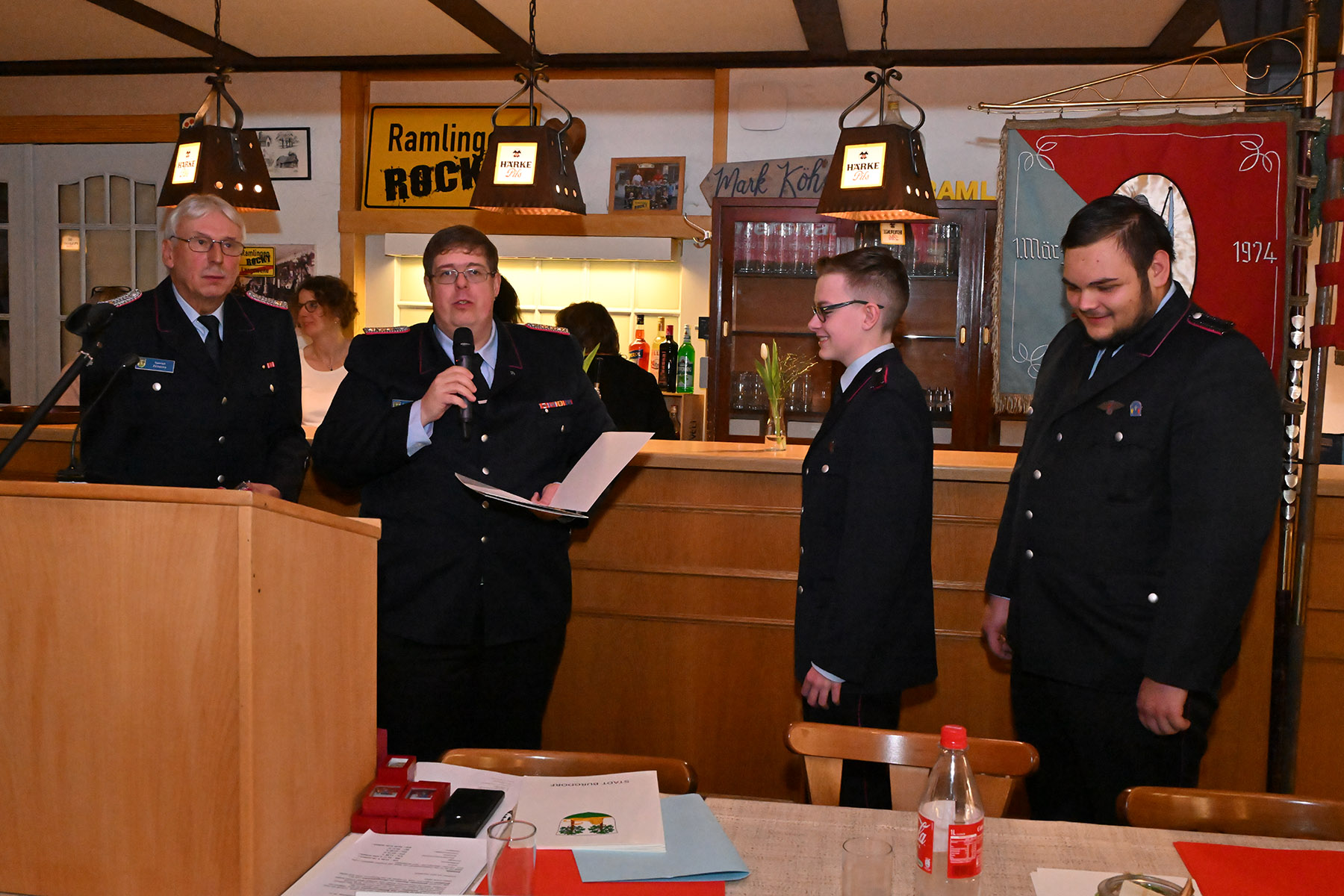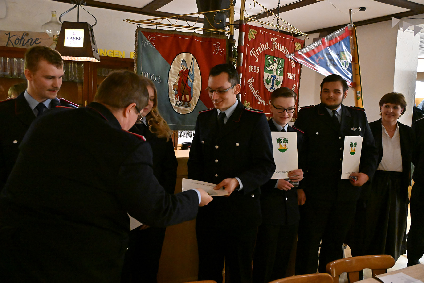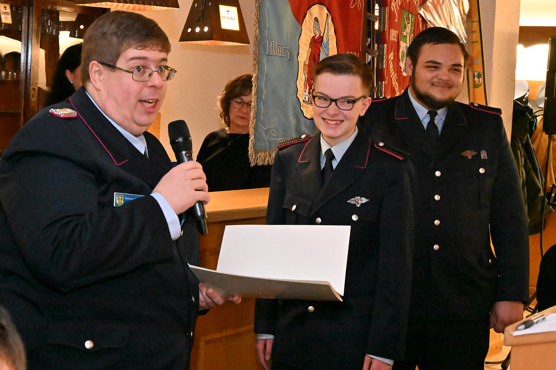 Von den Aktivitäten der Jugendfeuerwehr und Kinderfeuerwehr berichteten deren beider Leiter, Tino Löffler und Chantal Pahl. Beide Nachwuchsabteilungen waren bei vielen Aktionen im vergangenen Jahr dabei. Die Jugendfeuerwehr war so beispielsweise beim UVV-Marsch, bei den Maispielen, den Lichtwochen, dem Zapfenstreich zum Schützenfest, und beim Regionszeltlager dabei. Besonders stolz zeigte sich Tino Löffler, dass Lukas Gottschalk mit der Leistungsspange wie auch der Jugendflamme der Stufe 3 ausgezeichnet wurde.