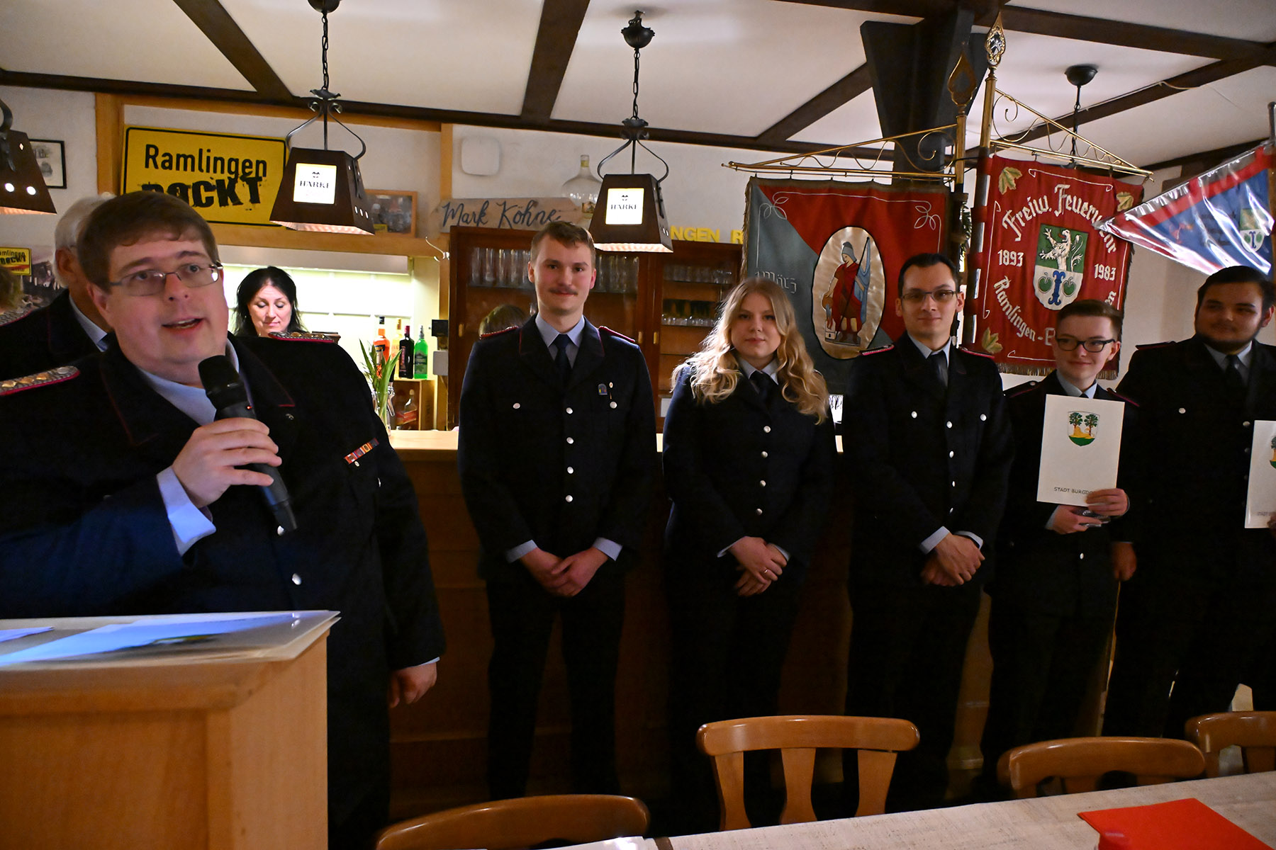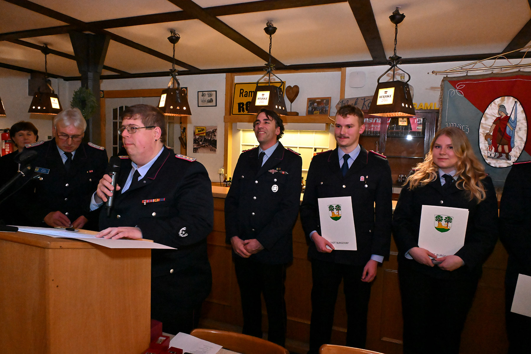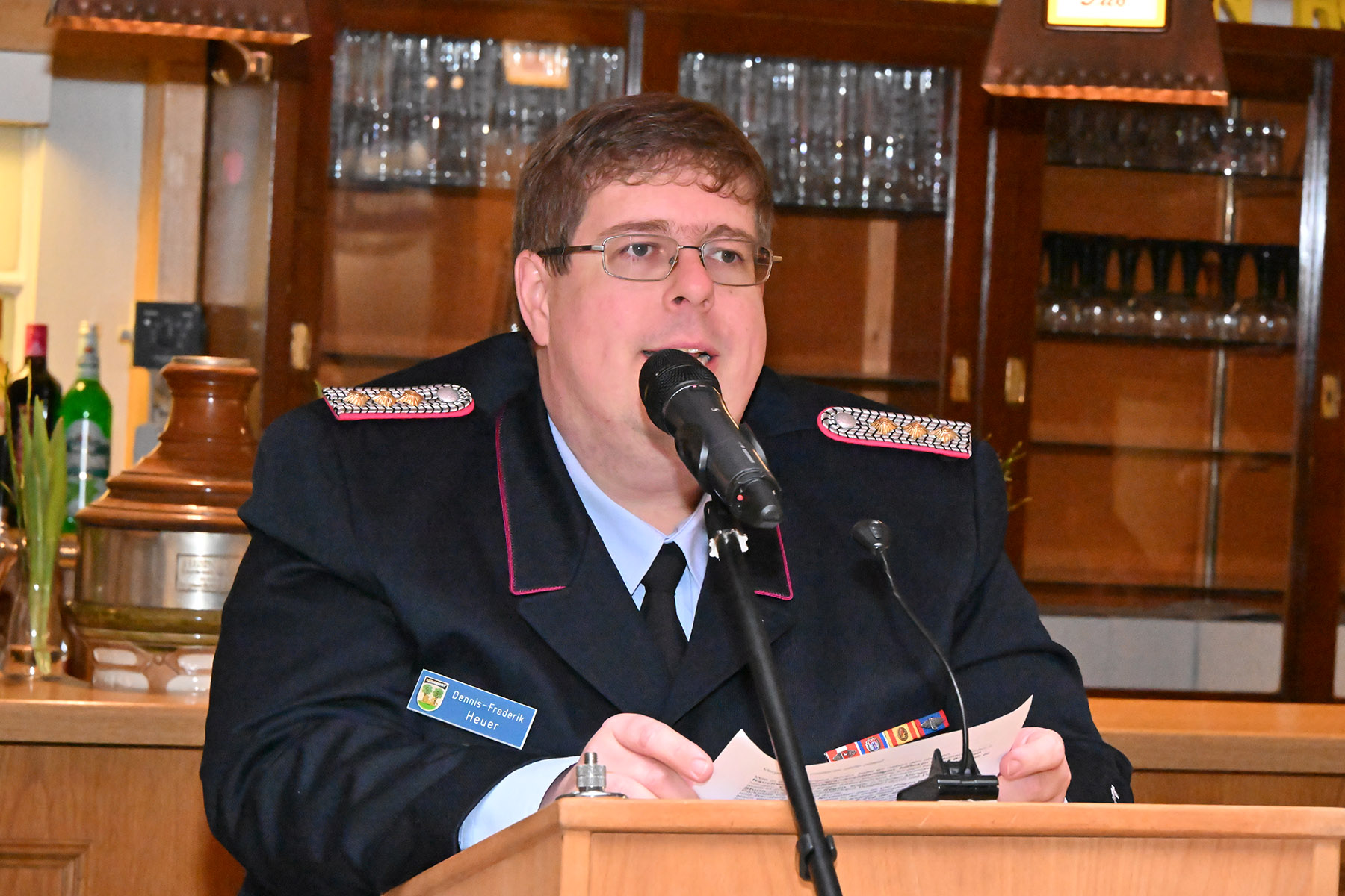 Von den Aktivitäten der Jugendfeuerwehr und Kinderfeuerwehr berichteten deren beider Leiter, Tino Löffler und Chantal Pahl. Beide Nachwuchsabteilungen waren bei vielen Aktionen im vergangenen Jahr dabei. Die Jugendfeuerwehr war so beispielsweise beim UVV-Marsch, bei den Maispielen, den Lichtwochen, dem Zapfenstreich zum Schützenfest, und beim Regionszeltlager dabei. Besonders stolz zeigte sich Tino Löffler, dass Lukas Gottschalk mit der Leistungsspange wie auch der Jugendflamme der Stufe 3 ausgezeichnet wurde.