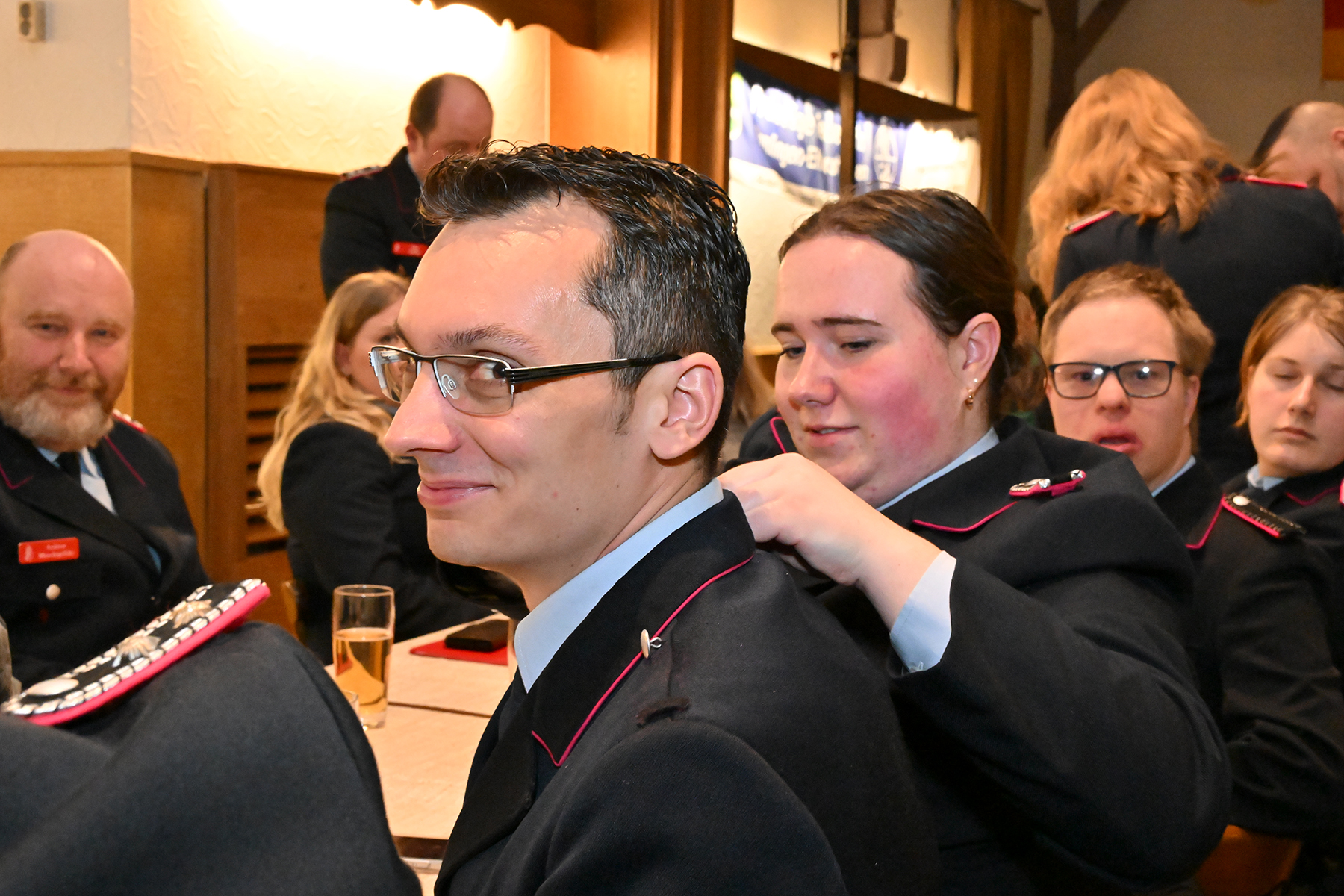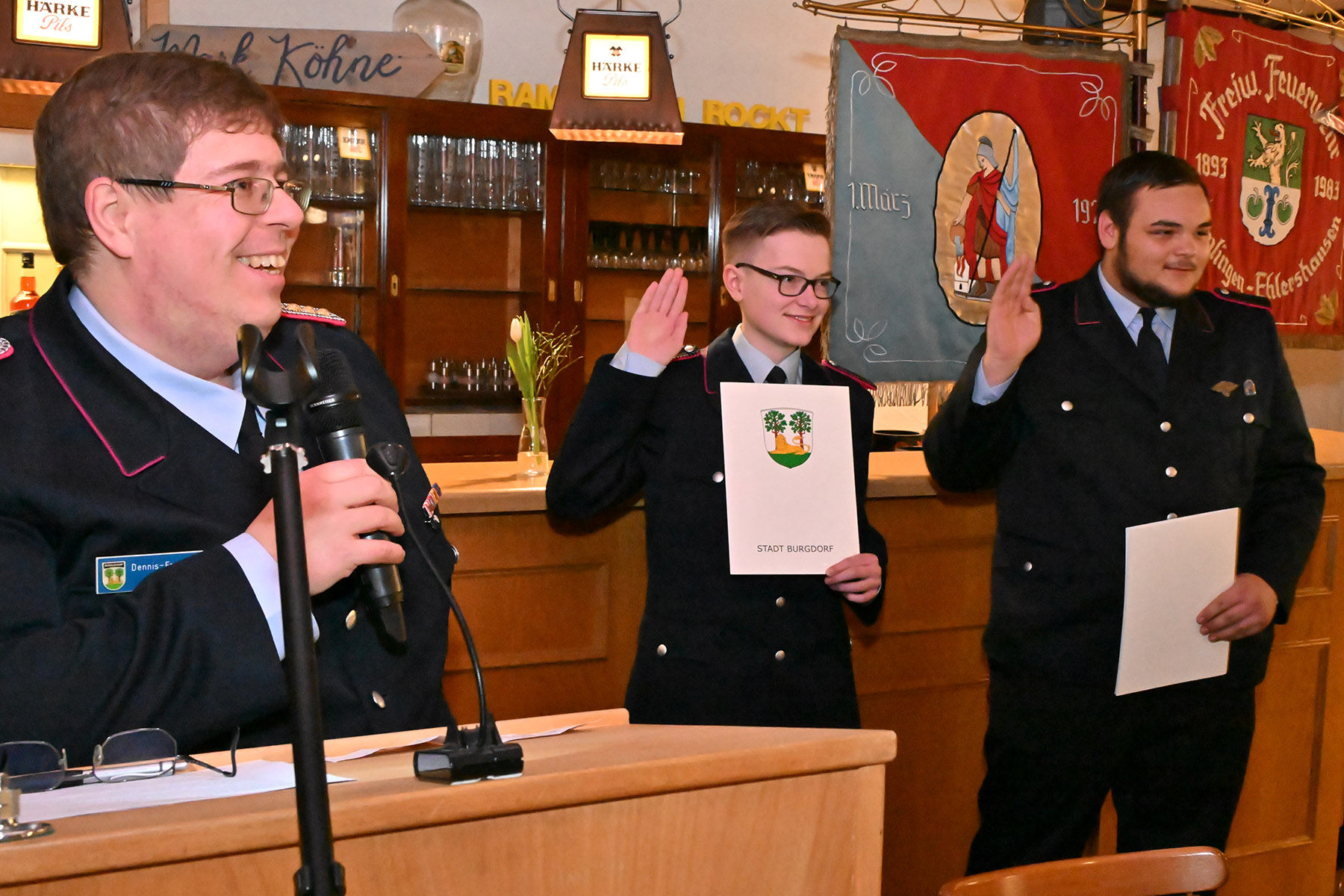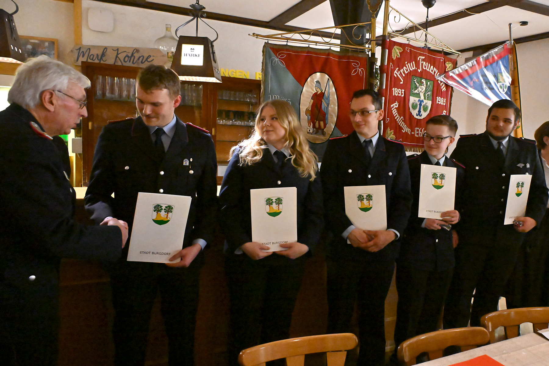 Die Mitglieder besuchten mehr als 40 Ausbildungen und Fortbildungen im vergangenen Jahr. Aufgrund dessen wurden auch wieder neue Dienstgrade verliehen. Jordan Losch und Nico Wöhler haben den 1. Teil der Truppmannausbildung absolviert und erhielten daher den Dienstgrad Feuerwehrmann. Sie legten vor der Versammlung zudem ihren Feuerwehreid ab. Zum Oberfeuerwehrmann wurden Lars Menge und Eike Reinberger-Bruns und zur Oberfeuerwehrfrau Lara Löffler ernannt. Martin Könecke wurde zum 1. Hauptfeuerwehrmann ernannt.