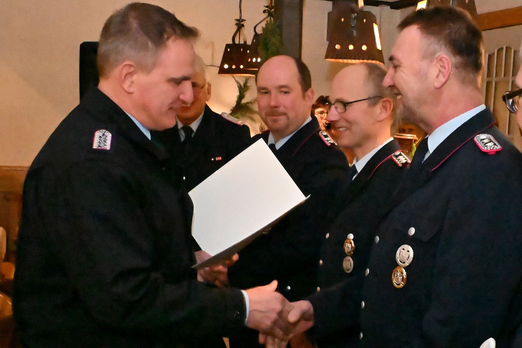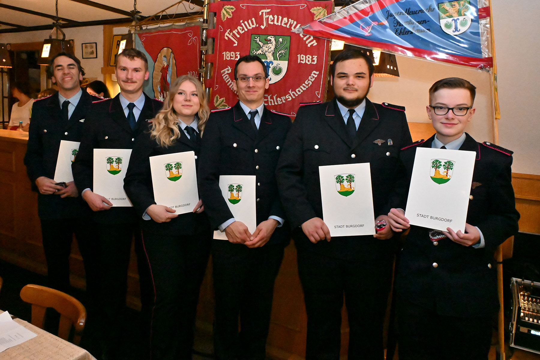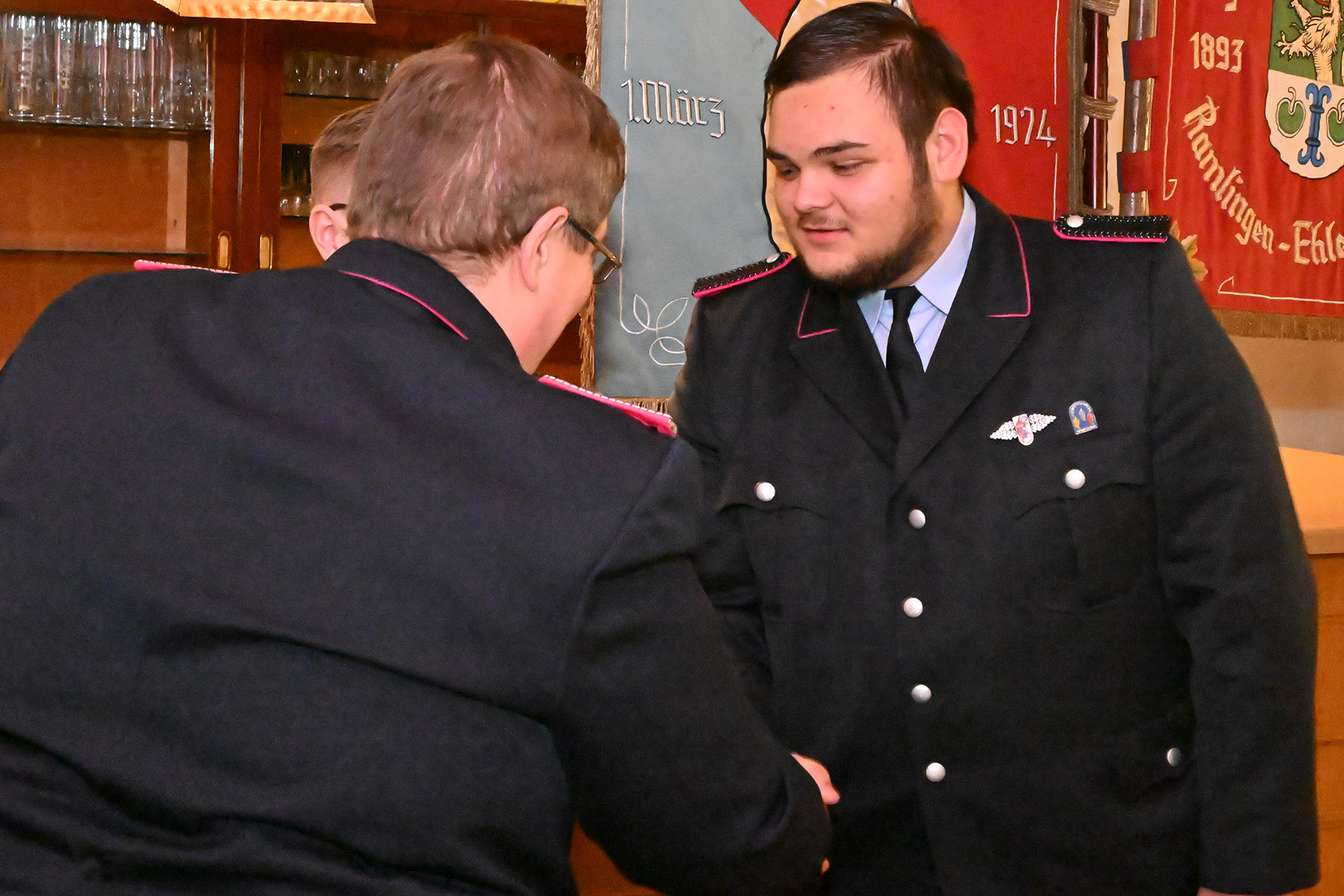 Die Mitglieder besuchten mehr als 40 Ausbildungen und Fortbildungen im vergangenen Jahr. Aufgrund dessen wurden auch wieder neue Dienstgrade verliehen. Jordan Losch und Nico Wöhler haben den 1. Teil der Truppmannausbildung absolviert und erhielten daher den Dienstgrad Feuerwehrmann. Sie legten vor der Versammlung zudem ihren Feuerwehreid ab. Zum Oberfeuerwehrmann wurden Lars Menge und Eike Reinberger-Bruns und zur Oberfeuerwehrfrau Lara Löffler ernannt. Martin Könecke wurde zum 1. Hauptfeuerwehrmann ernannt.